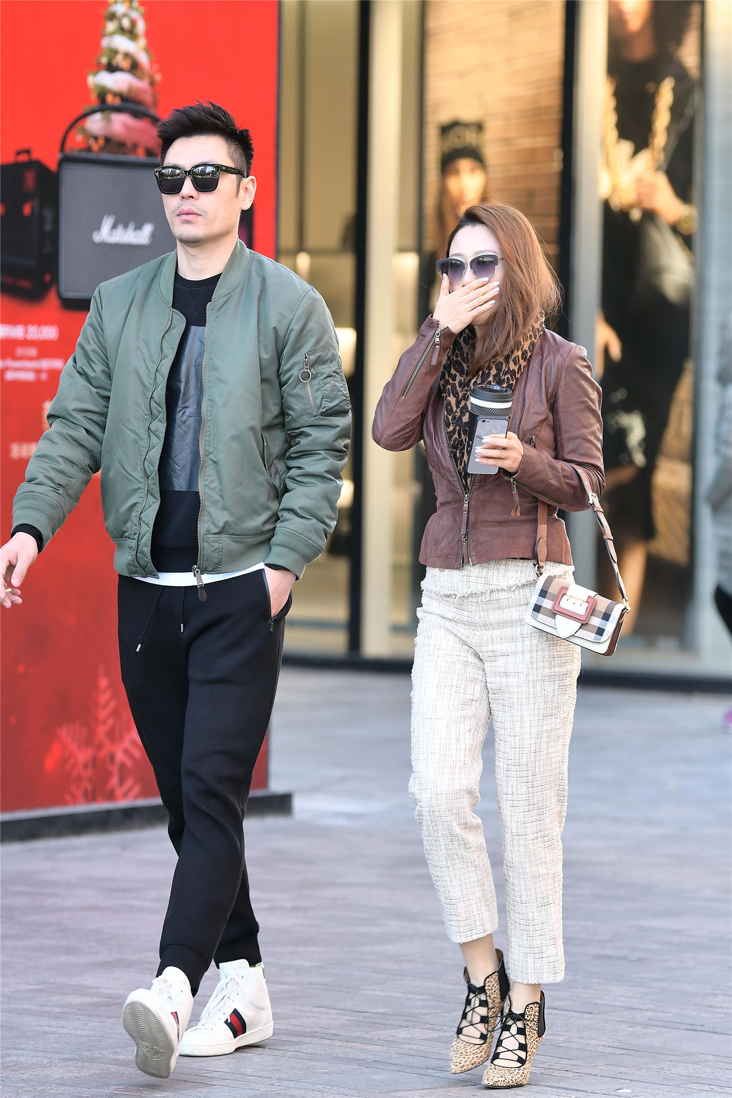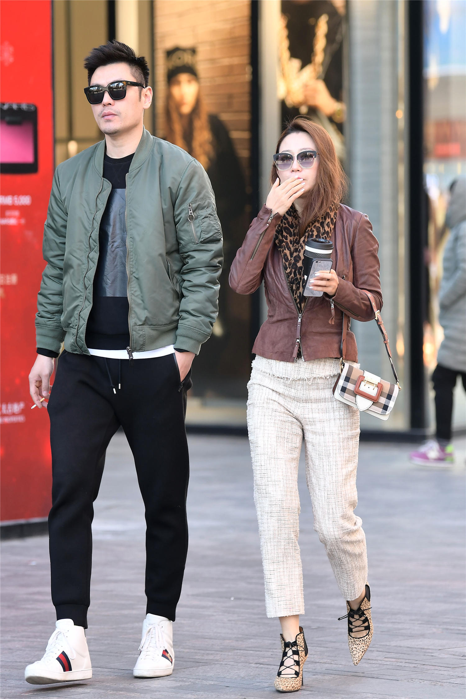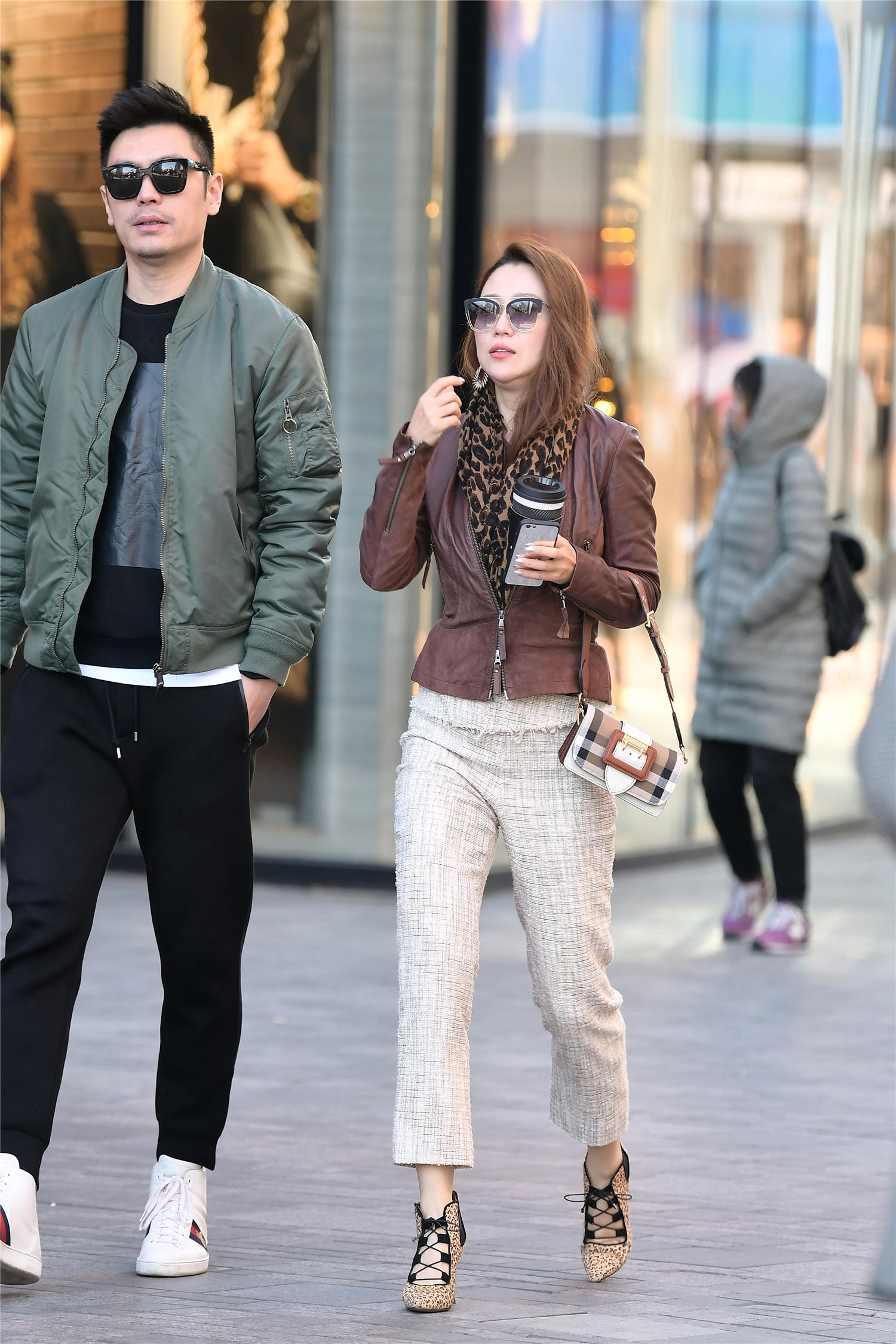 粗呢编织的九分长裤,米白色款式,露出一点小腿,也是更好的展示高跟鞋,非常时尚的效果,也有着显瘦的效果,姑娘很会搭配,一件棕色的皮夹克,短衣襟款式,展示身材比例,而且深浅色的对比,也会更好看,一条围巾搭在脖颈处,其实还是注意保暖的,但是却要适当的秀一下自己。
