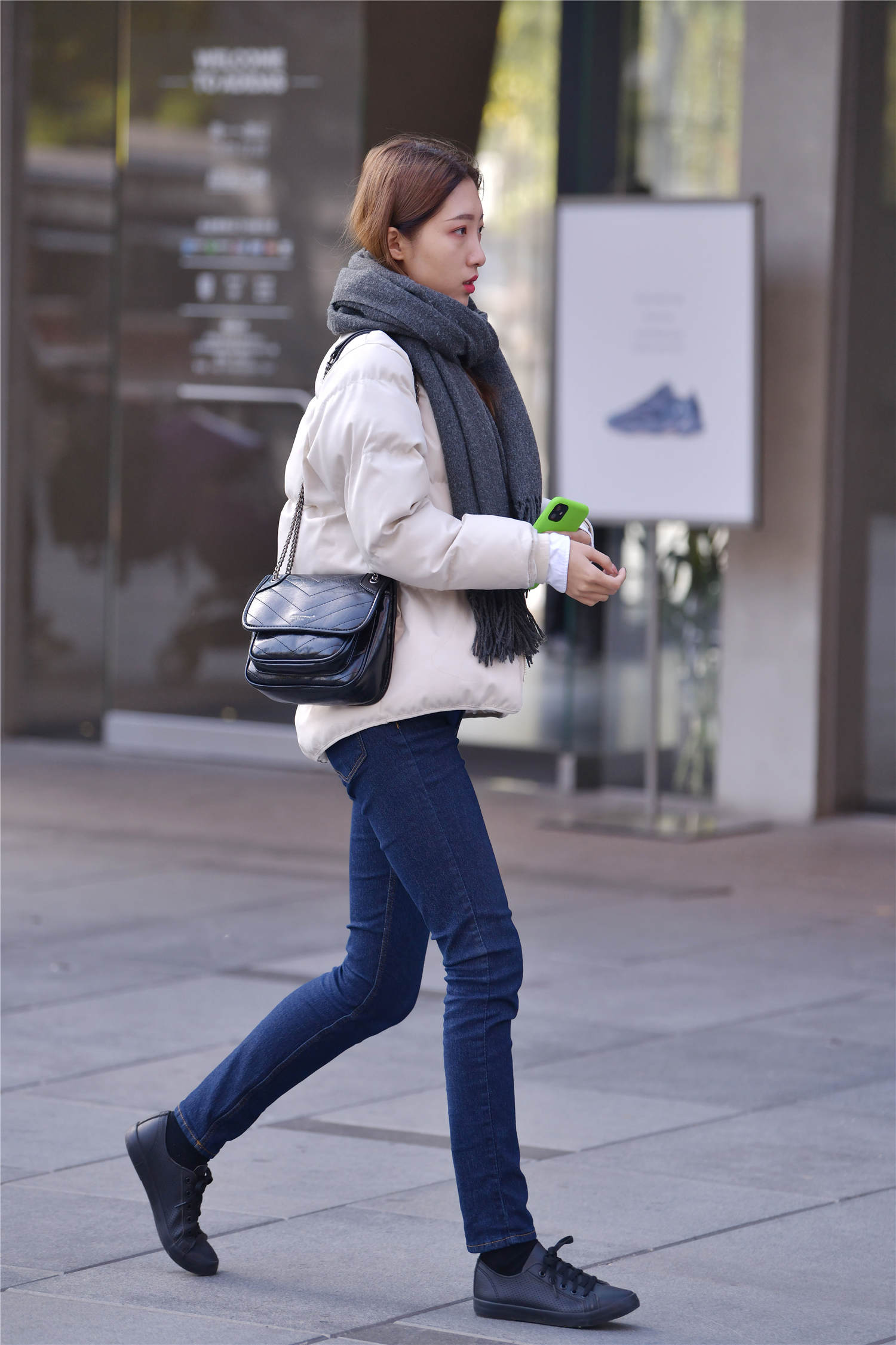 很多时尚姑娘,挑选衣服,想要展现出自己的时尚感觉,到了冬季,穿着羽绒服,要选择长款还是短款,怎么穿出自己的气质?要有自己的想法,现在就看看时尚街区的姑娘是怎么搭配自己的吧,这位美女选择一款米白色的短款羽绒服,一条深灰色的围巾,看着就非常保暖,深蓝色修身牛仔裤搭配一双平底系带鞋,显得非常秀气,也搭配出苗条的效果。