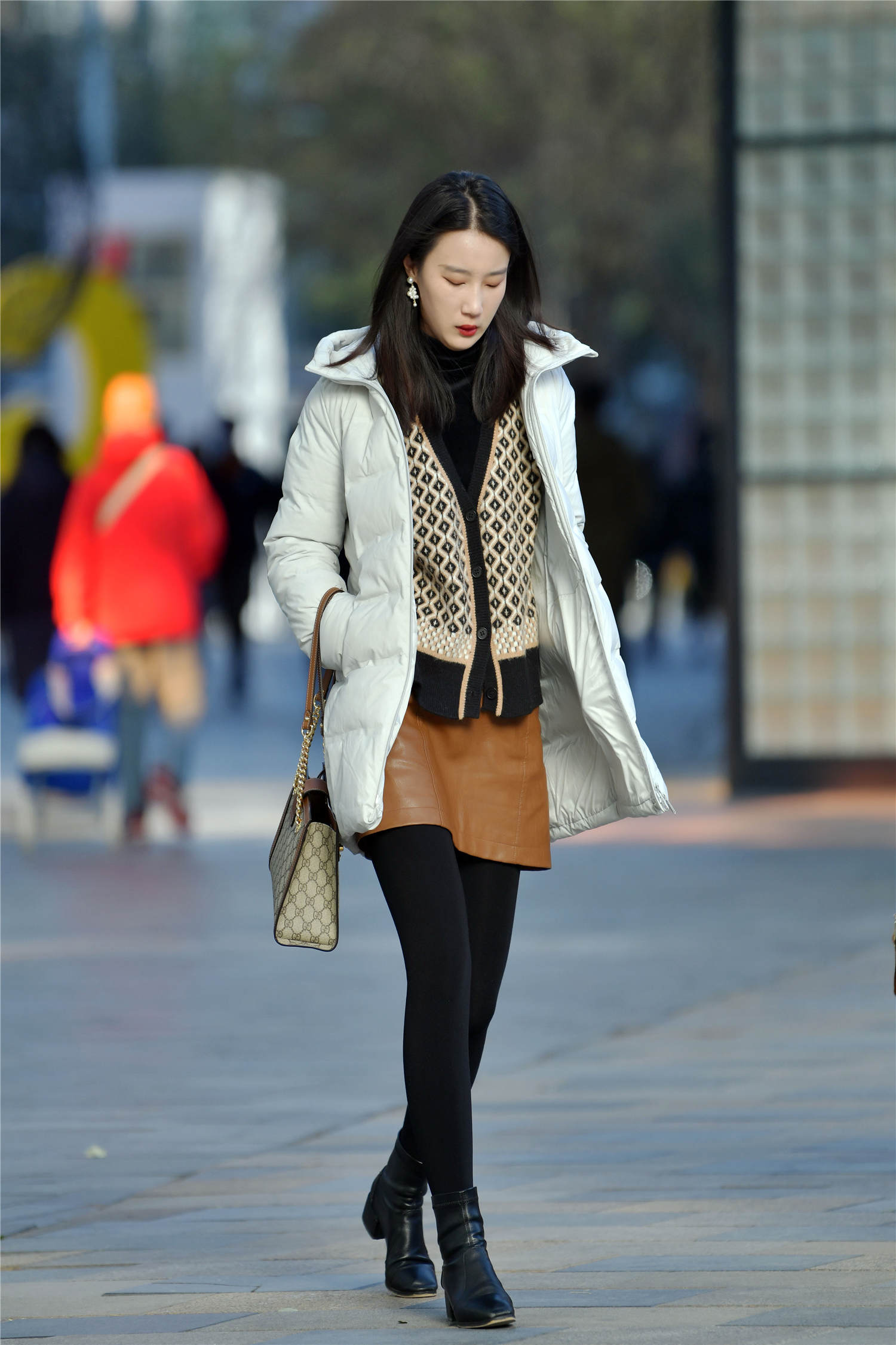 在冬天,想要搭配出保暖效果,又要穿出秀气的感觉,看似很矛盾,但是很多时尚姑娘却可以穿出这样的效果,现在看一下这位美女,选择一款终端款的羽绒服,非常简约的款式,格子针织马甲,高领的黑色衬衣,棕色的皮裙,黑色的打底袜,非常有色彩还很有层次的搭配,也穿出显瘦的效果,脚下一双黑色皮质短靴,非常有质感的穿搭。