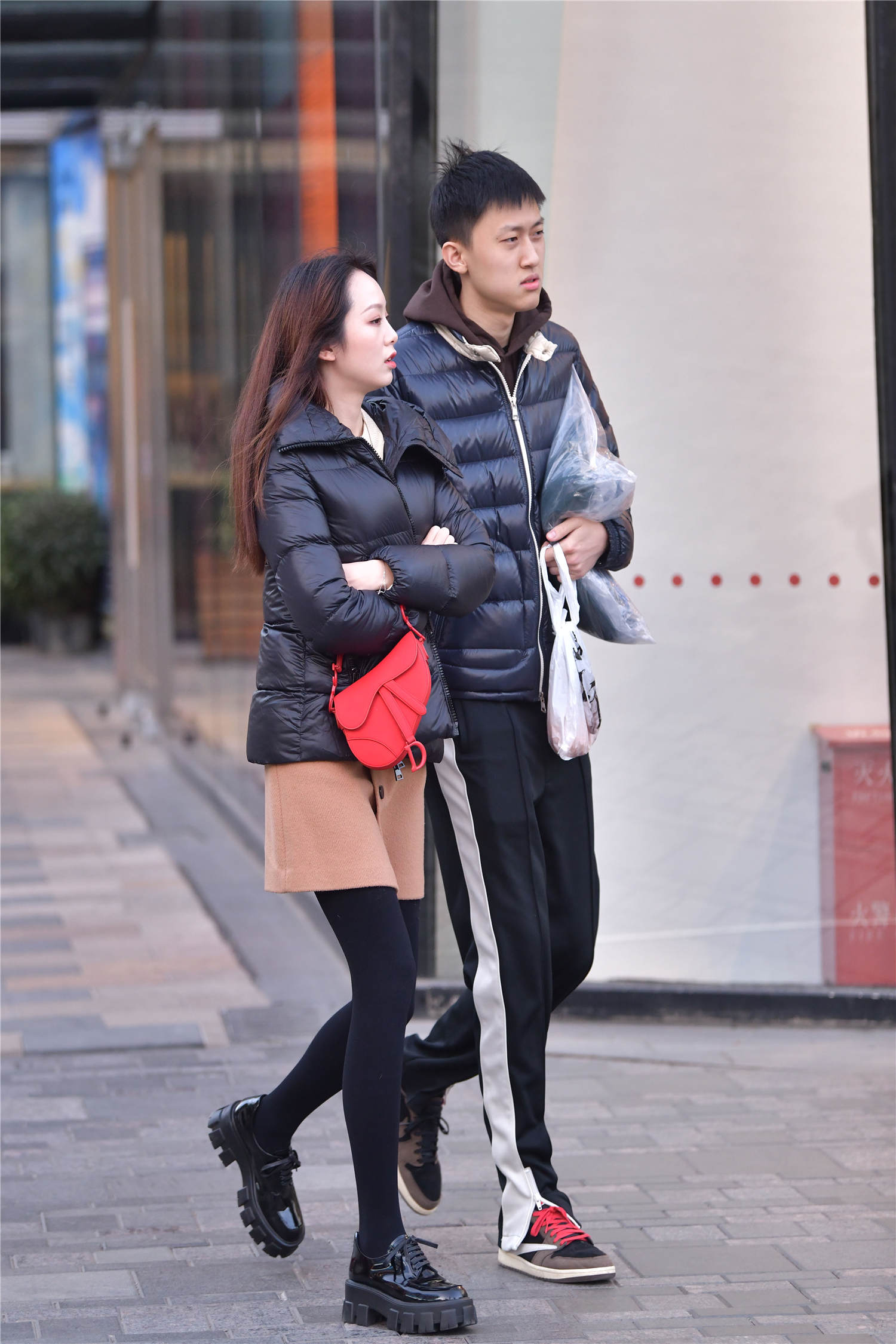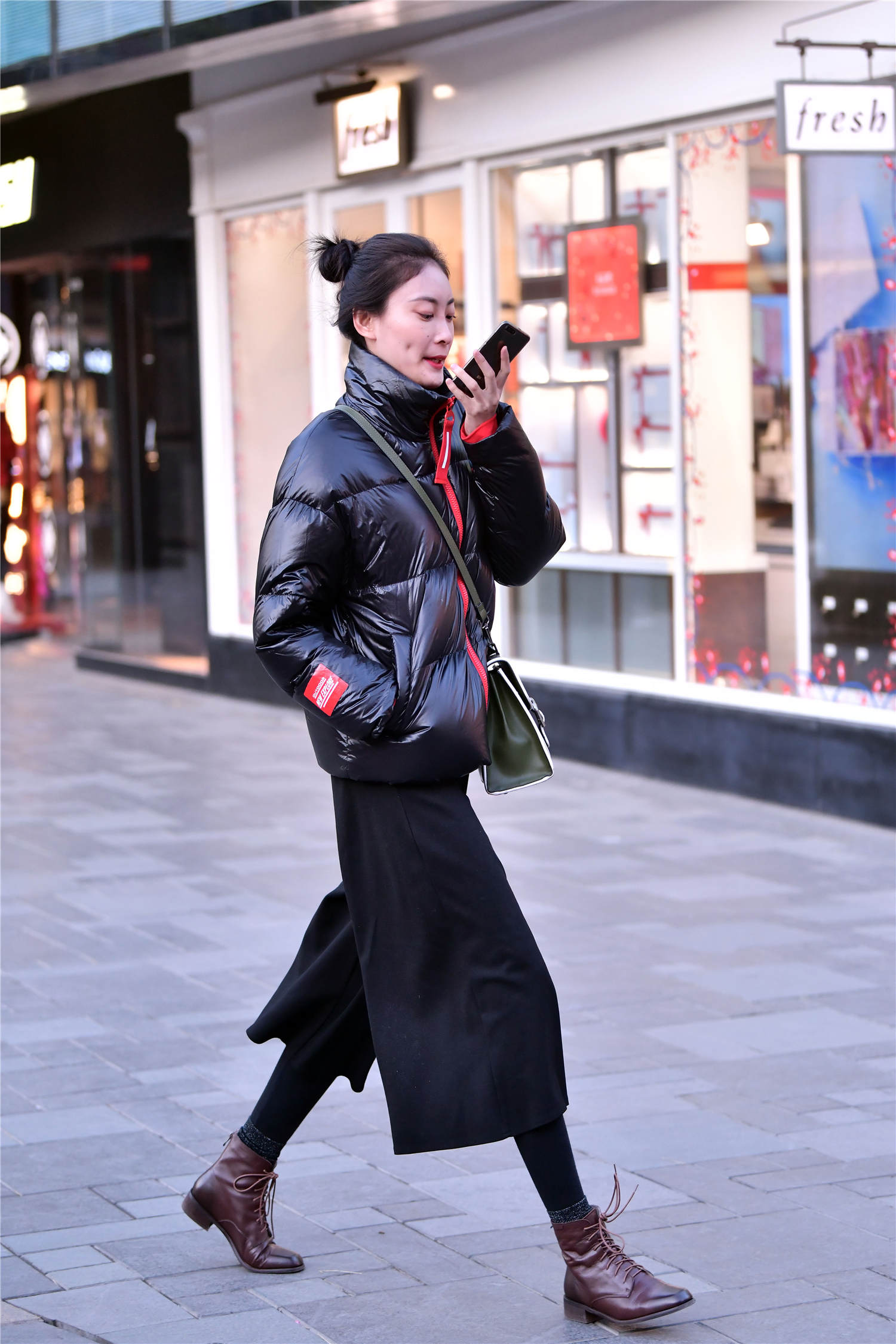 服装搭配组合,才会展现出时尚的感觉,学习搭配,不是按照别人怎么穿,而是借鉴别人的穿搭方法,看一下这位小姐姐,选择一款黑色的短款羽绒服,简单而且还休闲,红色手拎包,增加色彩,驼色的呢子短裙,黑色打底裤,显出姑娘纤细身材,脚下穿着漆皮的厚底皮鞋,显得有些小女生的感觉。