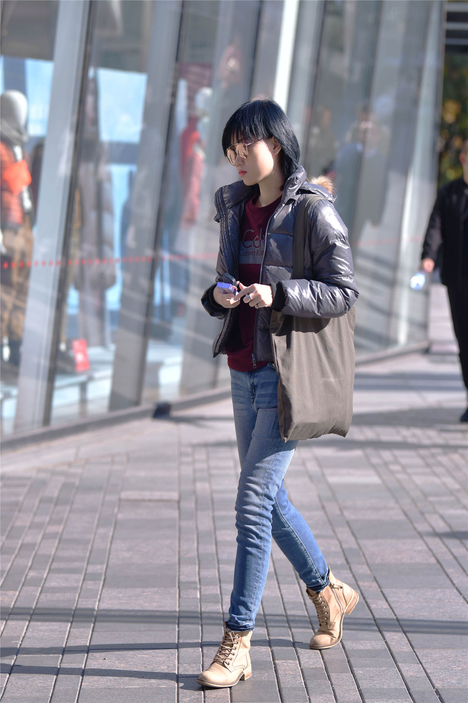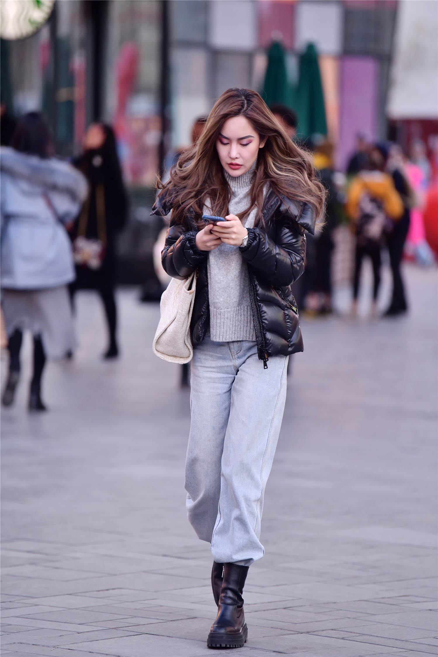 不同的时尚姑娘,喜欢穿出不一样的味道,现在看一下这位带着 一点休闲风格的姑娘搭配,黑色羽绒服,短款的设计,有着小巧的感觉,一件灰色针织高领衫,简单有很好看,浅灰色的直筒牛仔裤,裤脚掖在黑色短靴里面,这样非常个性,也有着休闲效果,还展现出小女生的感觉,秋冬时节这么搭配很有意思。