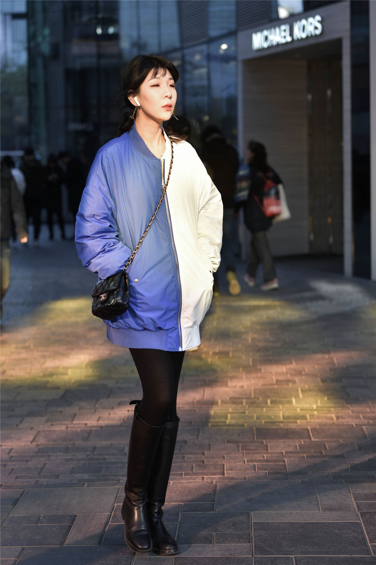 很多时尚姑娘,她们无论选择什么款式的羽绒服,都会想着怎么搭配自己,穿出秀气的感觉,在城市里的姑娘,她们会想办法展示自己,这位小姐姐选择的羽绒服是拼接色,一侧是白色,另一侧是蓝色,有点夹克的效果,而且蓬松的感觉,非常个性,黑色打底裤搭配一双黑色高筒靴,硬质的靴筒,非常好看,也带着一点硬朗的感觉。