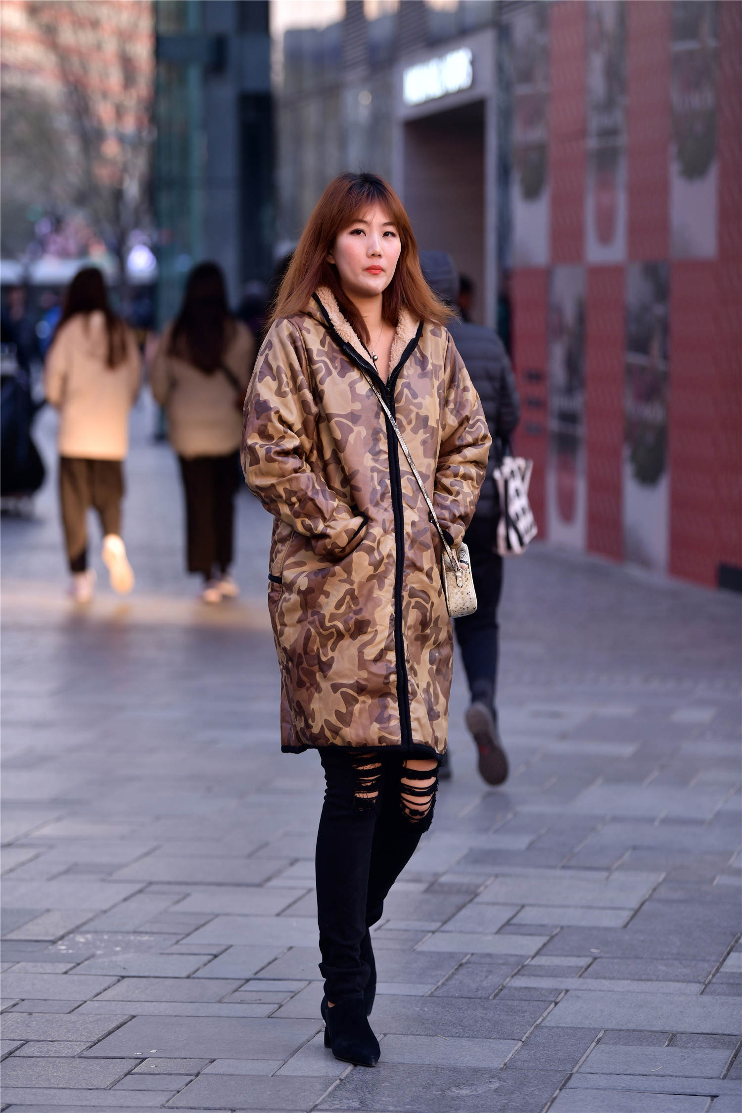 迷彩的中长款羽绒服,简单又非常实用,穿出自己的感觉,保暖效果非常好,这样搭配也会简单很多,一条黑色紧身破洞牛仔裤,增加个性,穿出自己是时尚效果,也看出姑娘是不怕冷的,脚下穿着黑色踝靴,简单都很个性,冬天穿搭,有自己的想法,展示自己的时尚感觉,这才是最好的搭配。