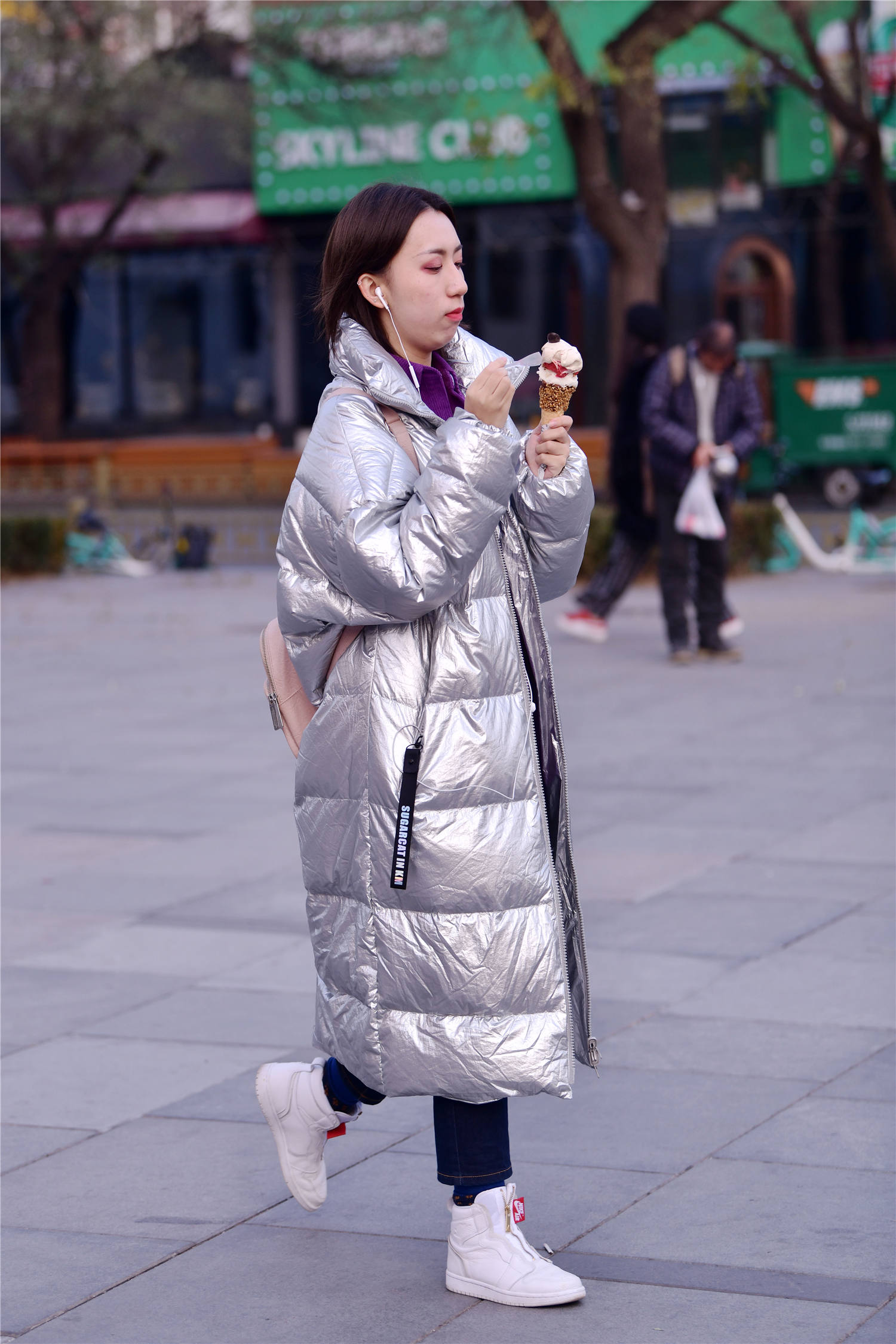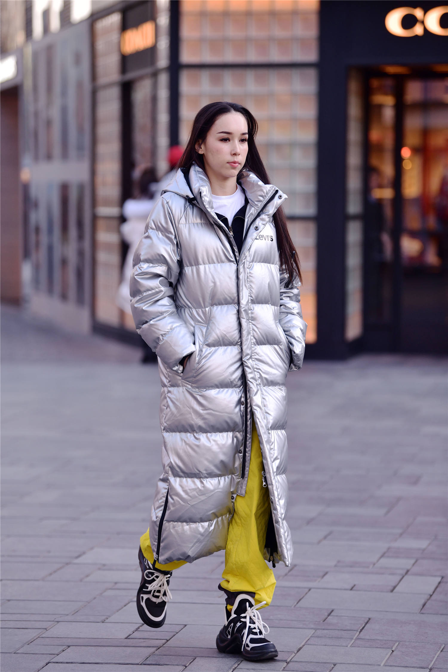 到了冬天,很多时尚姑娘会注意保暖,但是穿的太多了,又会显得臃肿,所以很多姑娘不喜欢在冬季出门,时尚街区也变得冷清了很多,选择长款羽绒服,让你的搭配更加简约,还有着不错的时尚效果,赶紧尝试一下,出来逛街吧,这位姑娘选择一款亮银色的长款羽绒服,不挑身材,搭配长裤,露出一点,脚下一双白色运动鞋,简单有很好看。