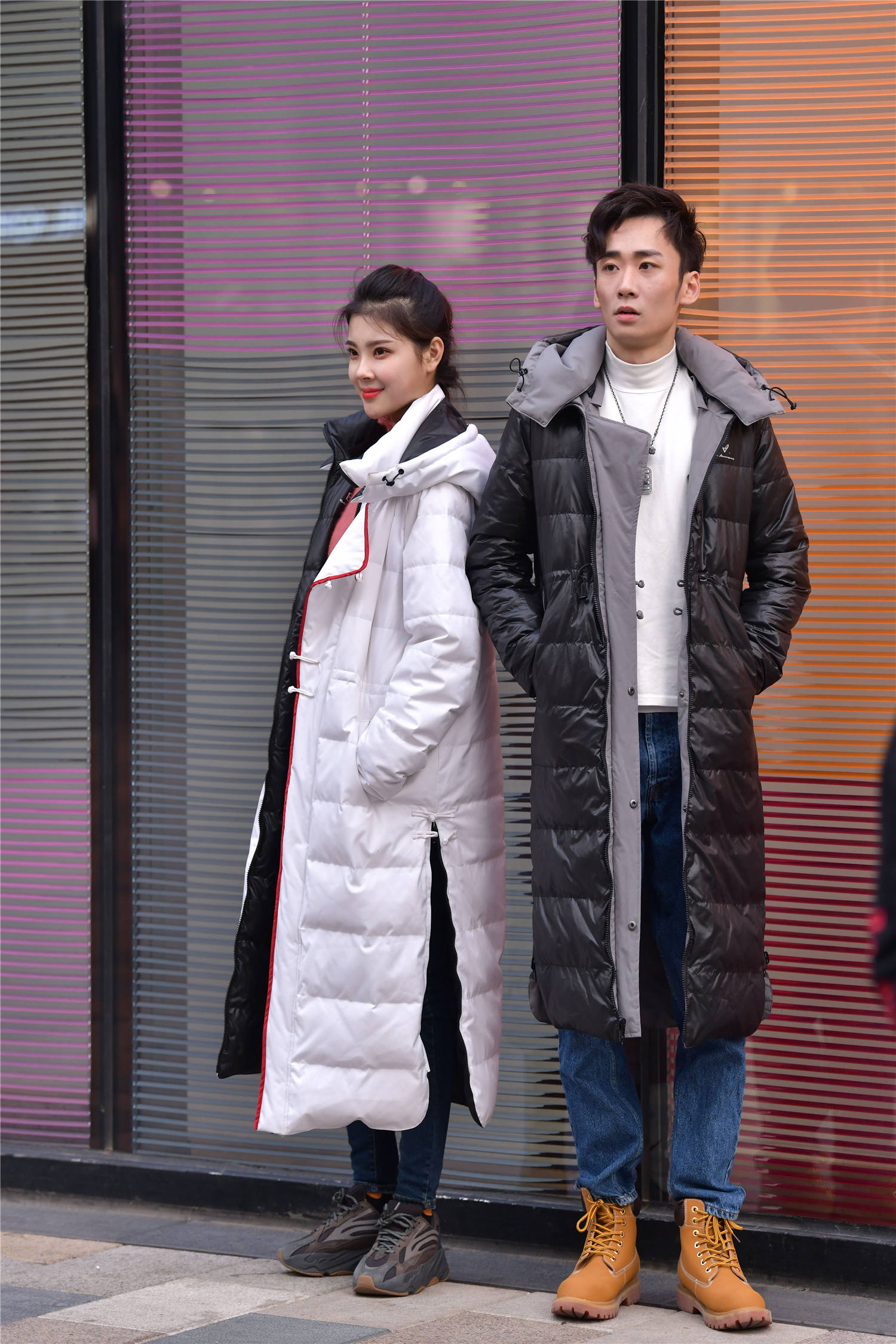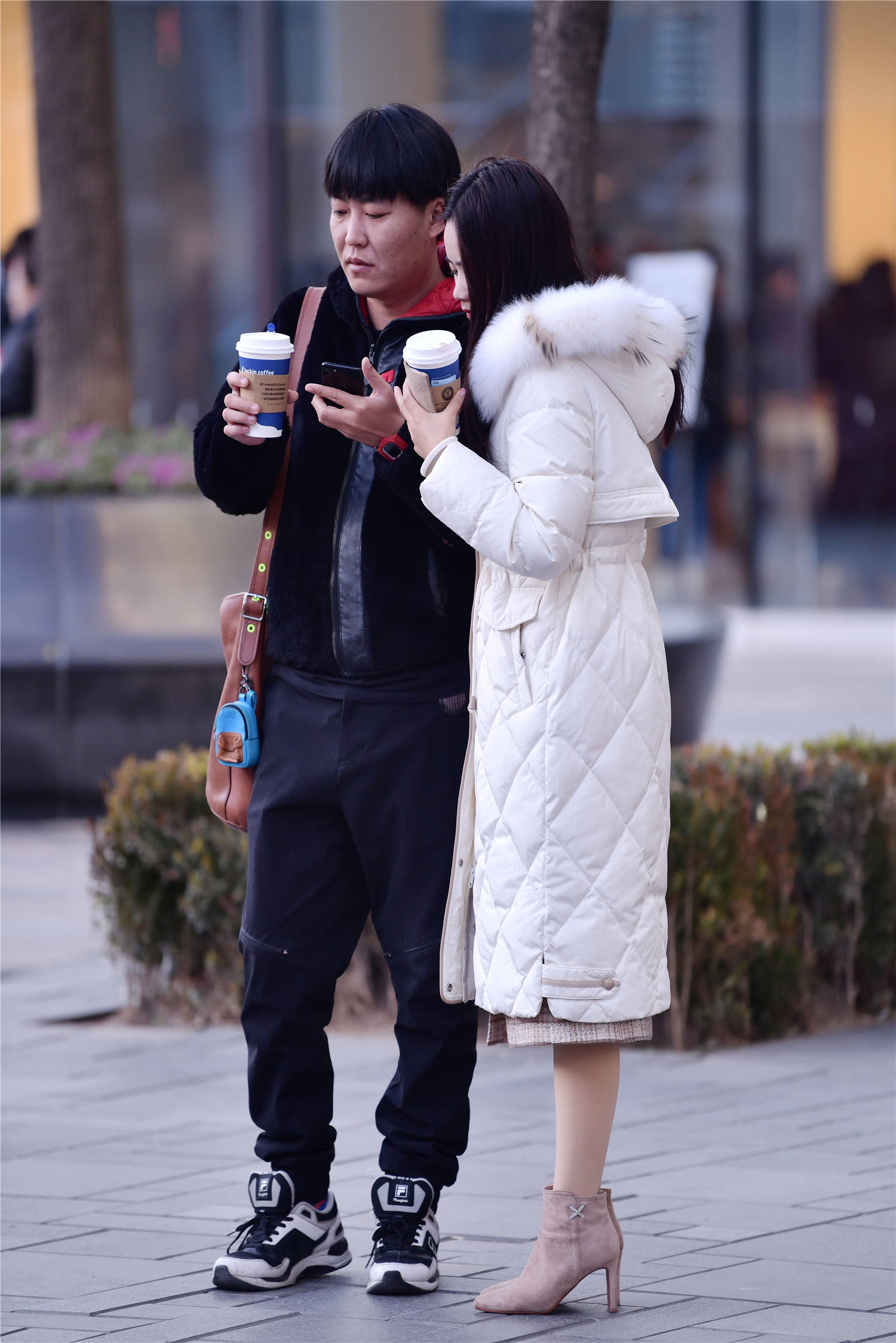 长款羽绒服,无论是男生还是女生,都会穿出很精致的感觉,也会展现出很有意思的效果,看一下这位美女选择一款白色长款羽绒服,侧面开叉拉链设计,根据自己的想法,去设计穿搭效果,衬里是橙色的,露出一点,就很好看,搭配牛仔裤和深色运动鞋,也会展现出很精致的感觉,身边的男生一身黑色长款羽绒服,简单又很好看。