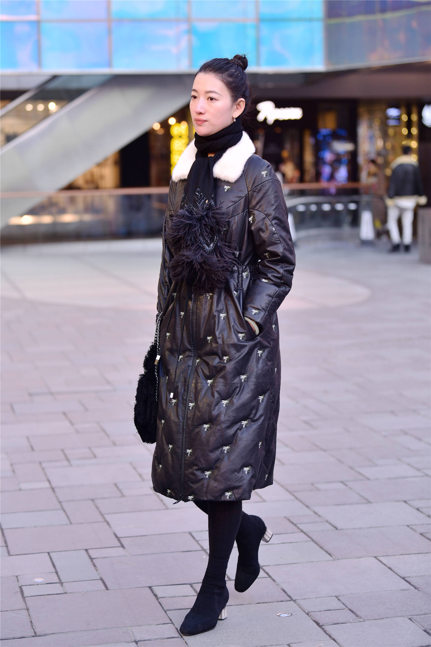 喜欢时尚的姑娘很多,她们想搭配出自己的味道,所以选择的服装,也很好看,就是长款的羽绒服,也要选择一些自己的特点,这位美女选择一款黑色长款羽绒服,上面的蜜蜂刺绣,增加装饰性,还很个性,白色皮草领子,增加色彩,一款黑色围巾,更有着保暖的效果,黑色粗高跟的袜靴,显瘦还有着不错的保暖效果。