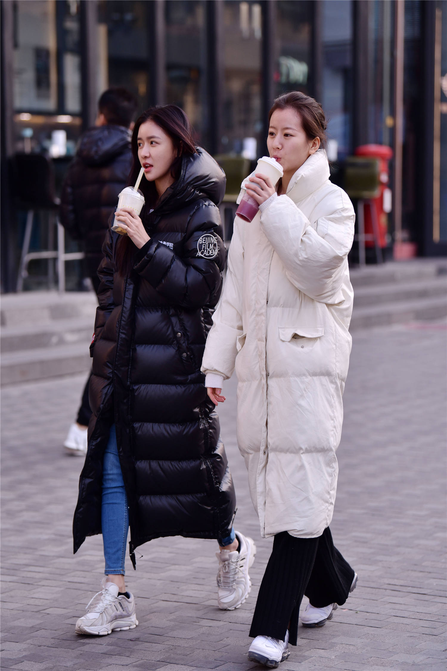 其实冬天逛街,穿着羽绒服,也会很好看,保暖还要穿出个性,看一下这两位姐妹,她们选择长款羽绒服,不同的款式和色彩,又展现出自己的搭配风格,一位穿着米白色长款羽绒服,简单带着一点宽大的效果,黑色西裤搭配一双白色运动鞋,她的姐妹是一款黑色羽绒服,蓬松的感觉很保暖,蓝色紧身牛仔裤搭配一双浅灰色运动鞋,露出一点脚踝,非常显瘦。