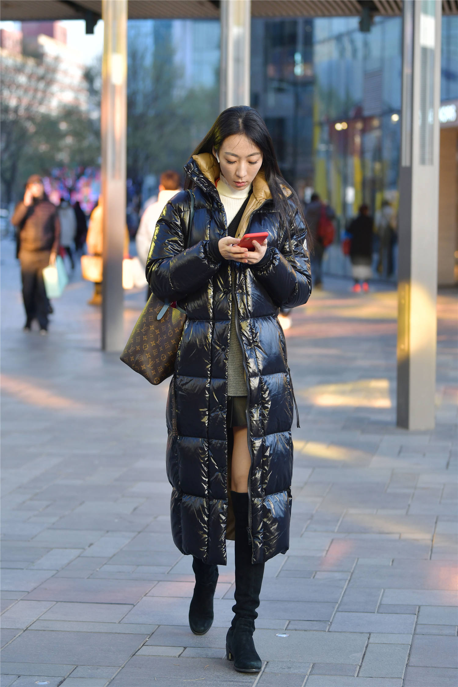 冬季的穿搭,要考验一个人的搭配能力,因为要保暖,所以会选择很多单品,那么怎么搭配出层次感,很重要,看一下这位美女的穿搭,一件黑色长款羽绒服,简单又非常好看,带着一点反光的效果,非常有层次感,搭配黑色长靴,因为前面没把羽绒服拉链拉起来,这样会展示一点内搭,白色高领衫,墨绿色的针织,黑色皮裙,色彩和款式都搭配得很好看。