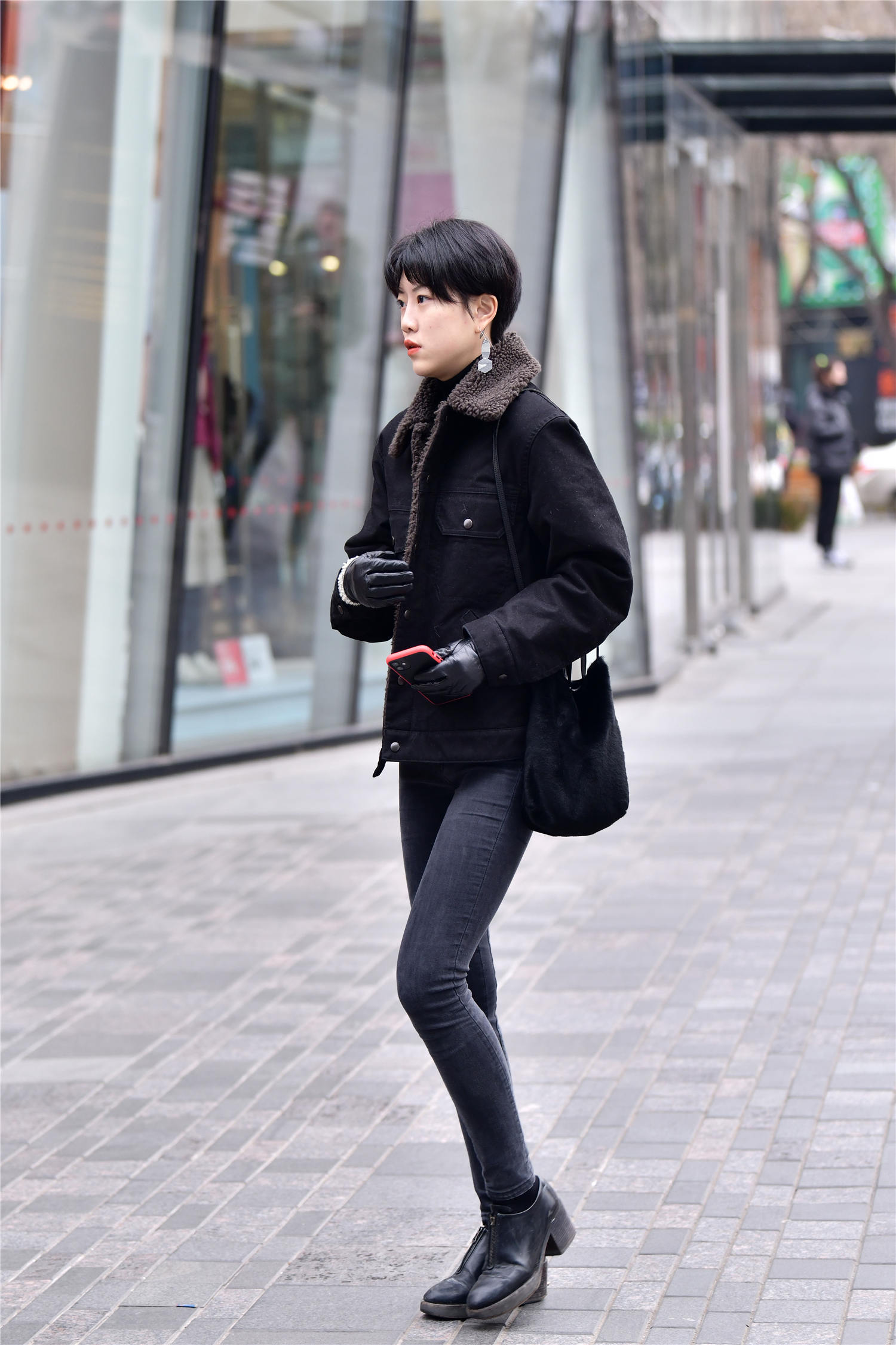 冬天的色彩,对于时尚姑娘来说,有时候就是黑色,她们穿着很有层次的效果,也衬托出自己的时尚感觉,这位美女选择一款黑色粗跟踝靴,搭配黑色牛仔紧身裤,彰显身材曲线,也秀出高挑身姿,黑色的牛仔羊羔毛的夹克,非常保暖,穿着舒适,搭配一头短发,显得精致干练,简简单单的穿搭,在冬天依旧展示出自己的时尚美。