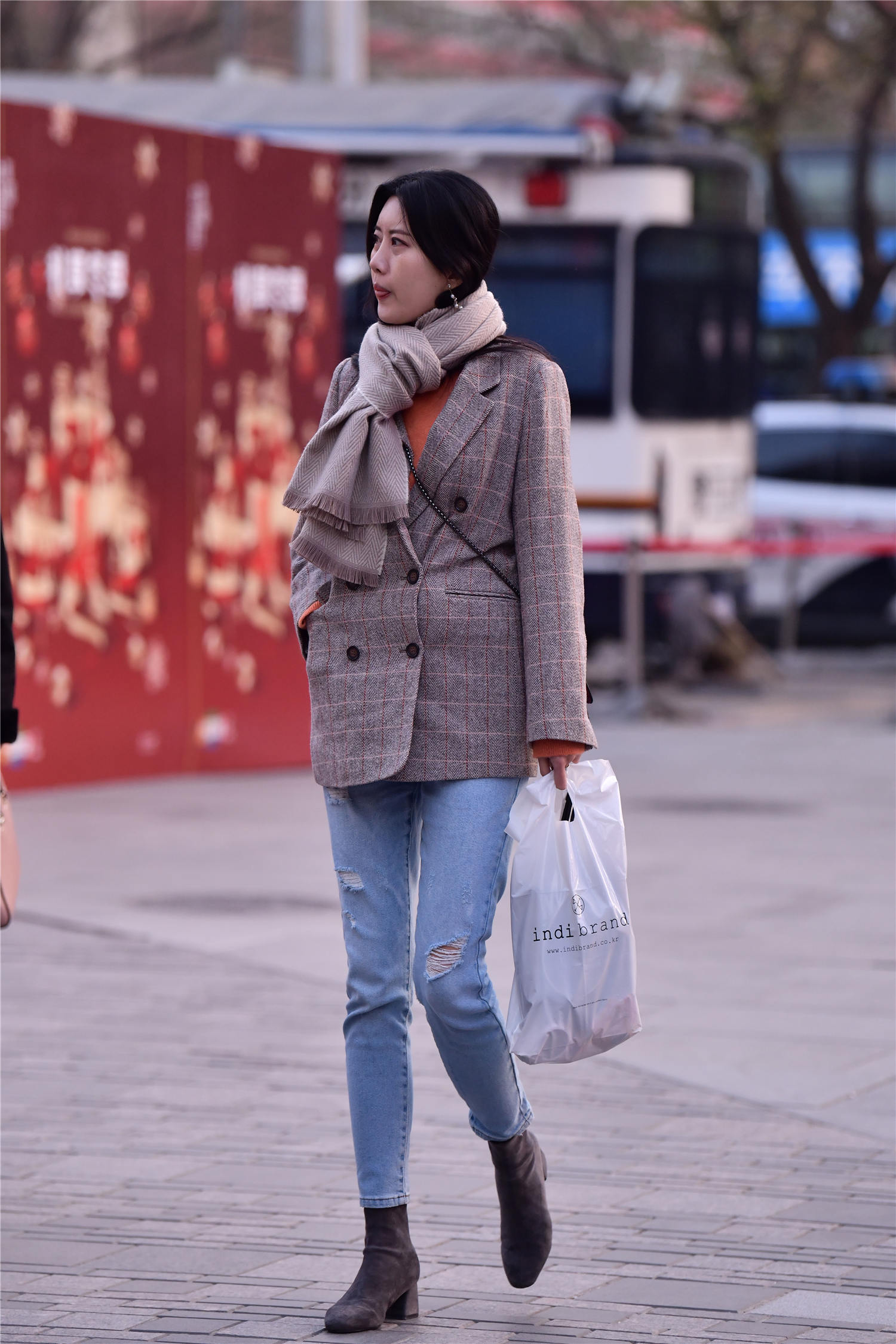 冬天穿搭,要注意保暖,还要穿出自己的味道,对于很多时尚姑娘是考验,这位美女选择一款修身牛仔裤,纠纷的裤脚,简单又很好看,有着破洞的处理,虽然不是很大,却增加个性,裤子也显得很有层次感,搭配一双深灰色的短靴,这样会显得很保暖,灰色格子西服,有着混搭风的展示,一款保暖的围巾,这样就不怕冷了。