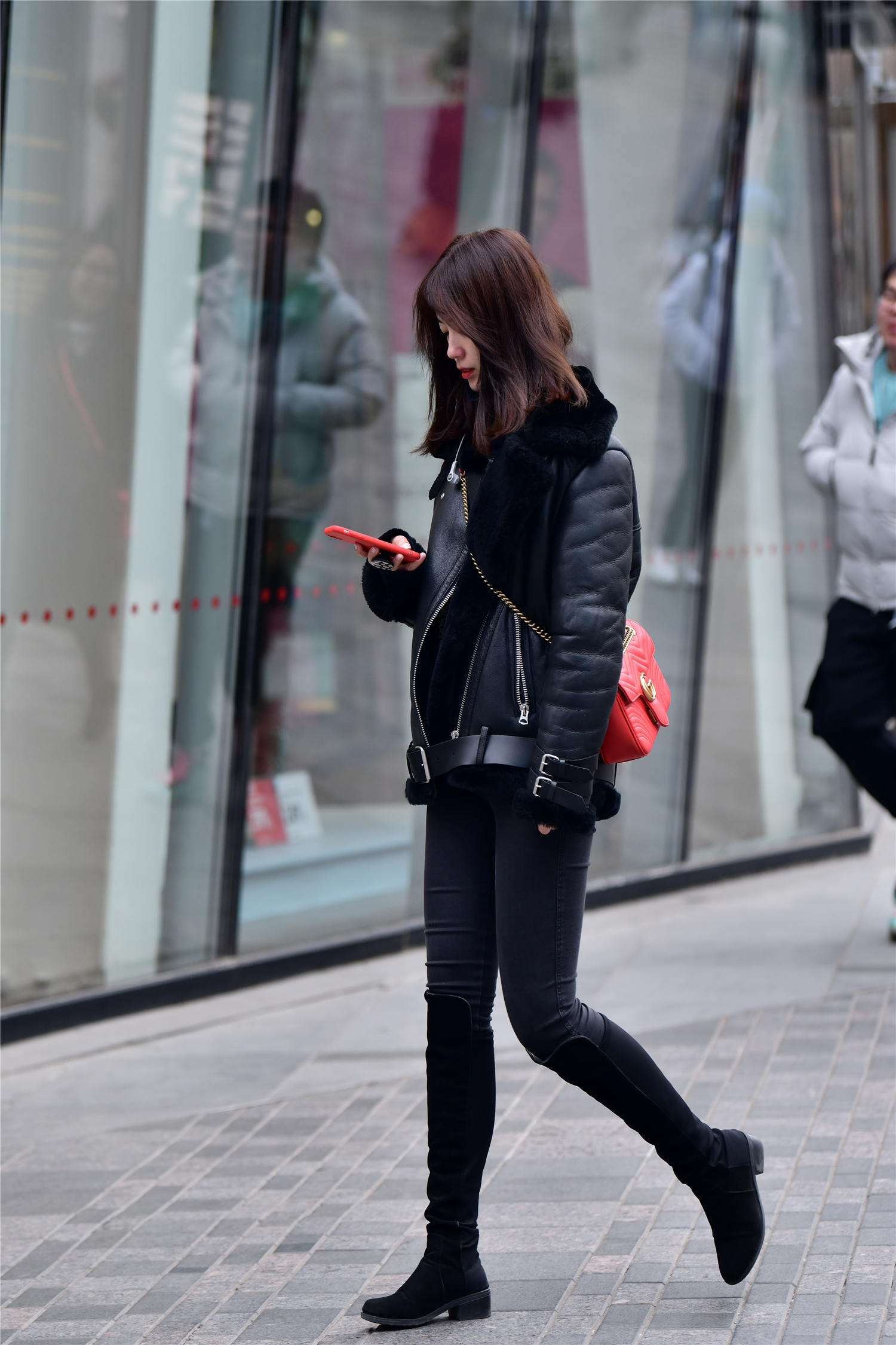 很多人都想穿着保暖,搭配出自己的风格,所以选择的服装也是有着自己的感觉,这位美女选择一款黑色紧身牛仔裤,搭配黑色绒面长靴,稍微有一点色彩差异,这样会增加层次感,一款中长款的黑色皮夹克,内衬羊羔毛,这样看起来厚实有很保暖,穿出精致的时尚味道,冬天的黑色服装,要选择不同的质感,这样也会搭配出层次效果。