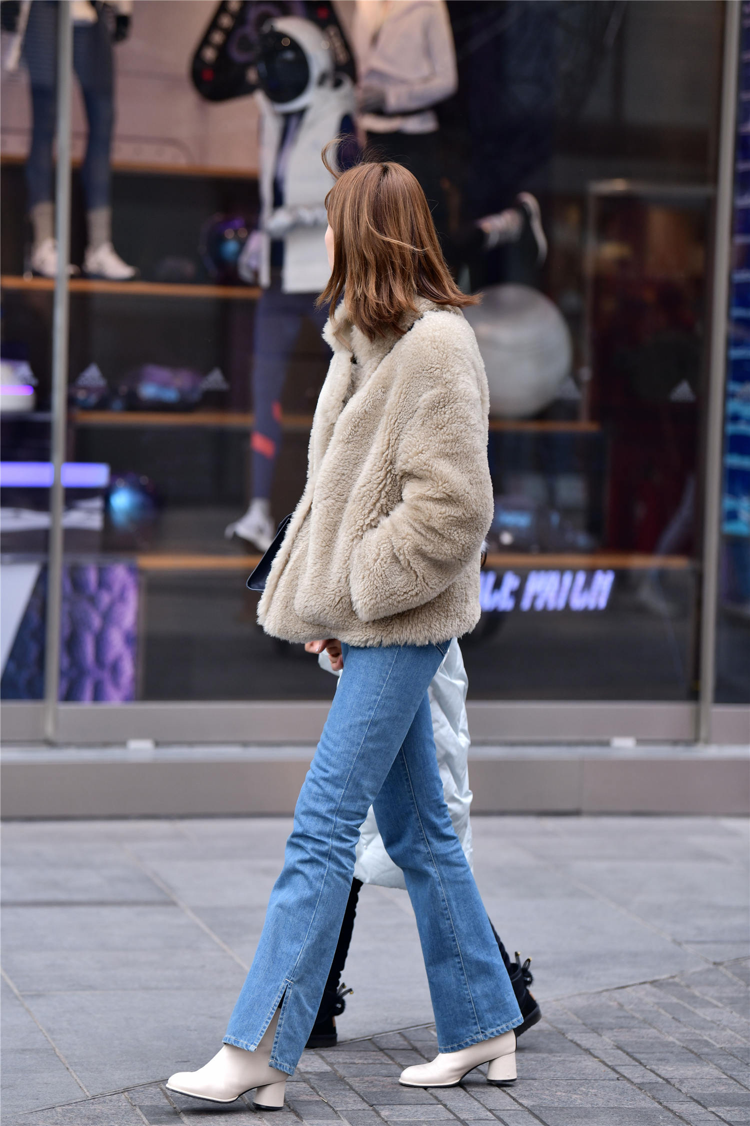 如果有自己喜欢的色彩,可以在冬季搭配尝试一下,可以让自己有一个不一样的逛街过程,这位美女选择一款蓝色的牛仔裤,有点喇叭裤的效果,裤脚开叉处理,增加个性,搭配一双米色高跟短靴,鞋跟不高,很好逛街,也衬托出气质,一款抓绒的短款外套,厚实还有着保暖的效果,也带着一点皮草的效果,好看还很时尚。