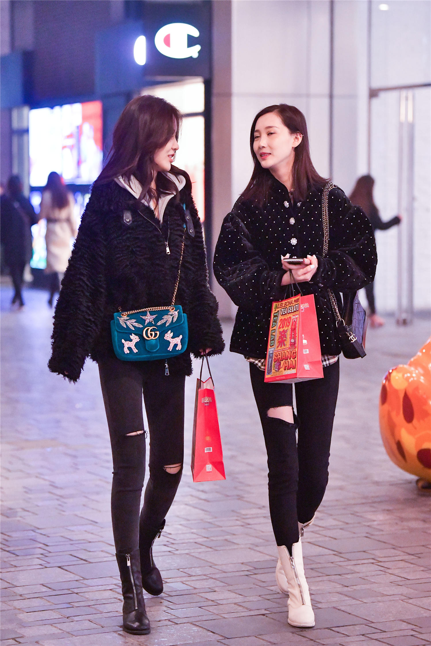 约上闺蜜逛街,也会很好,而且会有着相同的搭配风格,这两位美女选紧身牛仔裤,带着破洞会增加个性,而且她们的破洞不一样,这样又会各自有着自己的特点,同款的拉链短靴,一位选择黑色,一位选择白色,这样也会搭配出差异化,让你感受不同色彩之间的搭配,还都很显身材的效果。