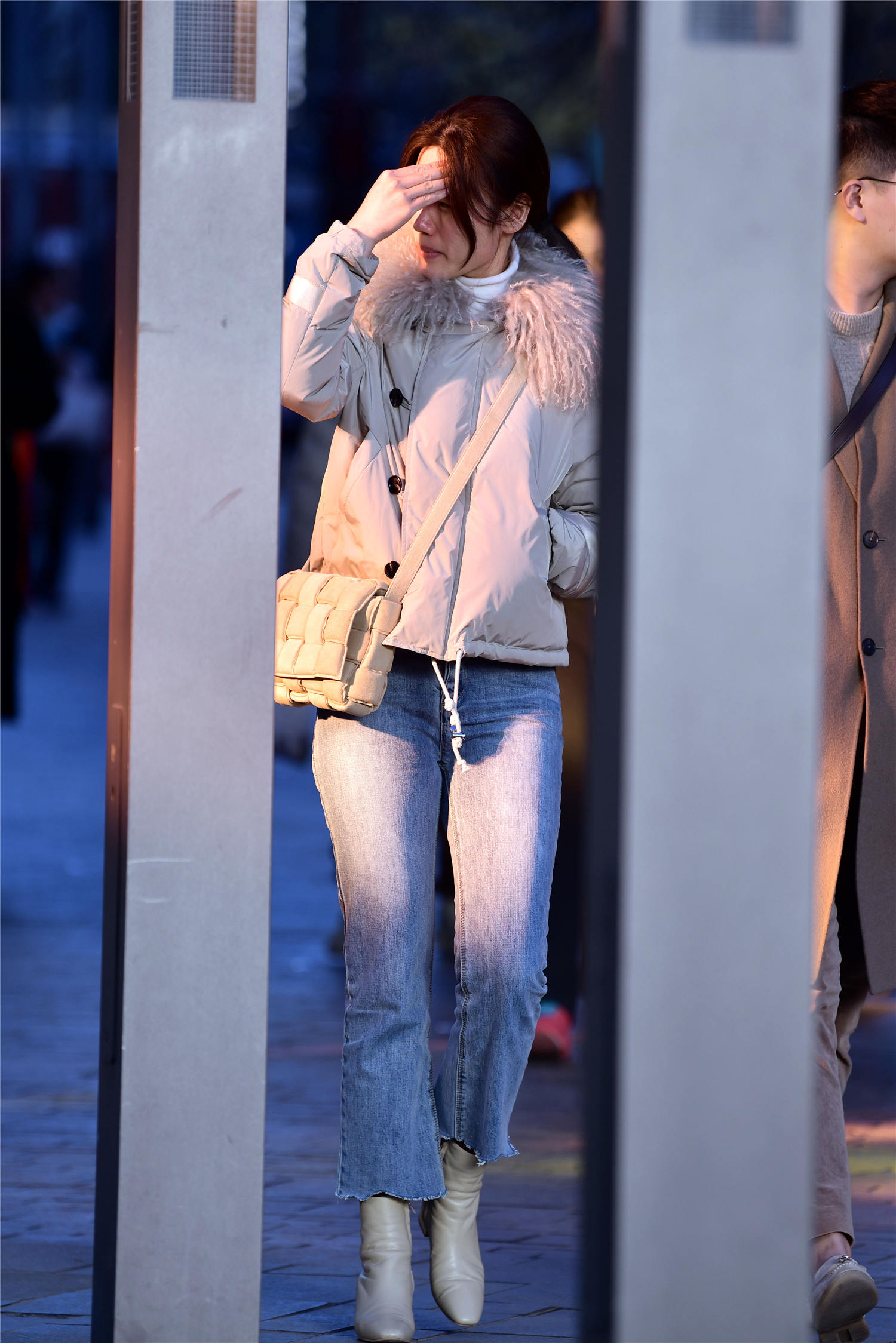 在冬天也可以搭配直筒牛仔裤,虽然黑色穿的人很多,但是浅色系会有着不一样的感觉,这位姑娘选择浅蓝色的直筒牛仔裤,九分的裤脚,好像是自己裁剪的,露出脚下的米白色高跟短靴,展现出显秀气的效果,有着显瘦的感觉,一款短款的羽绒服,非常简单,一身浅色系搭配,冬季里看着也会很好看。