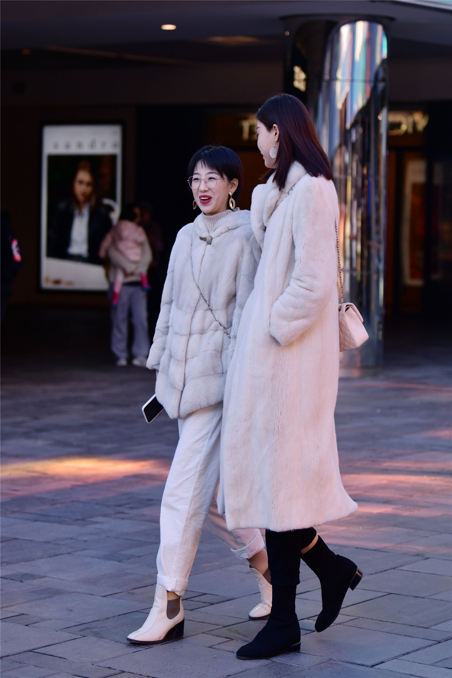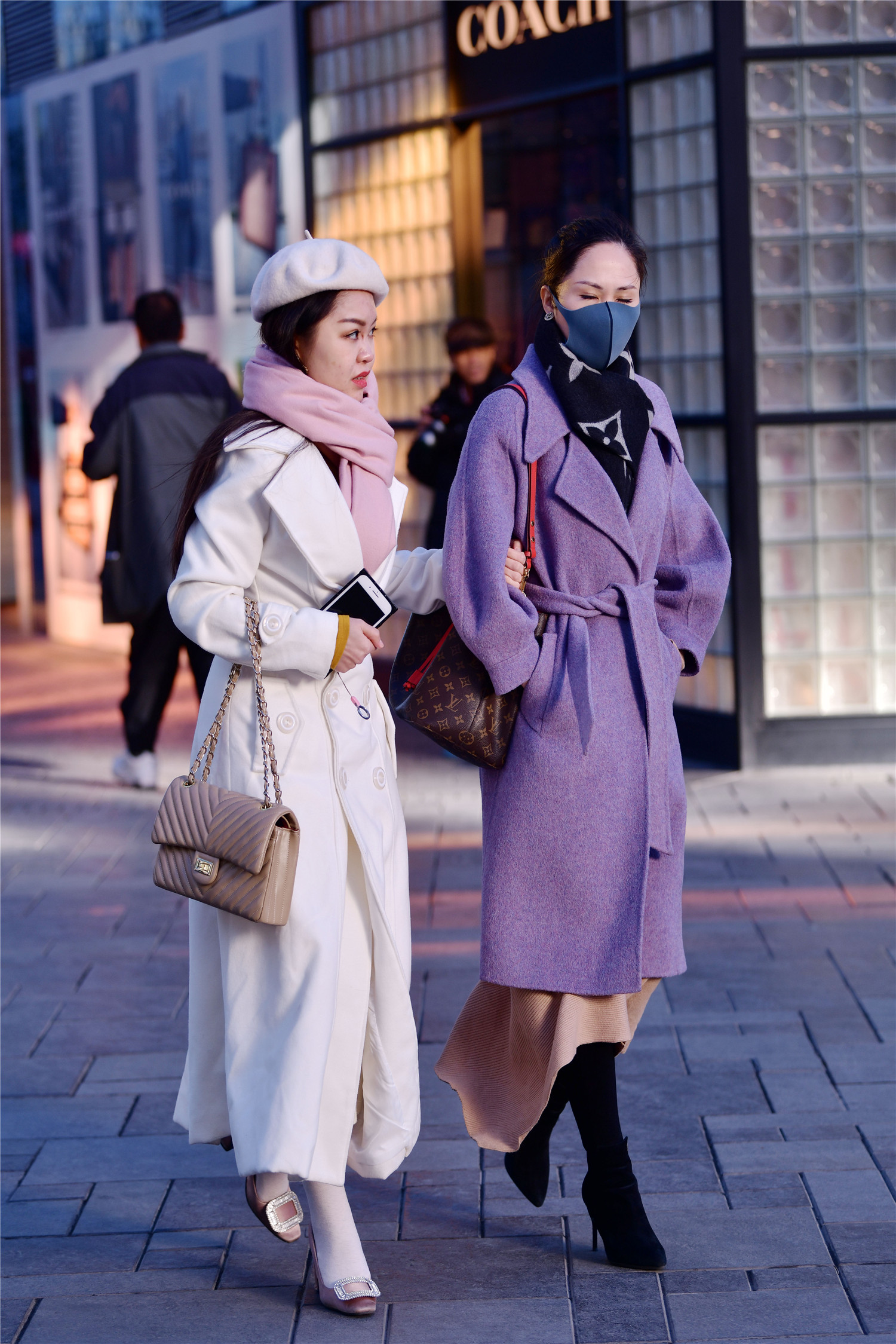 有闺蜜一起逛街,选择大衣搭配,有选择不同款式,这样搭配出不一样的味道,看一下这两位美女的搭配,一位选择白色长款大衣,搭配浅粉色的围巾,一顶米白色帽子,显得非常精致,白色打底袜搭配一双浅色高跟鞋,让人看着很精致,她的姐妹是一款紫罗兰的中长款大衣,搭配米色长裙,黑色打底袜搭配一双尖头细跟短靴,衬托身材高挑。