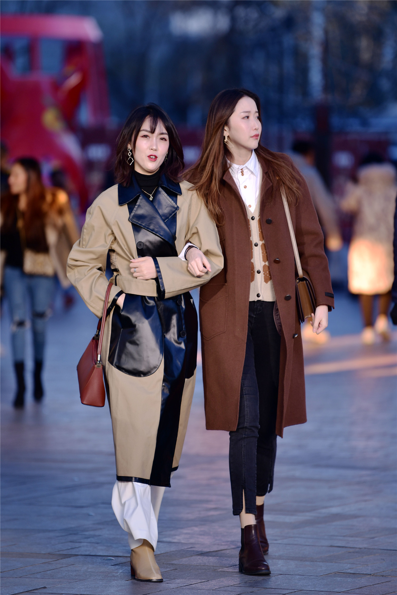 有着喜欢大衣的闺蜜,这样一起逛街,搭配出不一样的味道,这两位小姐姐,一位穿着棕色大衣,及膝的长度,里面是白衬衣搭配米色马甲,黑色七分裤搭配一双黑色短靴,简单都很休闲的穿搭,她的姐妹穿着一款卡其色的大衣,和黑色皮质拼接在一起,这样会非常有层次感,白色长裤搭配一双灰色短靴,色彩也是很简单的。