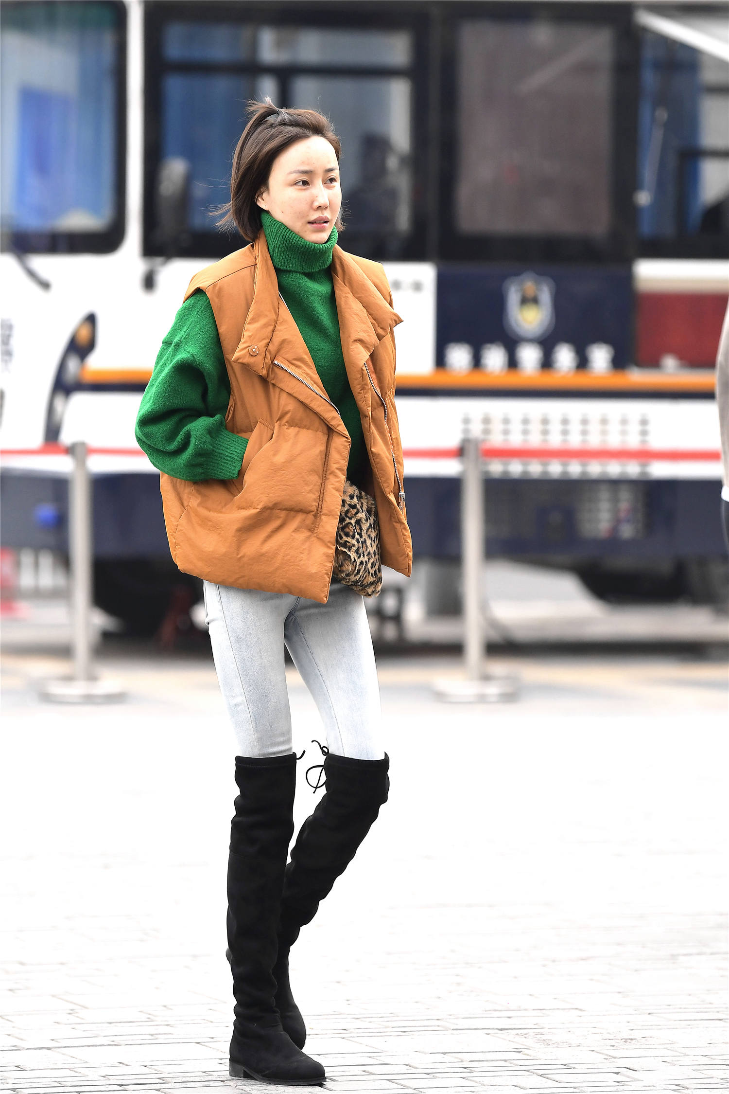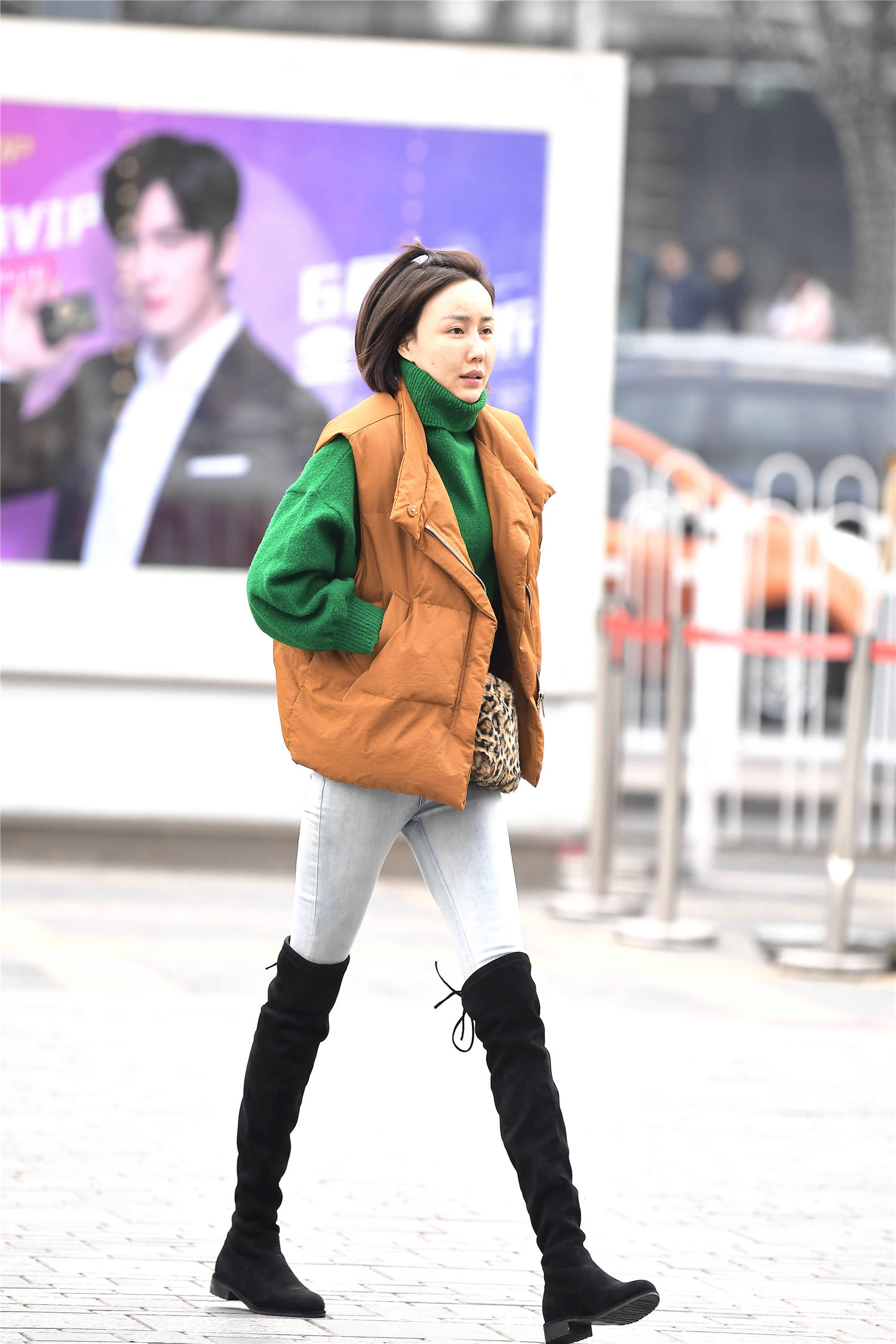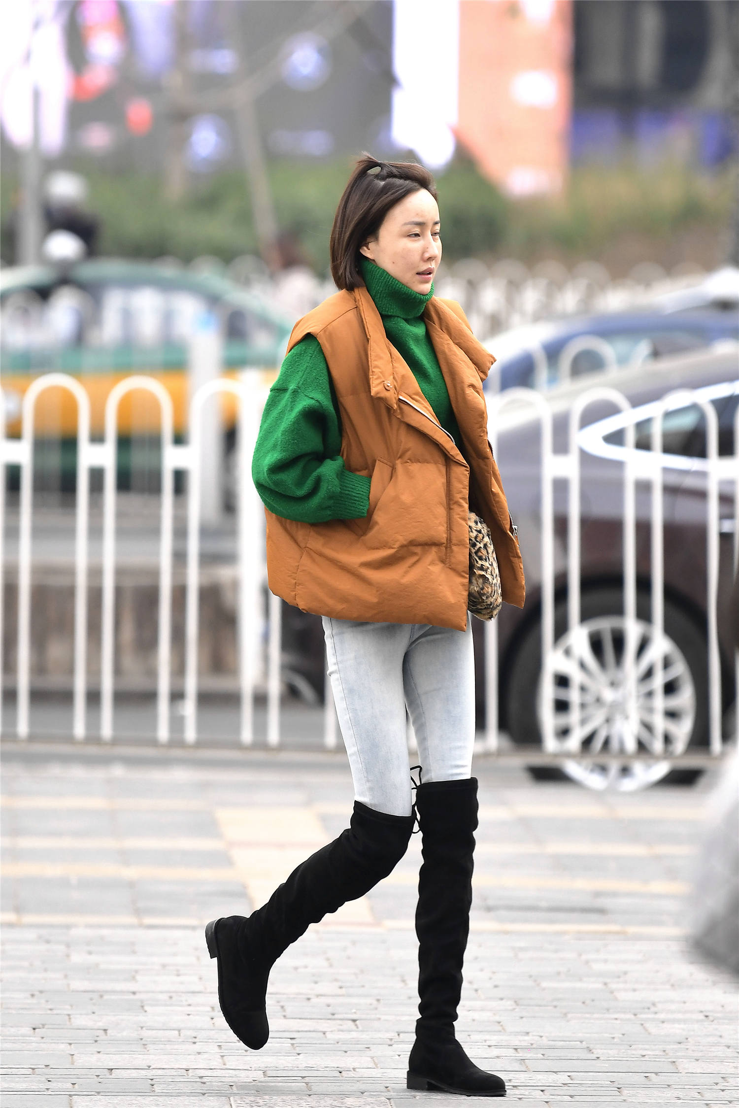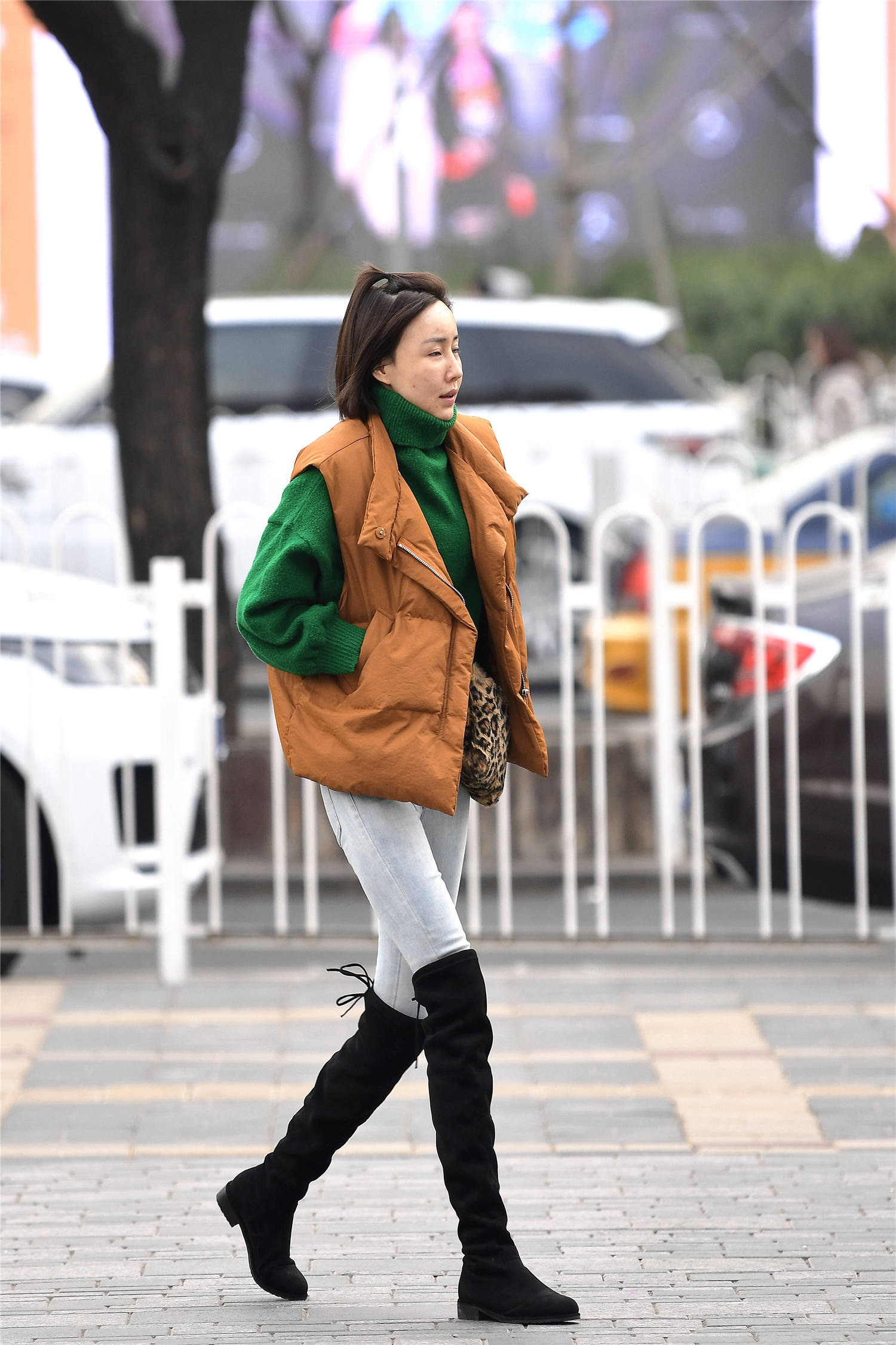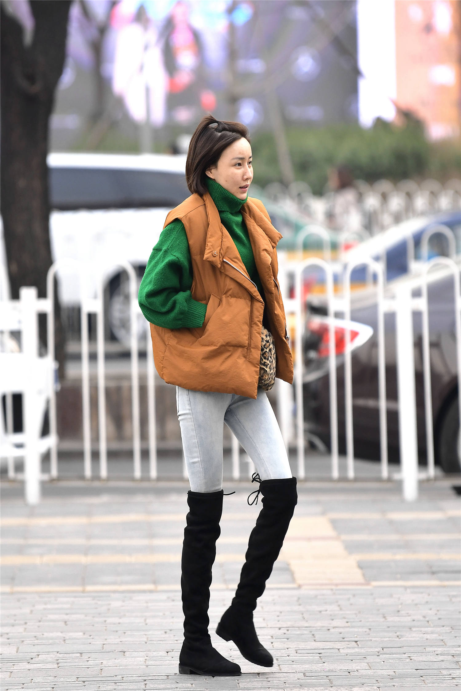 每个人的冬天色彩是不同的,这位美女选择一款绿色针织高领衫,看着就很保暖,搭配一款棕色的羽绒马甲,非常简单,色彩却很漂亮,搭配出自己的时尚感觉,冬天要穿出一点色彩,不要只穿着黑白灰,穿搭一点色彩,会让你的生活变得不一样,展现出自己不一样的一面,也让平凡的生活增加一些乐趣。
