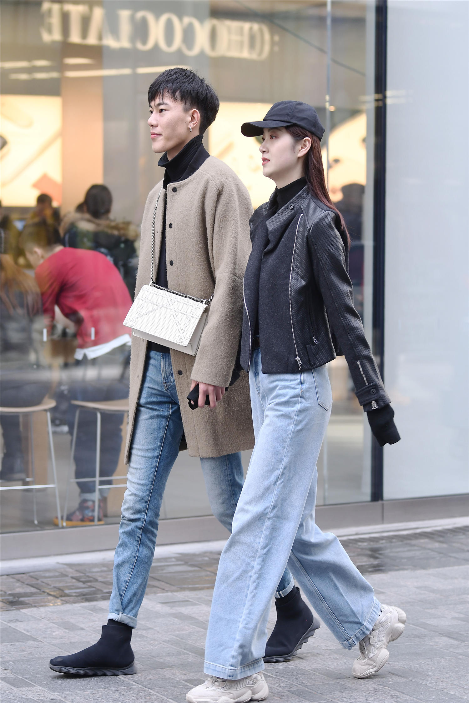直筒牛仔裤搭配拼接夹克,身材高挑纤细的姑娘,穿出气质美