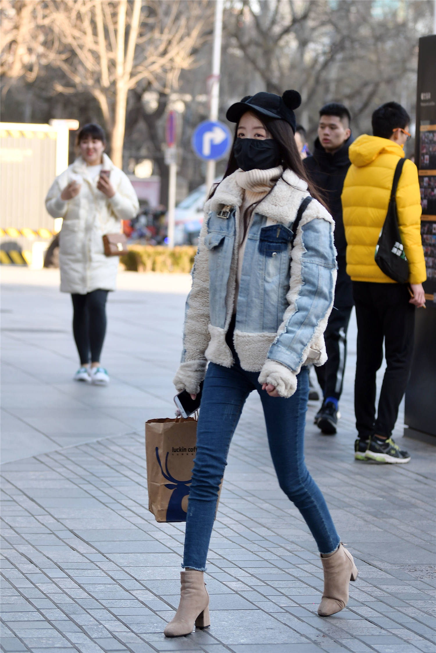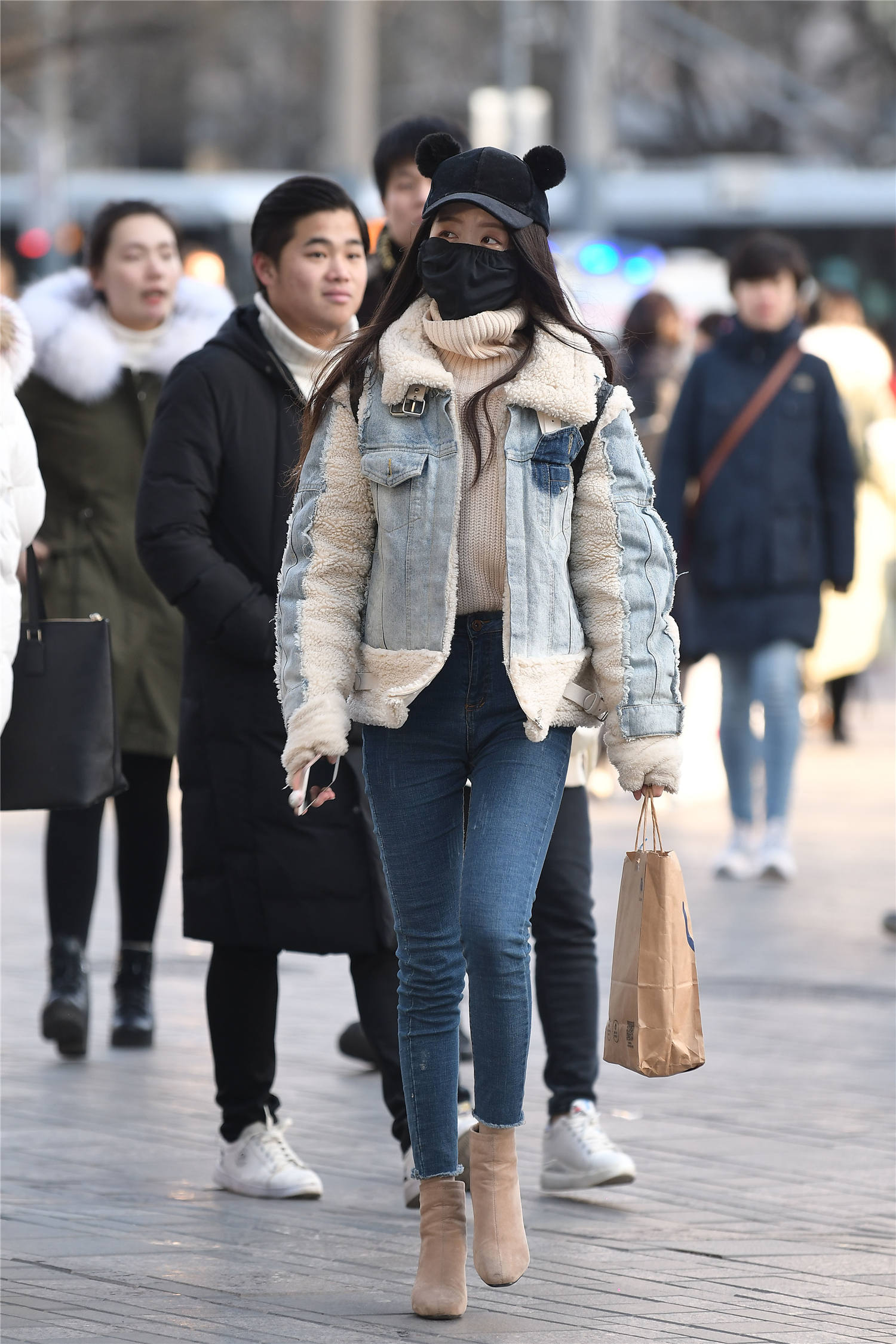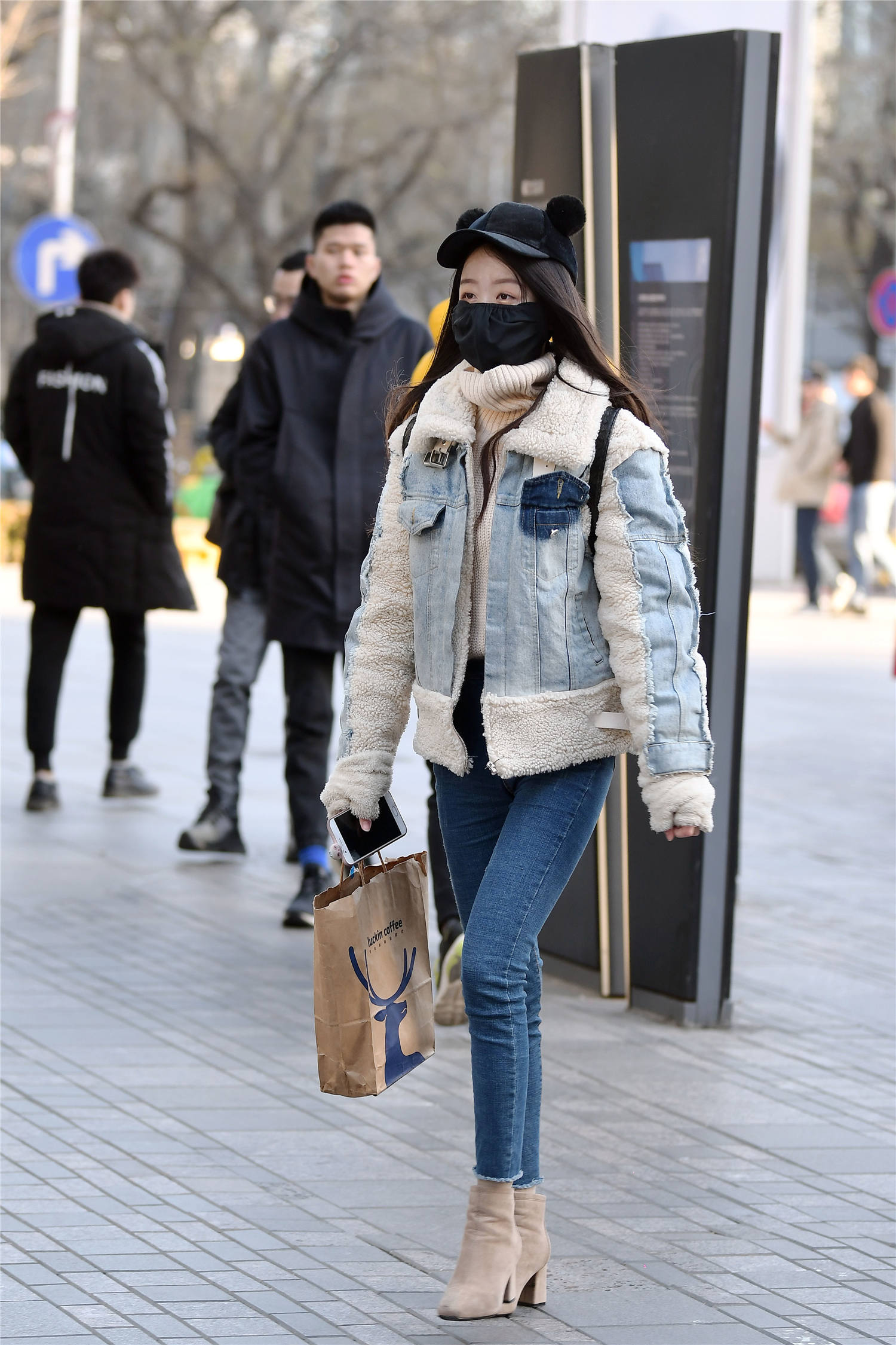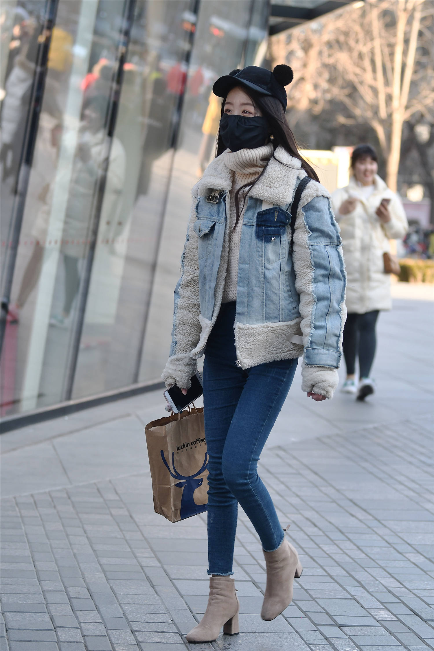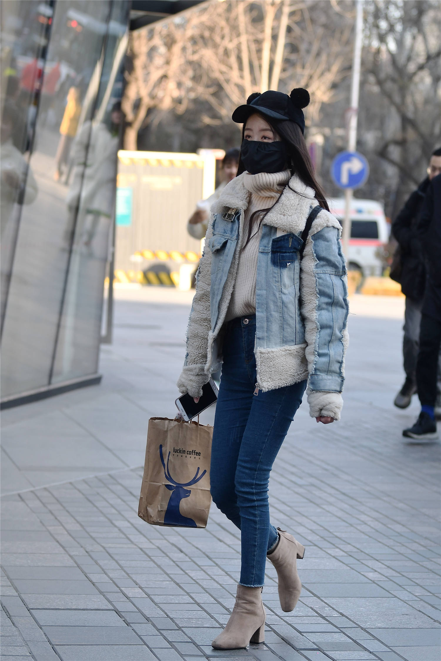 上衣选择一款羊羔毛的牛仔夹克,非常厚实的效果,有着很保暖的感觉,这样冬季出门就不会冷了,拼接的设计,增加层次感,里面一件米色的高领针织毛衣,简单又很好看,穿出自己的时尚感觉,冬季穿搭,要注意保暖,也要穿出色彩,搭配出自己的味道,选择适合自己的服装才是最好的。
