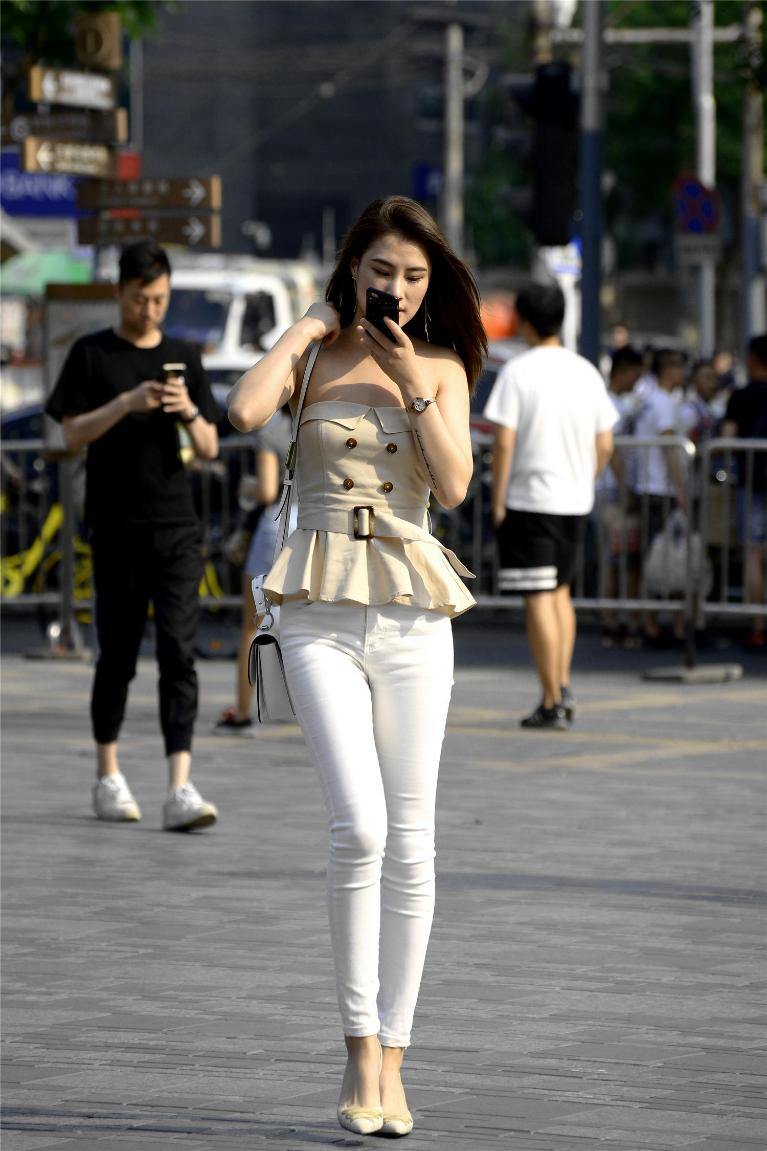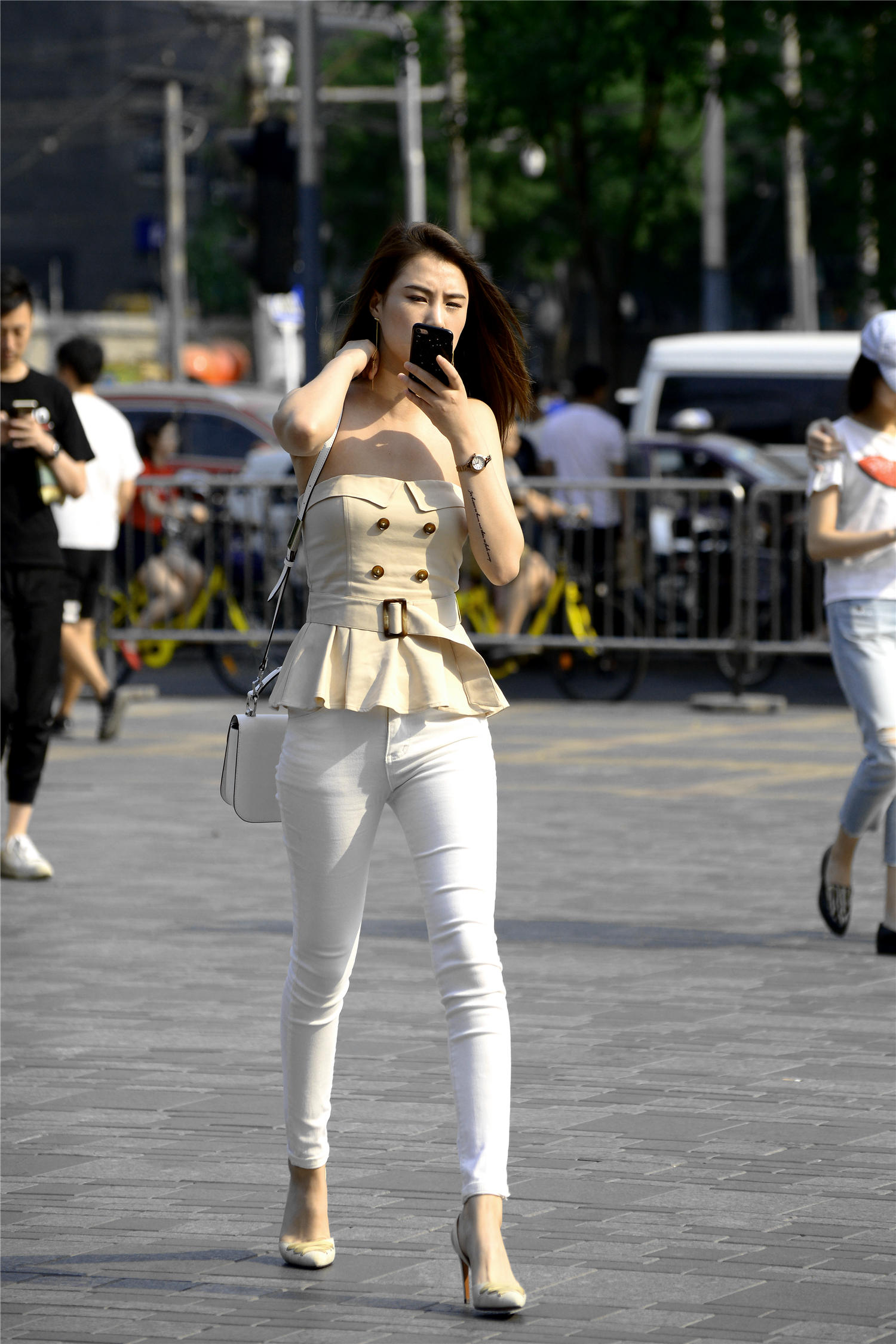 这款白色紧身牛仔裤,裤脚刚好到脚踝的位置,一般的紧身牛仔裤都是这样的设计,而且裤子很简约,没有多余装饰,没有破洞处理,就是最简约的风格,搭配出很显身材的效果,稍微带着一点褶皱,这样显得身材很好,姑娘身材匀称,所以穿着牛仔裤会很漂亮,一款卡其色的抹胸,搭配出很美的效果,收腰部分非常显身材,翘起来的裙摆,有着百褶裙的感觉,这样的设计其实可以不要,会更简约的呈现她的搭配。