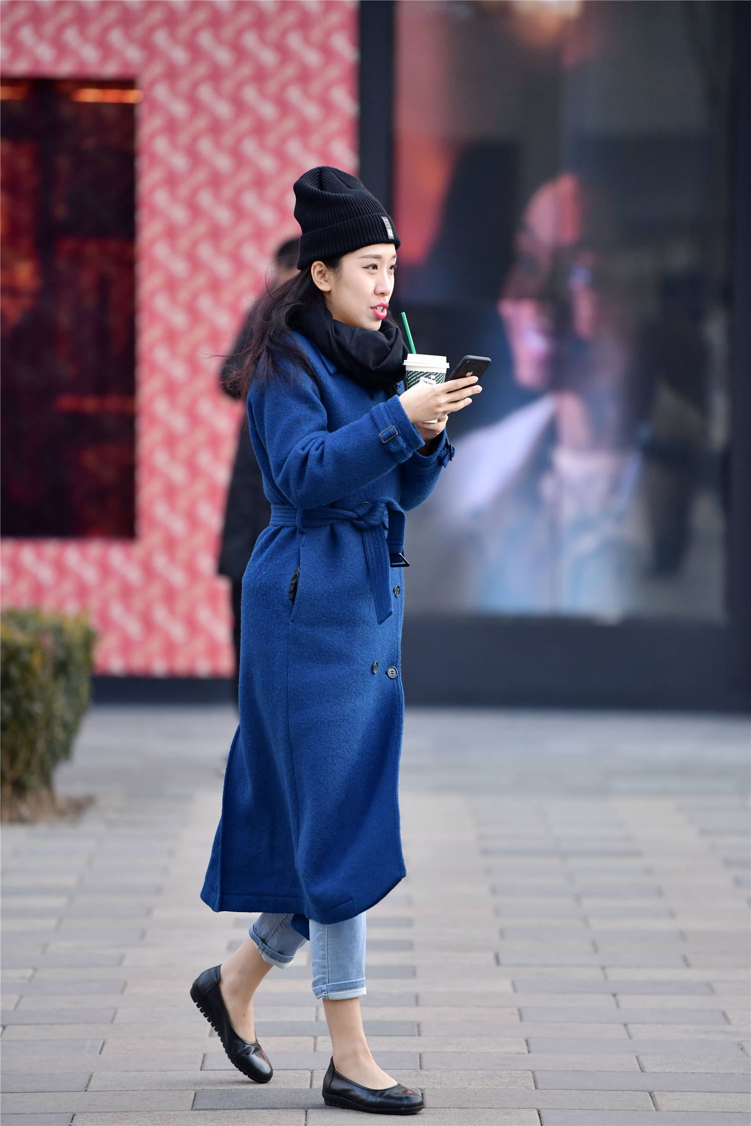 冬天的姑娘,有着自己的搭配想法,穿出自己的感觉,每一位喜欢冬天逛街的姑娘,她们选择衣服会有所不同,这位美女选择一款蓝色的大衣,过膝的长度,搭配出很显身材纤细的效果,九分的修身牛仔裤,还要把裤脚挽起一点,露出脚脖和小腿一部分,这样真的不冷么?但是很多人喜欢这样搭配,脚下的奶奶鞋,穿着逛街会很轻松。