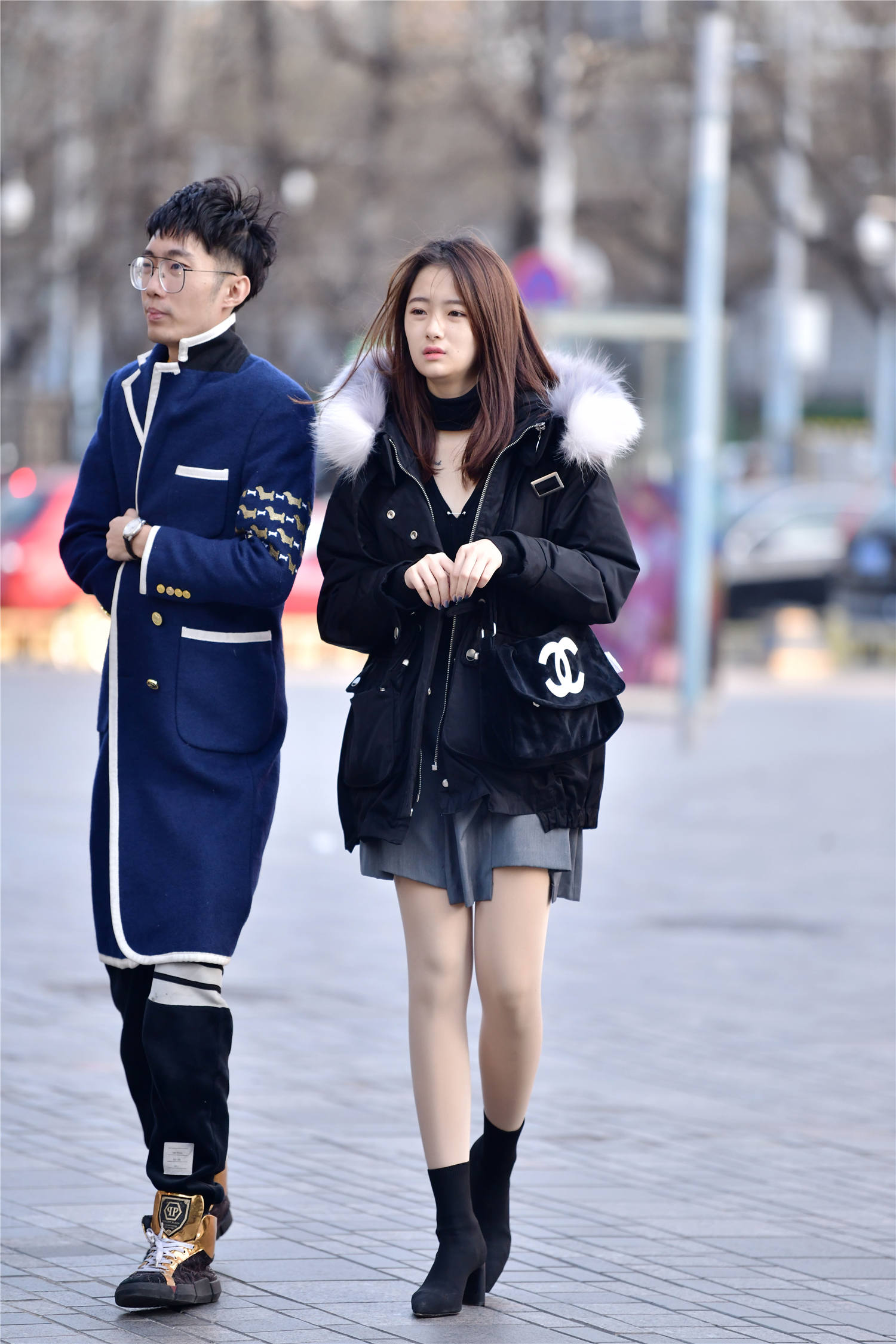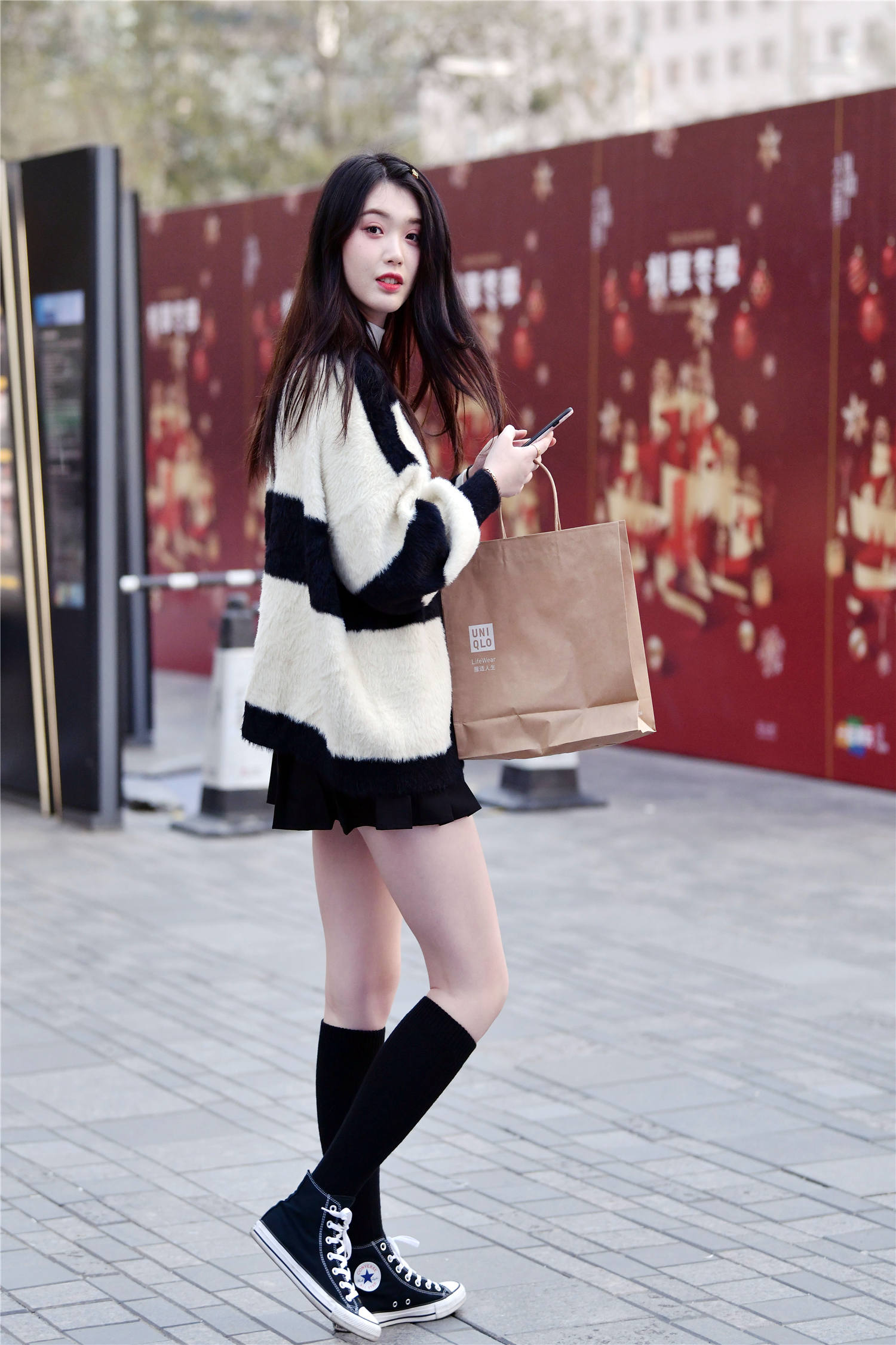 很多冬季的姑娘,她们的搭配不多,也搭配出不怕冷的效果,让你觉得这个冬大过年天怎么和她们过得不一样呢,搭配都不在一个频道上,这位姑娘选择一款黑白色相间皮草外套,搭配一条黑色短裙,一双高筒的足球袜,脚下一双平底黑色帆布鞋,白色鞋底和白色鞋带,增加装饰,简单的黑白色,搭配出很美的感觉,也穿出不怕冷的效果。