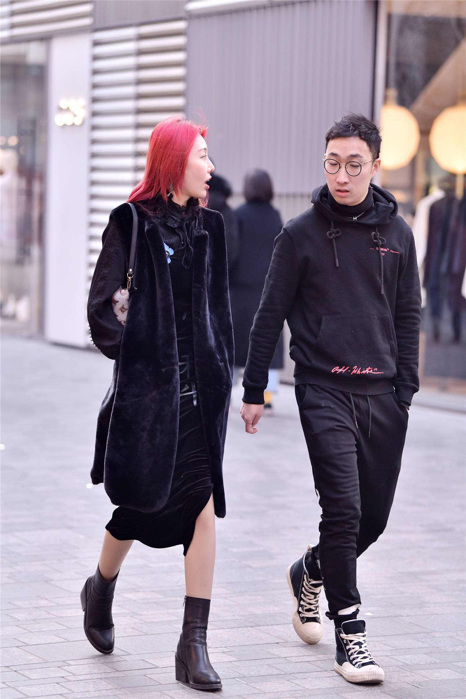 冬天依旧有很多不怕冷的姑娘出来,她们穿搭很简约,也会搭配出很时尚的味道,这位美女选择一款黑色长款的抓绒大衣,有着一点皮草的效果,深色款式,显得低调还带着华贵的效果,深蓝色丝绒连衣裙,也会搭配出很高级的感觉,粉红色的长发,会很显眼,脚下穿着一双粗跟短靴,露出一点小腿,这样的冬天是不是感觉不冷了。