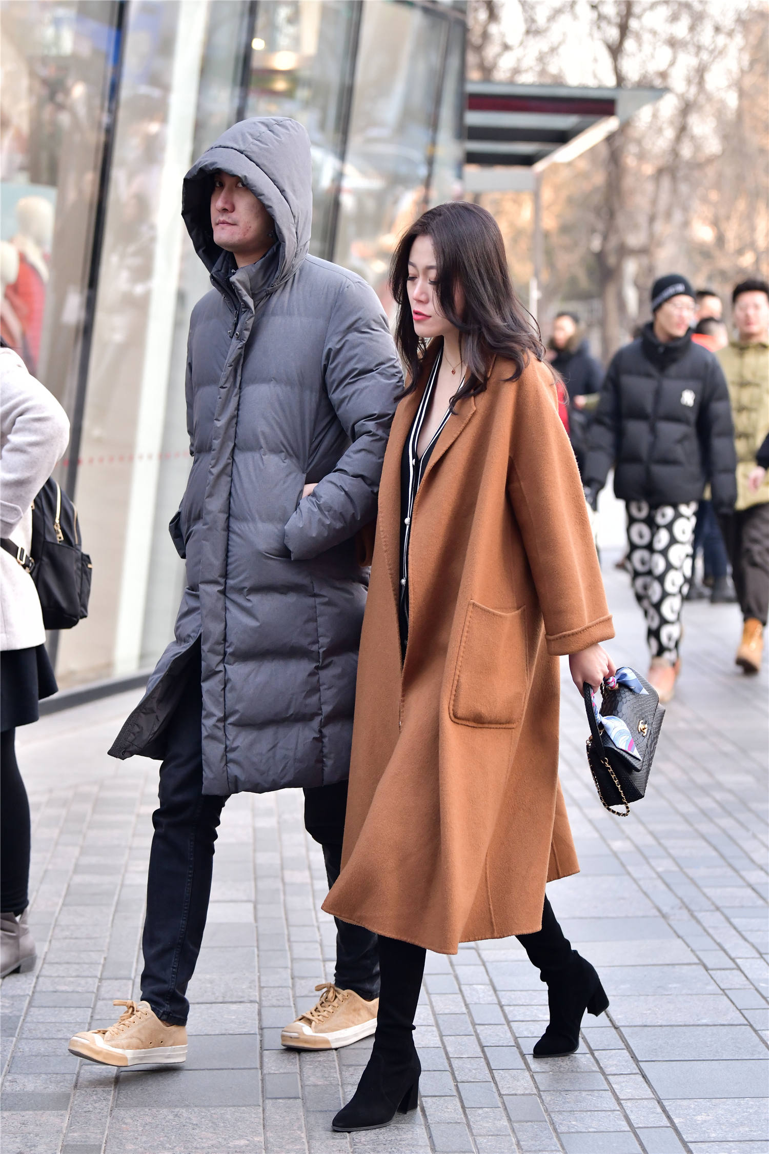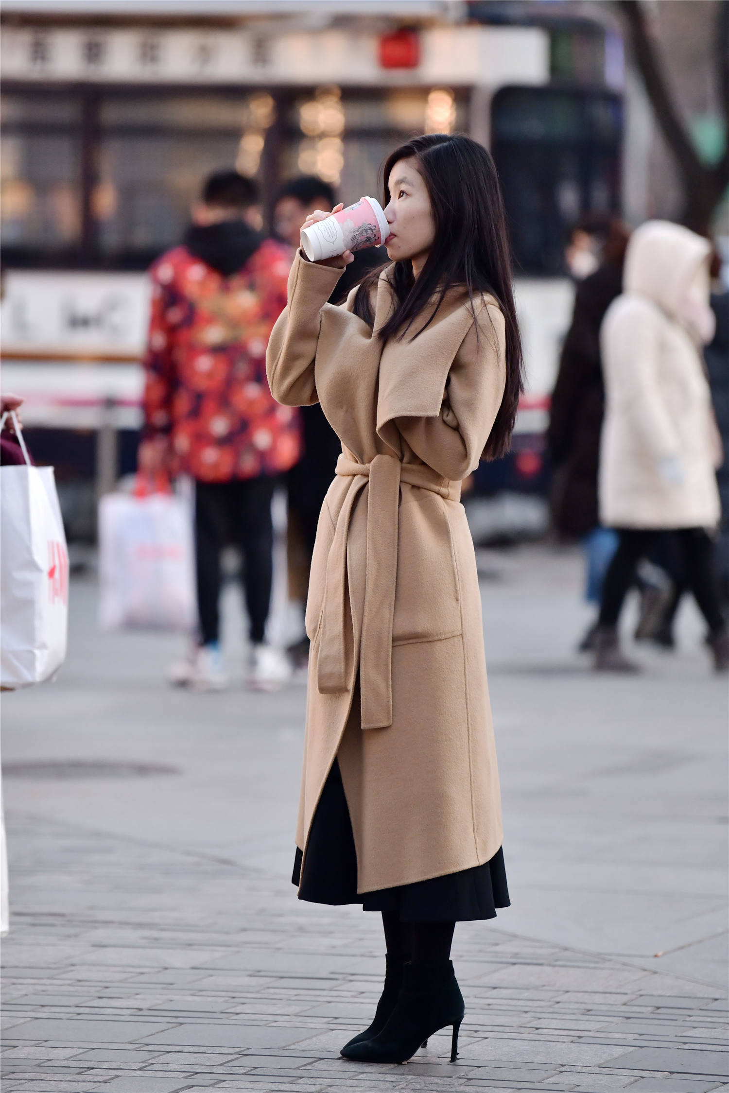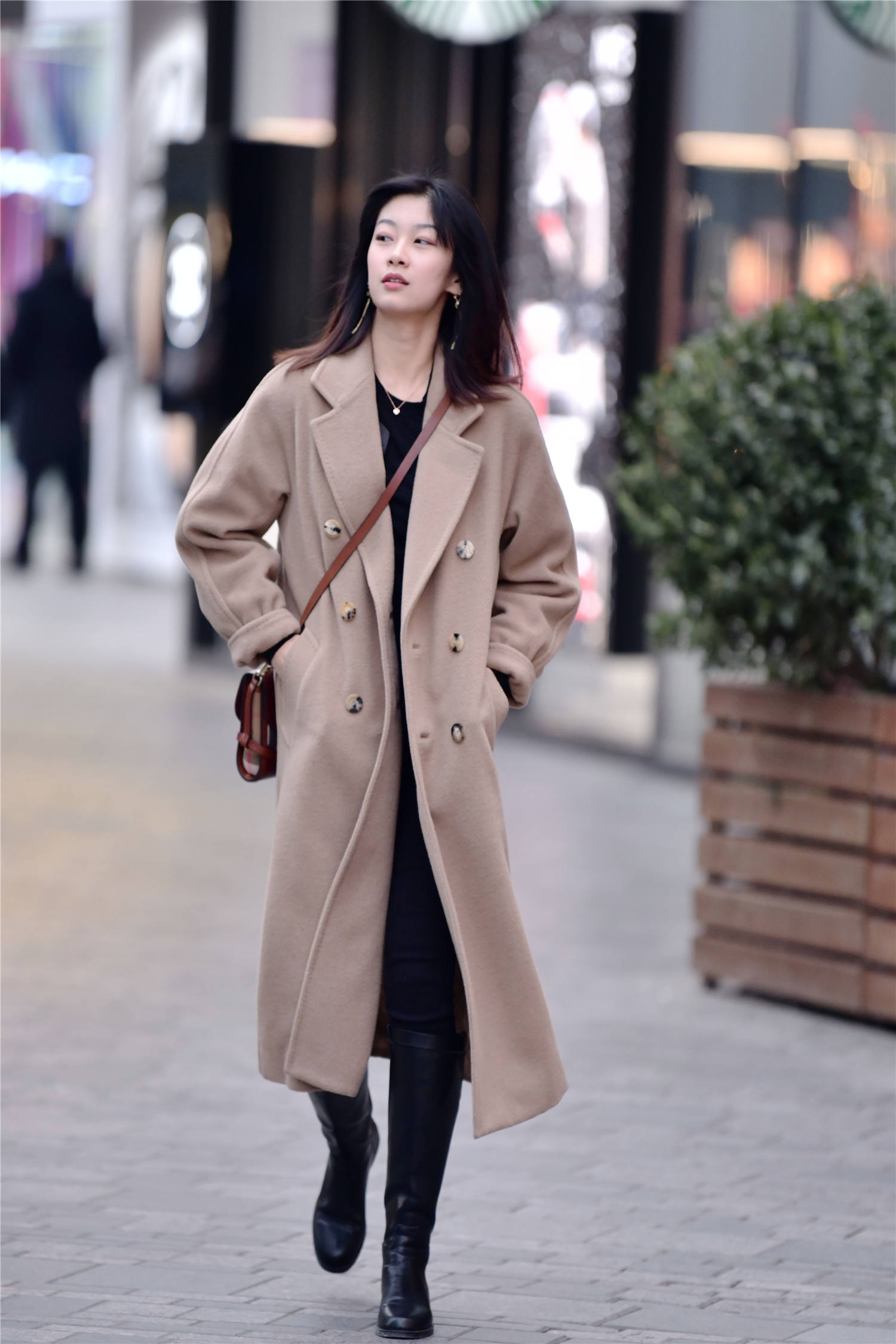 爱逛街的姑娘,冬季也会出来感受一下逛街的乐趣,她们在冬季,也会穿搭精致,而且选择简约还带着一点层次感的穿搭,这位美女选择一款卡其色的呢子大衣,非常厚实的面料,会抗风保暖,过膝的长度,让搭配变得更加简单,前面的扣子没有系上,走路会露出一点内搭,黑色长靴,起到很好的保暖效果。
