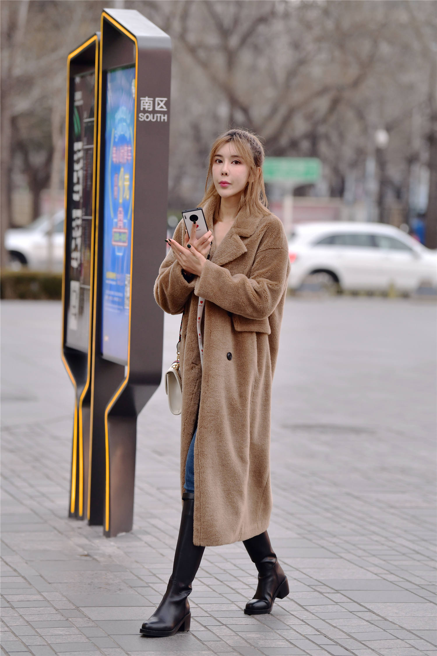 很多人对于冬季的搭配,更多是以黑色为主,容易搭配,还会穿出很干净的感觉,选择一些有色彩的大衣,也会展现出不一样的味道,所以不要总是选择黑色款式,这位美女选择一款驼色的长款大衣,抓绒的款式,非常厚实,看着就很暖和,蓝色紧身牛仔裤搭配一双黑色皮质长靴,这样的冬天是不是就不冷了。