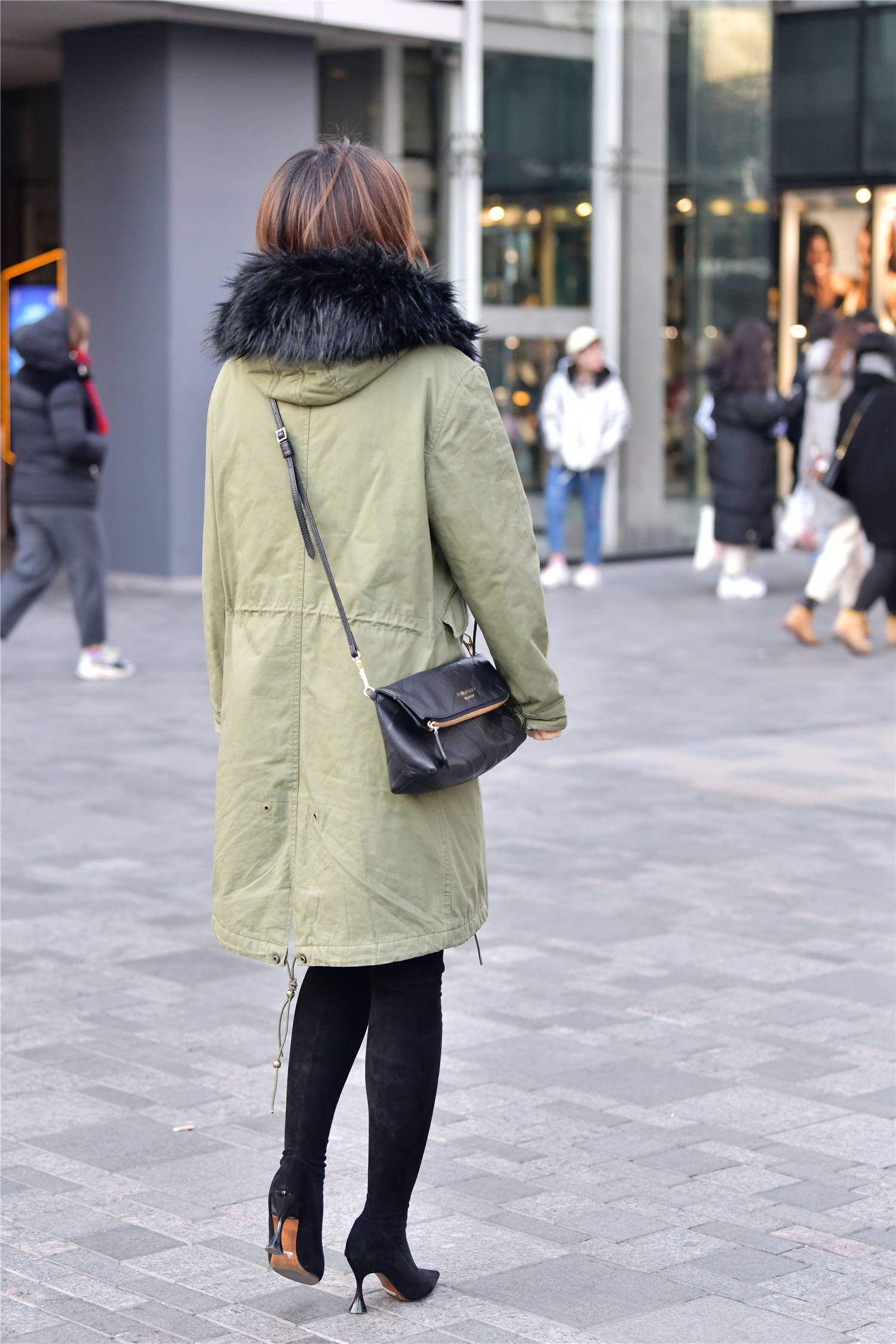其实冬季的搭配也会很简单,很多人觉得要穿很多衣服才会出门,那是没有选择好自己的服装,看一下这位时尚美女,选择的搭配很简单,选择一款绿色的中长款大衣,黑色毛领,显得非常有层次感,腰线位置设计的很好,休闲的款式,搭配出身材比例效果,一双紧身尖头细跟长靴,这样起到修身效果,还展现出很精致的时尚感觉。