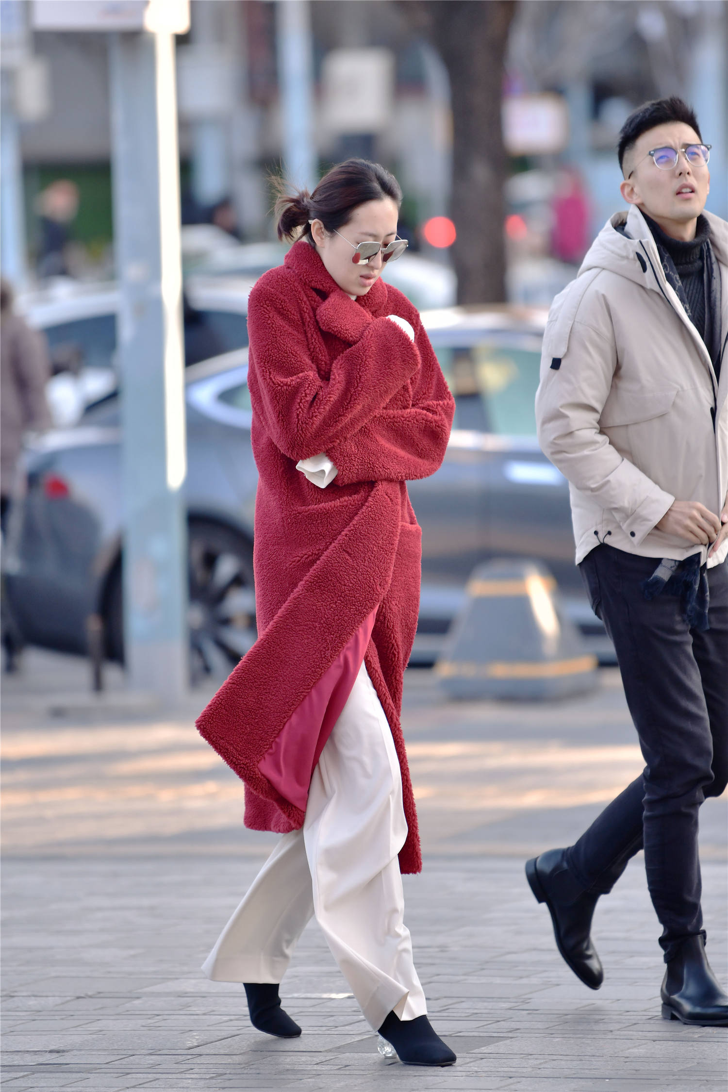 北方的冬天还是挺冷的,所以出门的姑娘还是要注意保暖,选择一款漂亮时尚的大衣,会让你的搭配变得简单,又可以展现出很美的感觉,这位美女选择一款红色抓绒大衣,厚实又带着保暖的效果,把手环保在胸前,让自己更有暖和的感觉,米白色的长裤搭配一双黑色高跟袜靴,水晶鞋跟非常好看,身材也更显高挑。