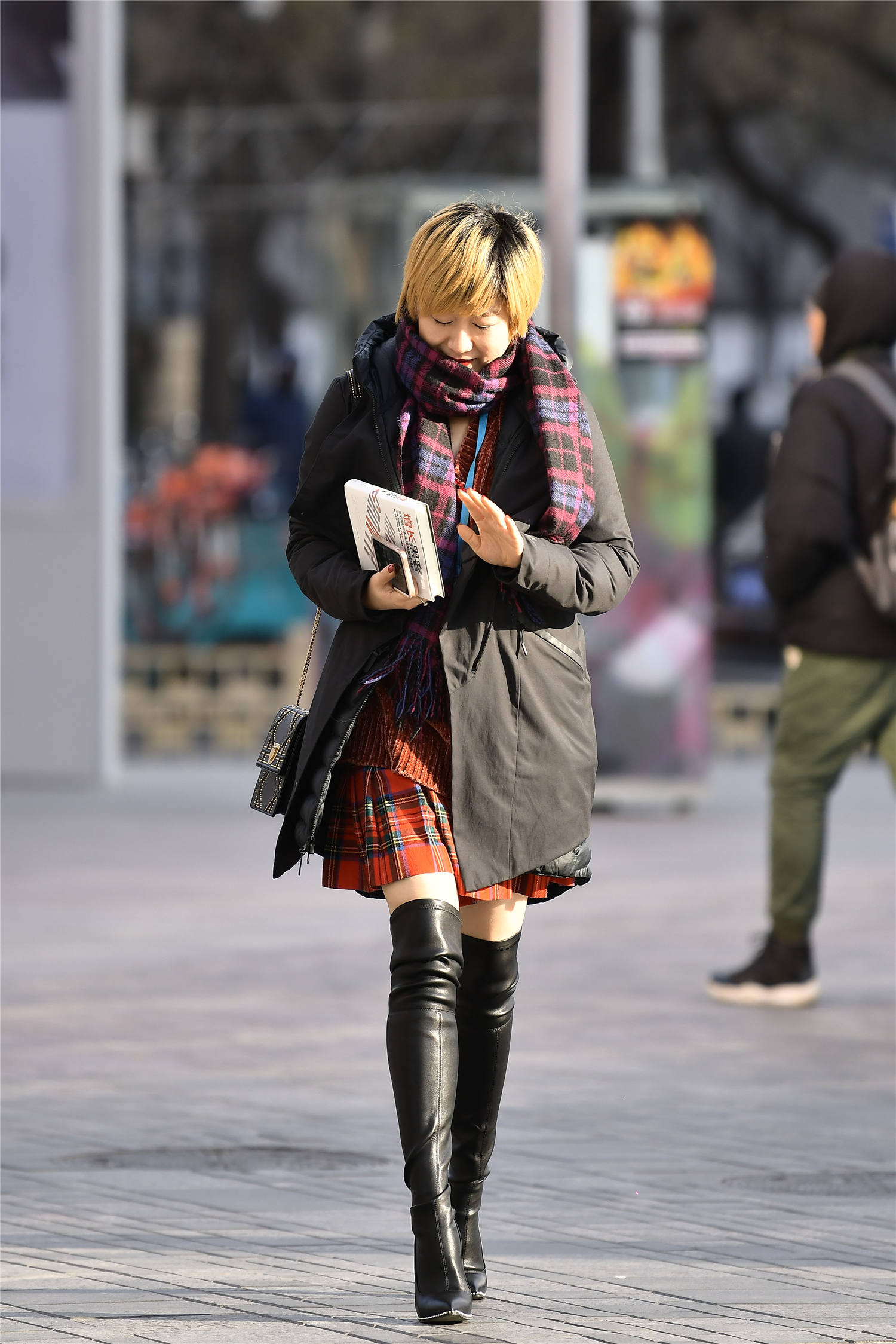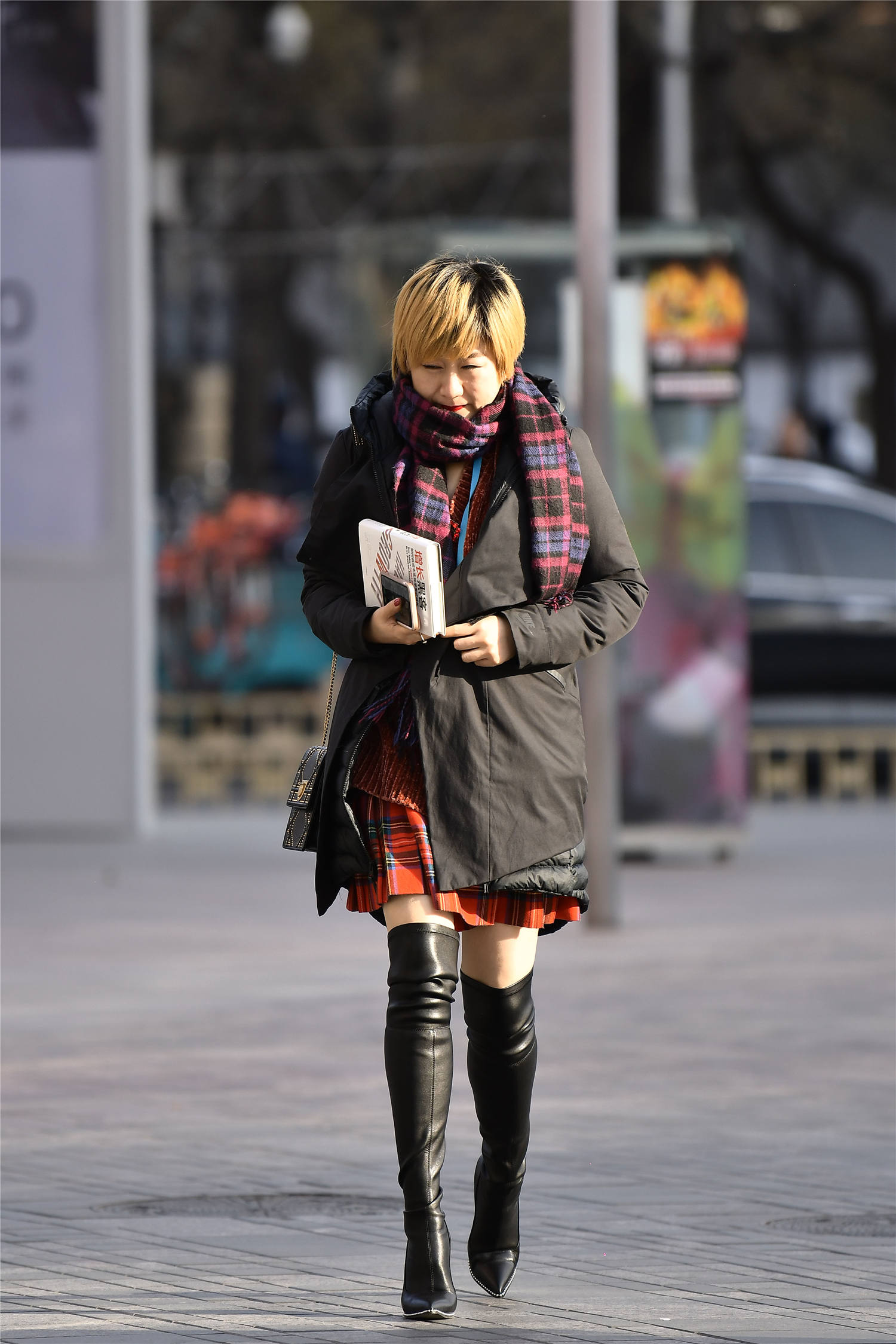 一款中短款的羽绒服,磨砂皮与亮面结合,这样非常有质感,而且黑色的穿搭,很好看,也非常保暖,一款红色格子百褶裙,非常显年轻的一款裙子,一款格子围巾,有着暗色的效果,这样的穿搭很好看,也很保暖,所以冬天出来逛街,很多人穿着时尚,还搭配出很保暖的感觉,你的冬天会搭配得这么精彩么?
