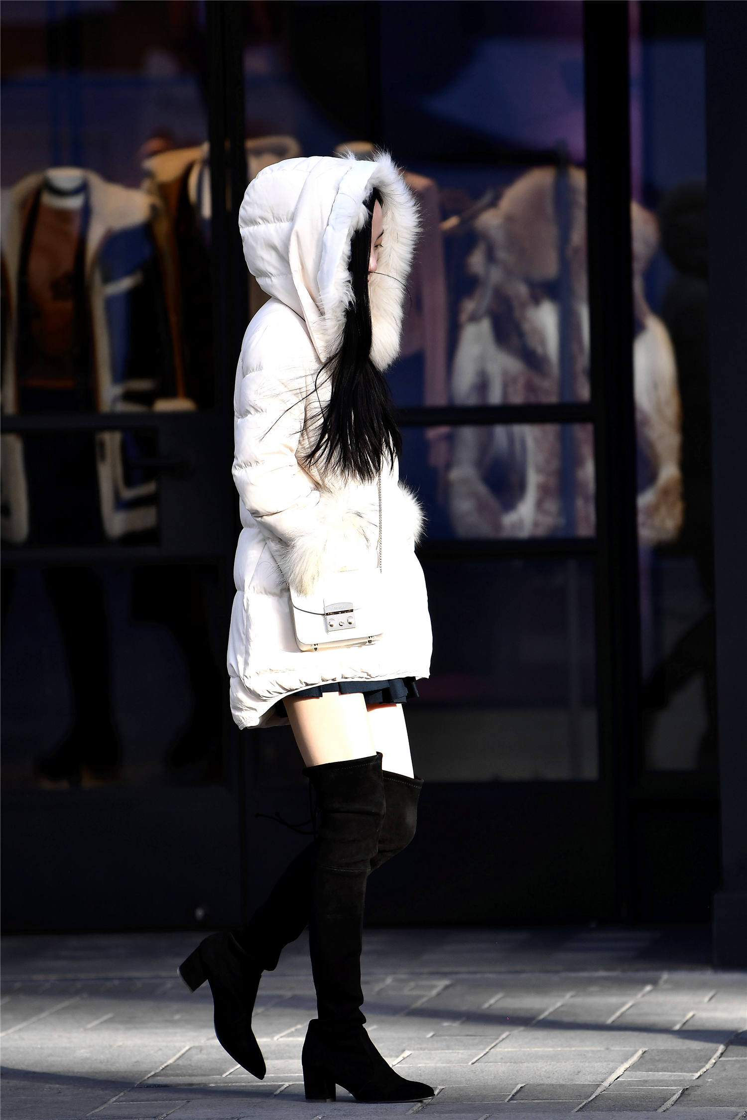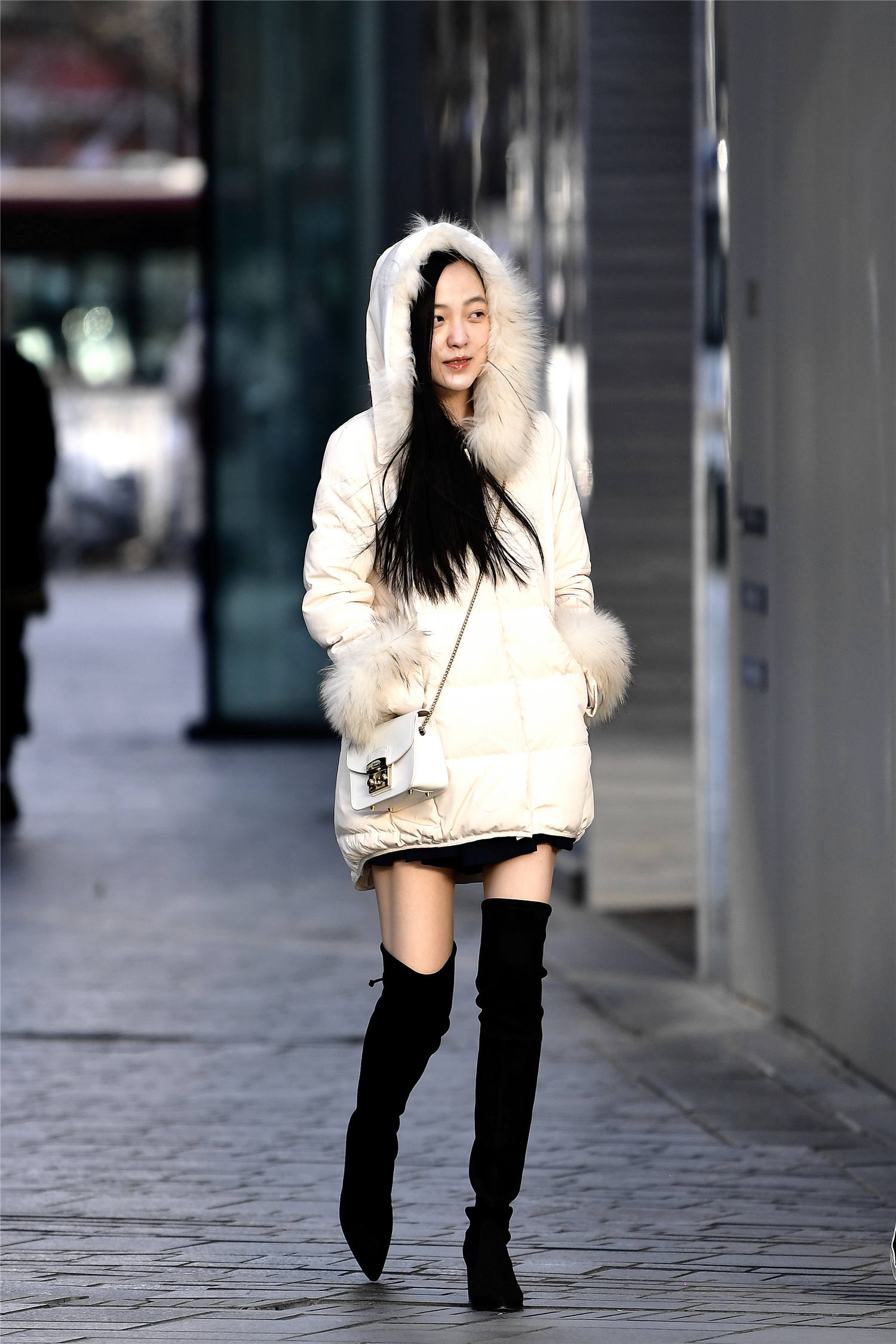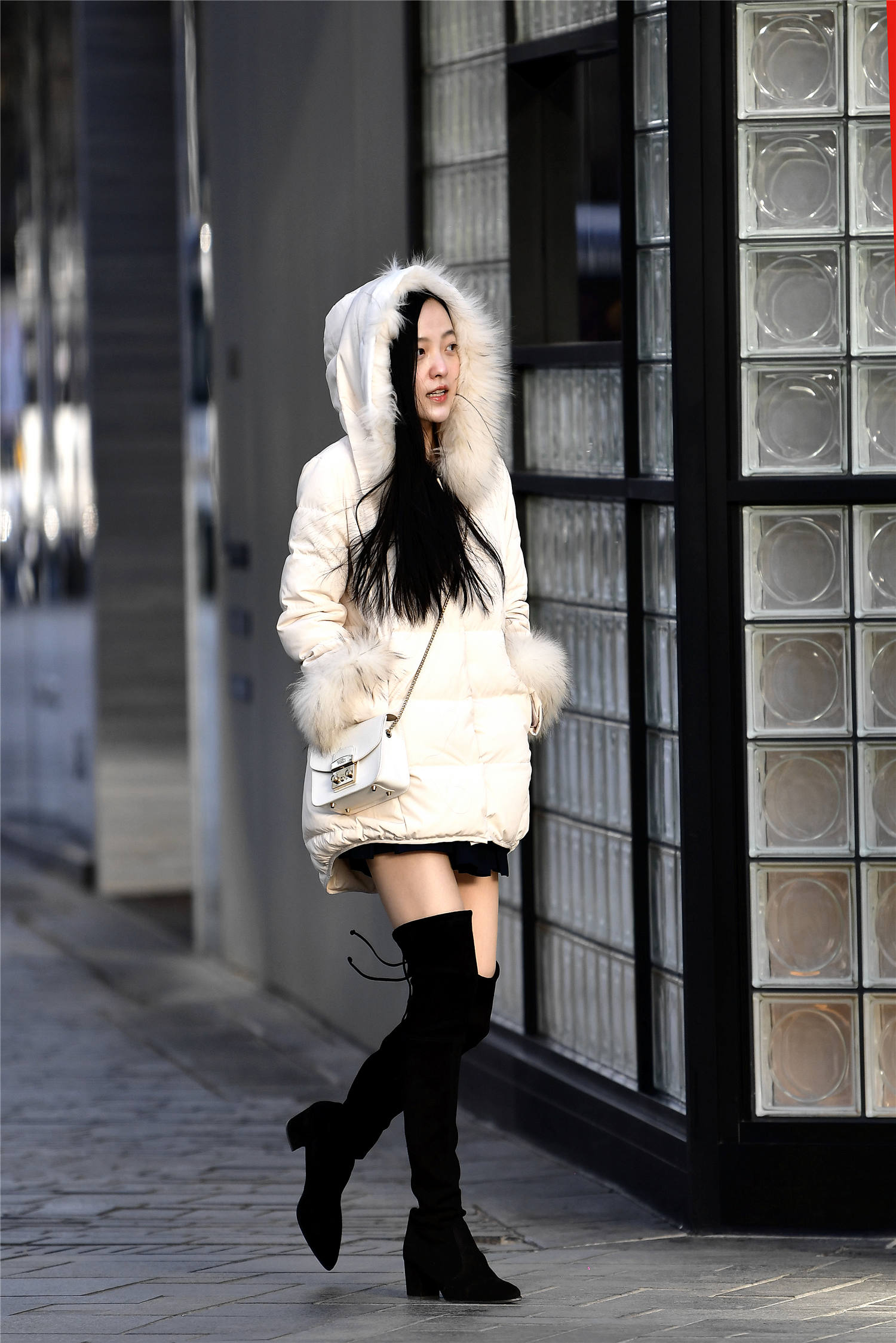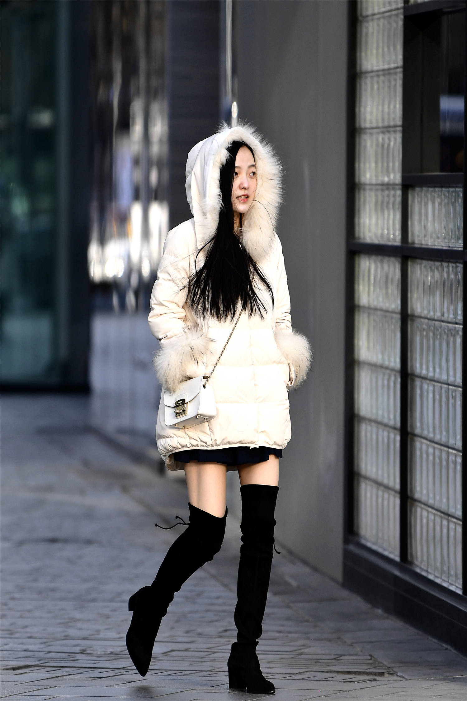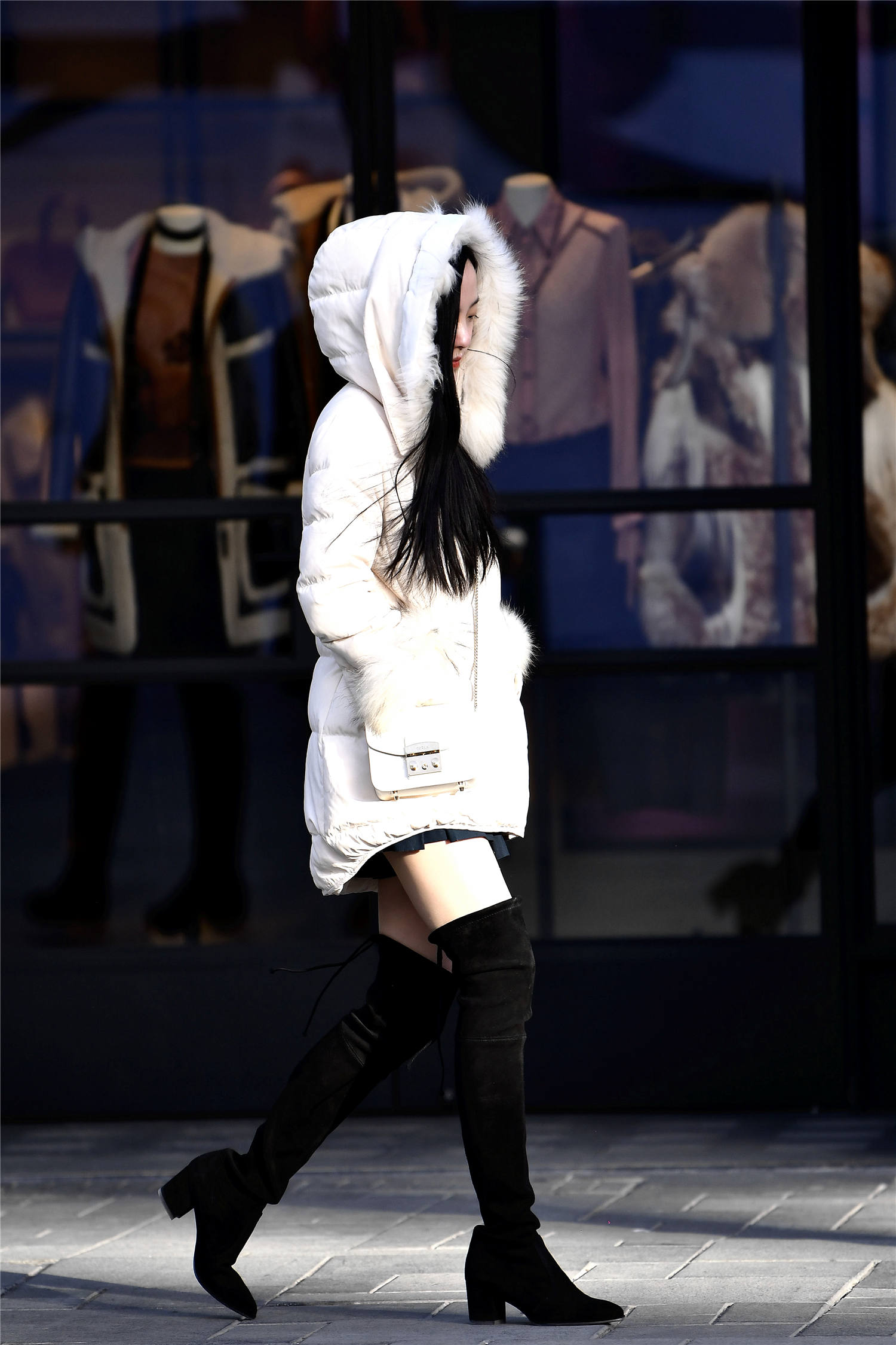 选择一款白色羽绒服,中短款的搭配,白色皮毛和袖口的皮毛设计,显得非常白皙,而且也衬托出很精致,帽子戴上,这样看着很保暖,里面搭配一款短裙,简单又很好看的穿搭,而且露出一点大腿,这样又搭配出不怕冷的效果,冬天的姑娘非常会展示自己,冬天的姑娘,要知道怎么搭配才会更好地展示自己。