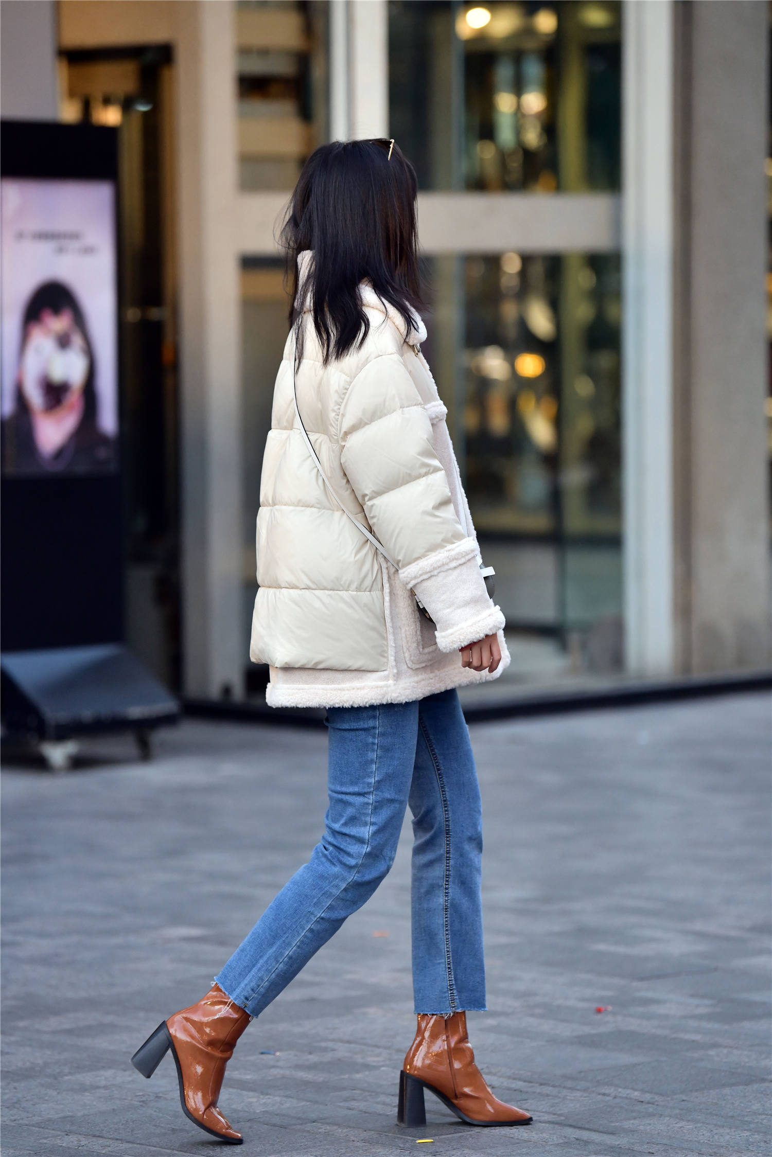 在大城市里面,很多人都会注意穿搭,也知道怎么搭配,穿出自己的时尚感觉,这位姑娘选择的搭配是深蓝色的修身牛仔裤,九分的裤脚,下面直接裁剪一下,脚下棕色尖头粗跟短靴,非常精致,也显得非常秀气,漆皮效果非常有质感,搭配出很精致的感觉,米白色短款羽绒服,有着羊羔毛的衬里,这样搭配出很精致的感觉。