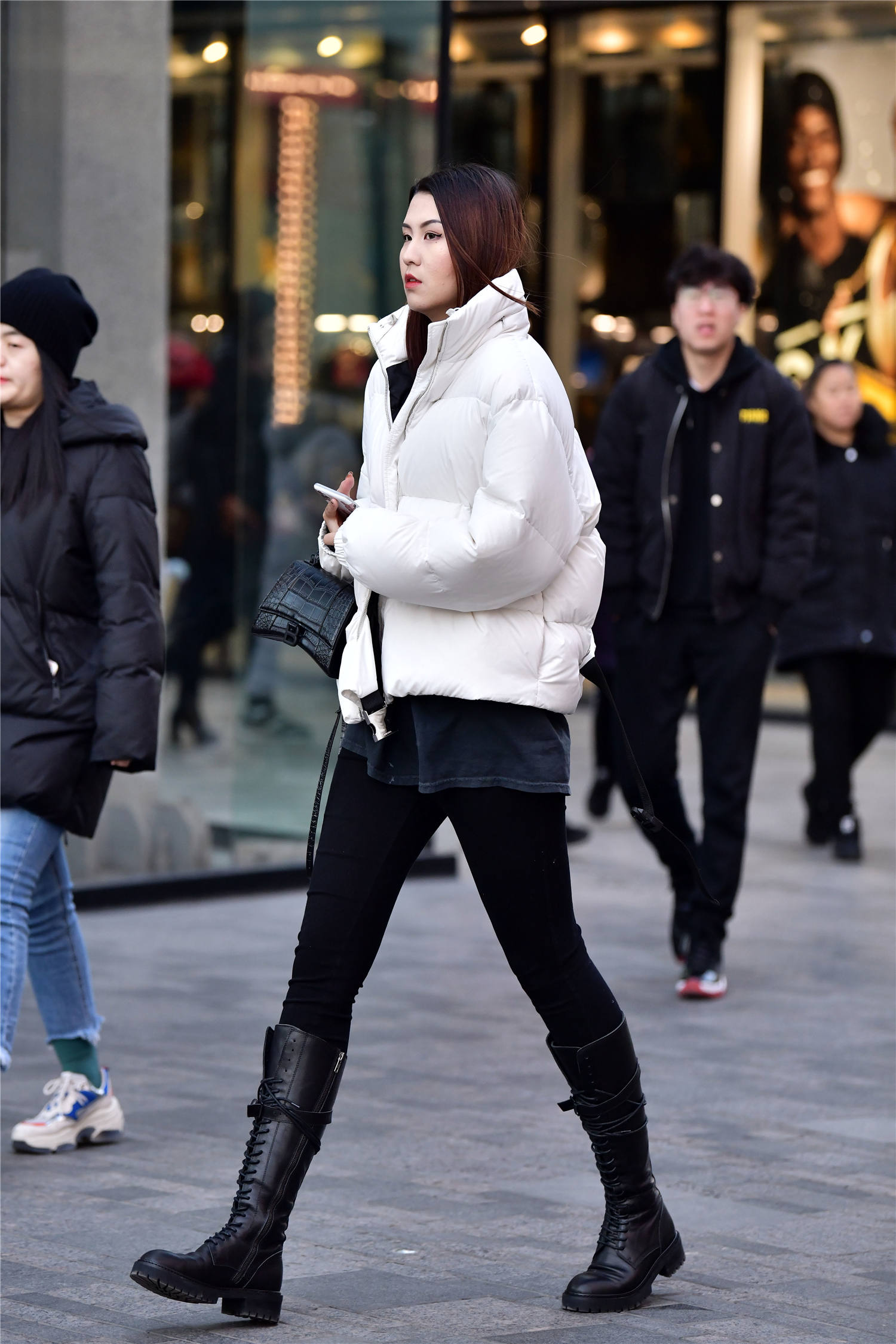 身材高挑的姑娘,其实更会搭配,也知道怎么搭配出自己的时尚味道,看一下这位身材高挑,还很匀称的美女穿搭,黑色紧身牛仔裤搭配系带马丁长靴,非常好看,也展现身材曲线,黑色衬衣,有点破旧的设计,这样会非常有个性,短款的白色羽绒服,非显休闲的款式,展现出自己的时尚味道,这样搭配出很显身材的效果。