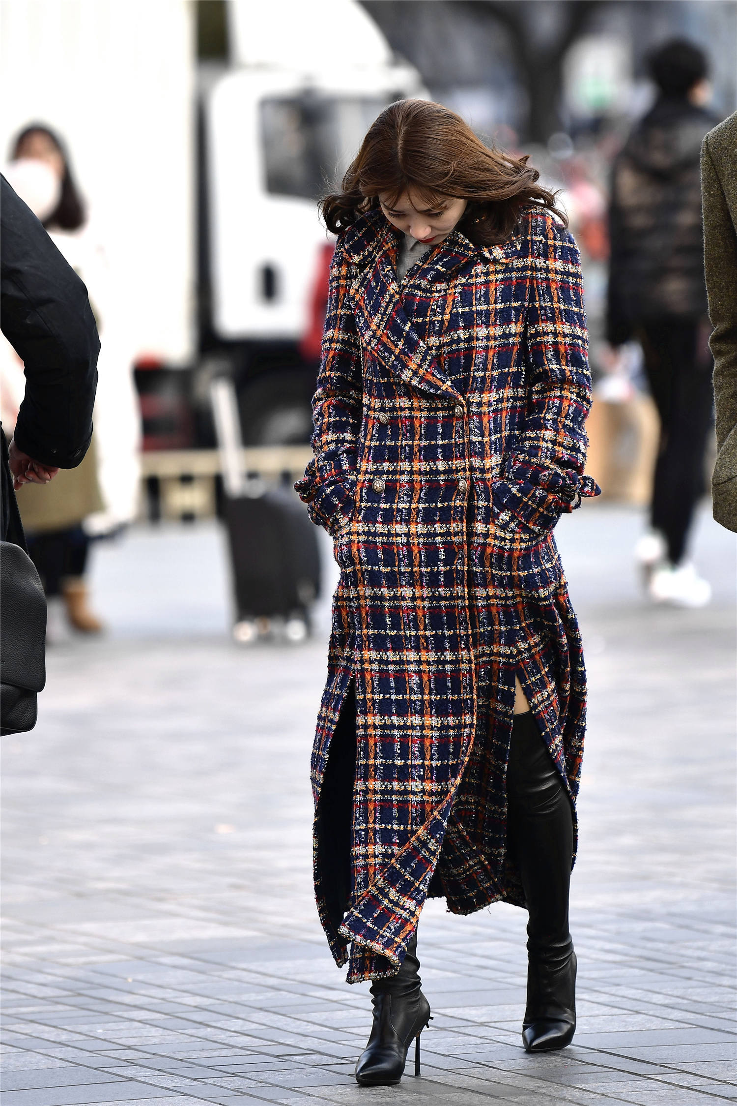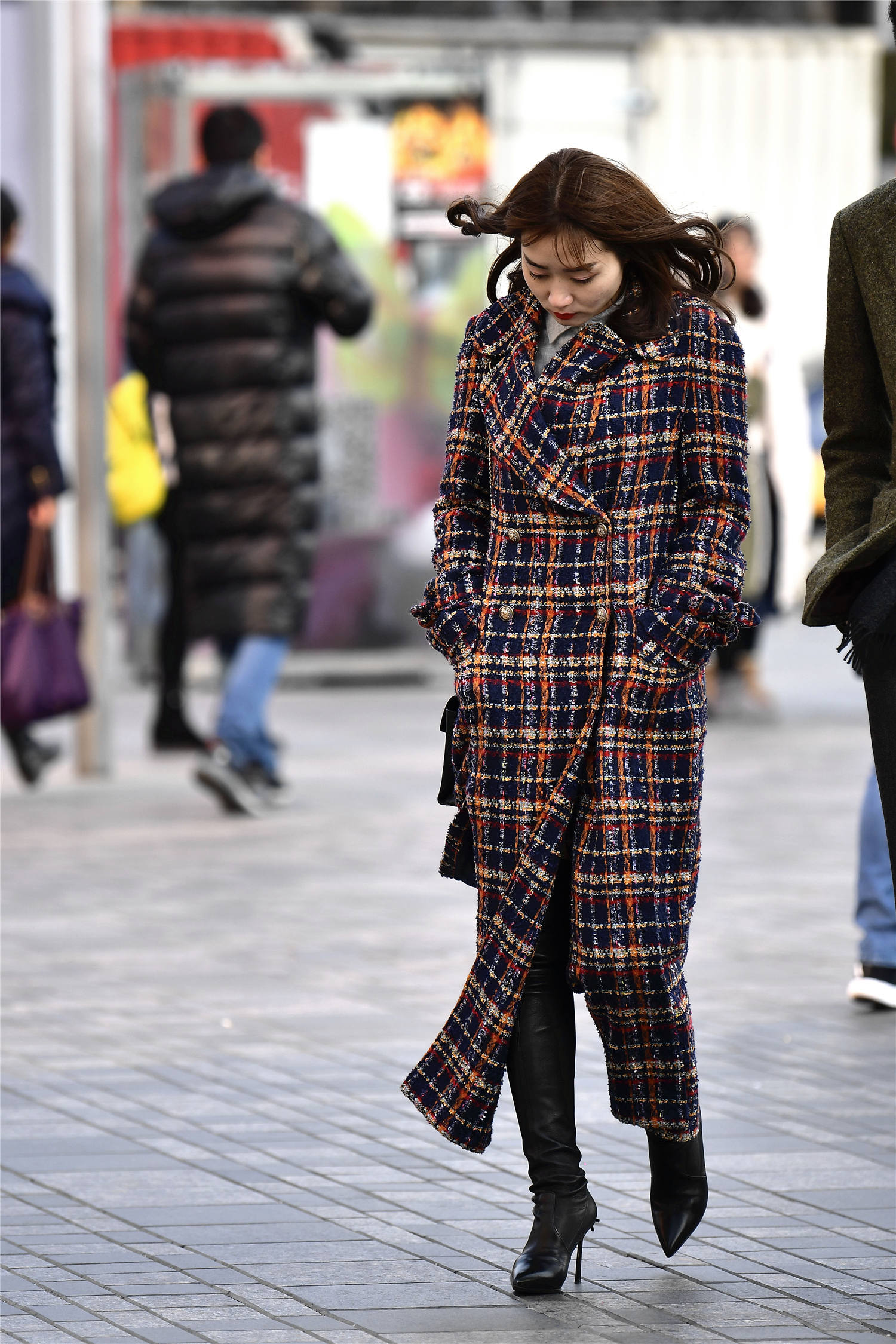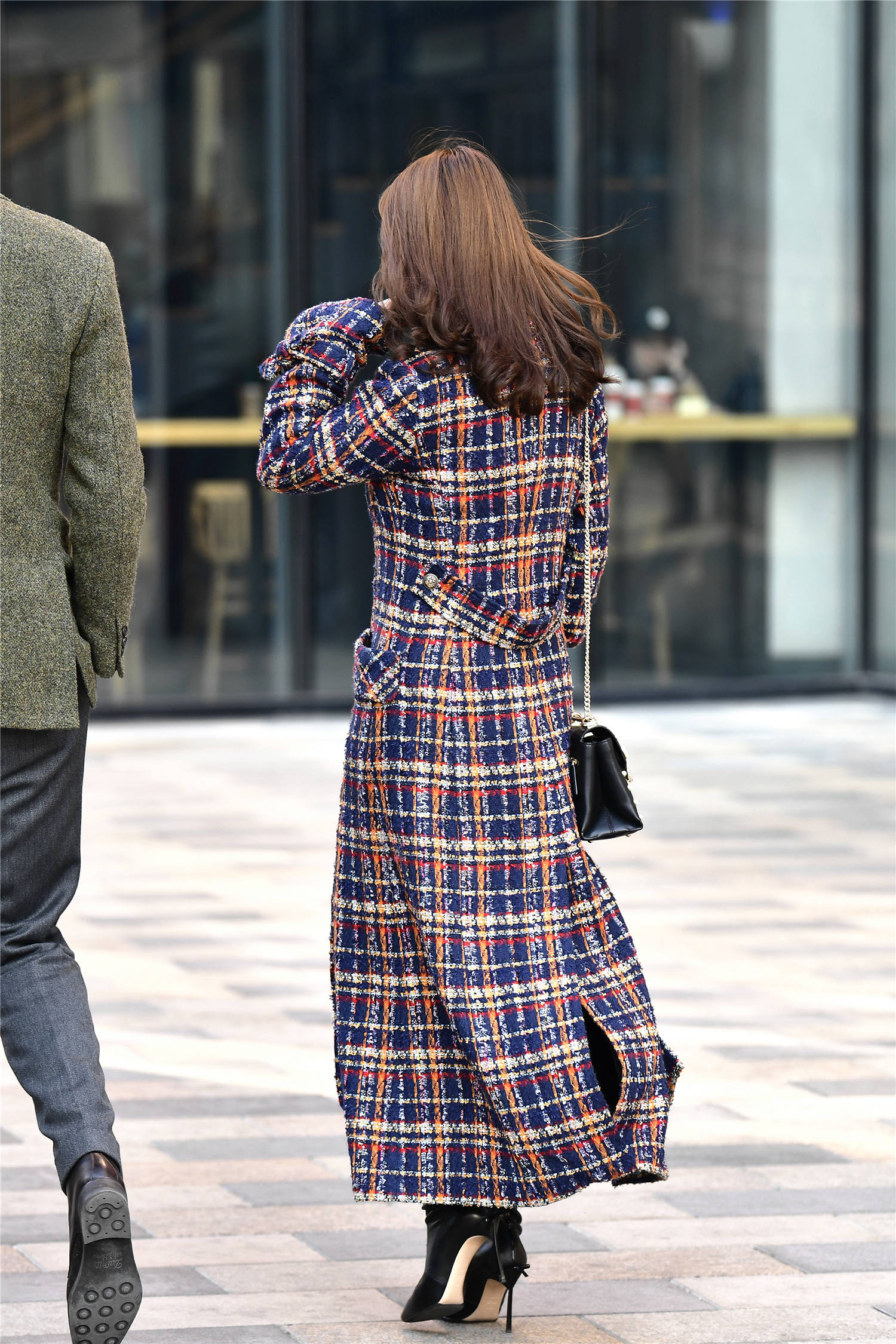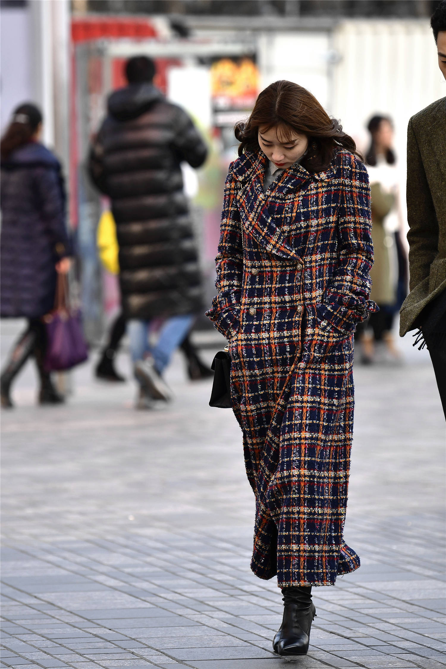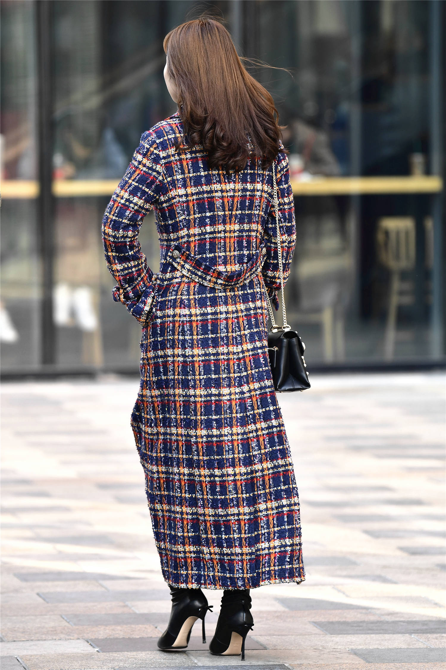 看一下这位美女选择的这款长款大衣,刚好到脚踝的位置,红白黑格子款式,粗呢针织的款式,非常有质感,这样一款大衣,非常有色彩,也有层次,还显得人很有气质,长款有着很好的保暖效果,也让搭配变得更加简单,对于不太会穿内搭的姑娘来说,这样一款大衣,非常好看,可以尝试一下这样的穿搭。