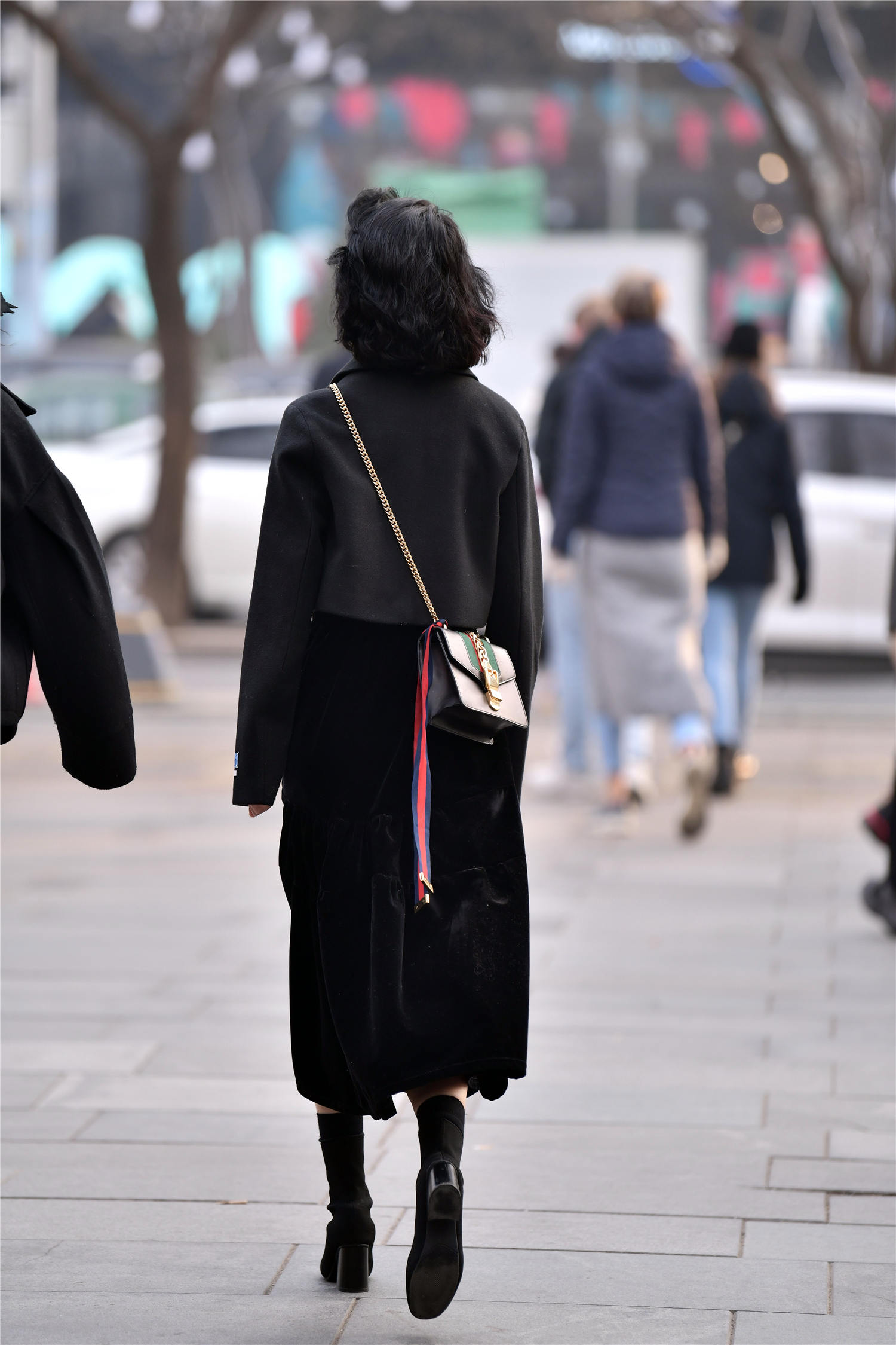 你的冬天是什么色彩,会怎么搭配,这位美女选择一身黑色搭配,穿出自己的时尚味道,一款黑色长款的风衣,让他的搭配很简单,选择一款金属链的单肩包,红色与金色的搭配,非常好看,搭配黑色高筒短靴,塑料质感的粗跟,带着一点反光,非常好看,穿出自己的时尚味道,搭配出自己的时尚感觉。