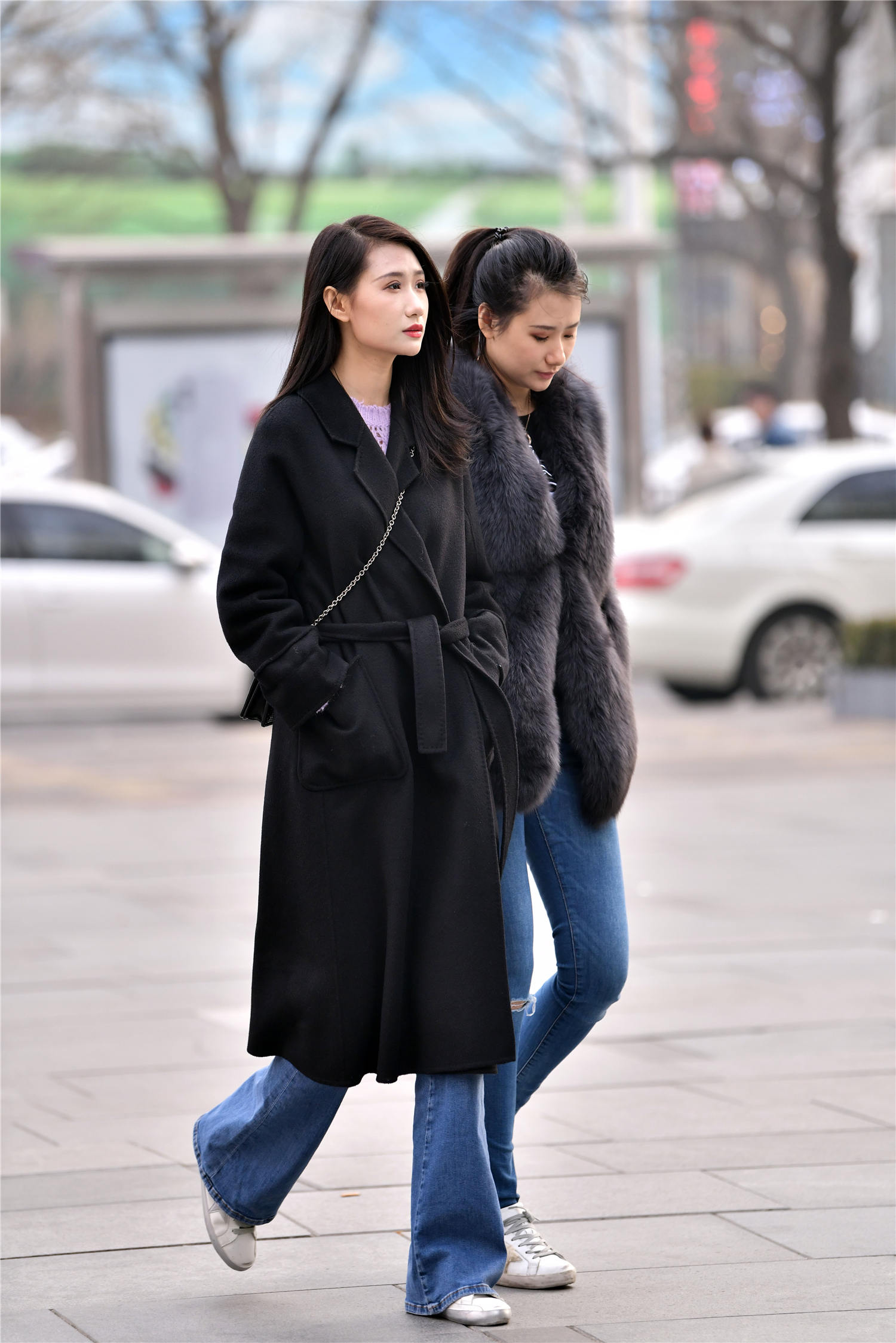 时尚的姑娘,要知道怎么搭配出秀气的感觉,穿出自己的时尚味道,怎么穿出自己的味道,每一位姑娘有着自己的想法,这位美女选择一款黑色呢子大衣,过膝长度,非常好看,也显得非常简约,深蓝色喇叭牛仔裤,搭配一双脏脏鞋,很多人喜欢这样的穿搭,这样搭配很简单,也穿出很秀气的感觉,非常好看的一身搭配。