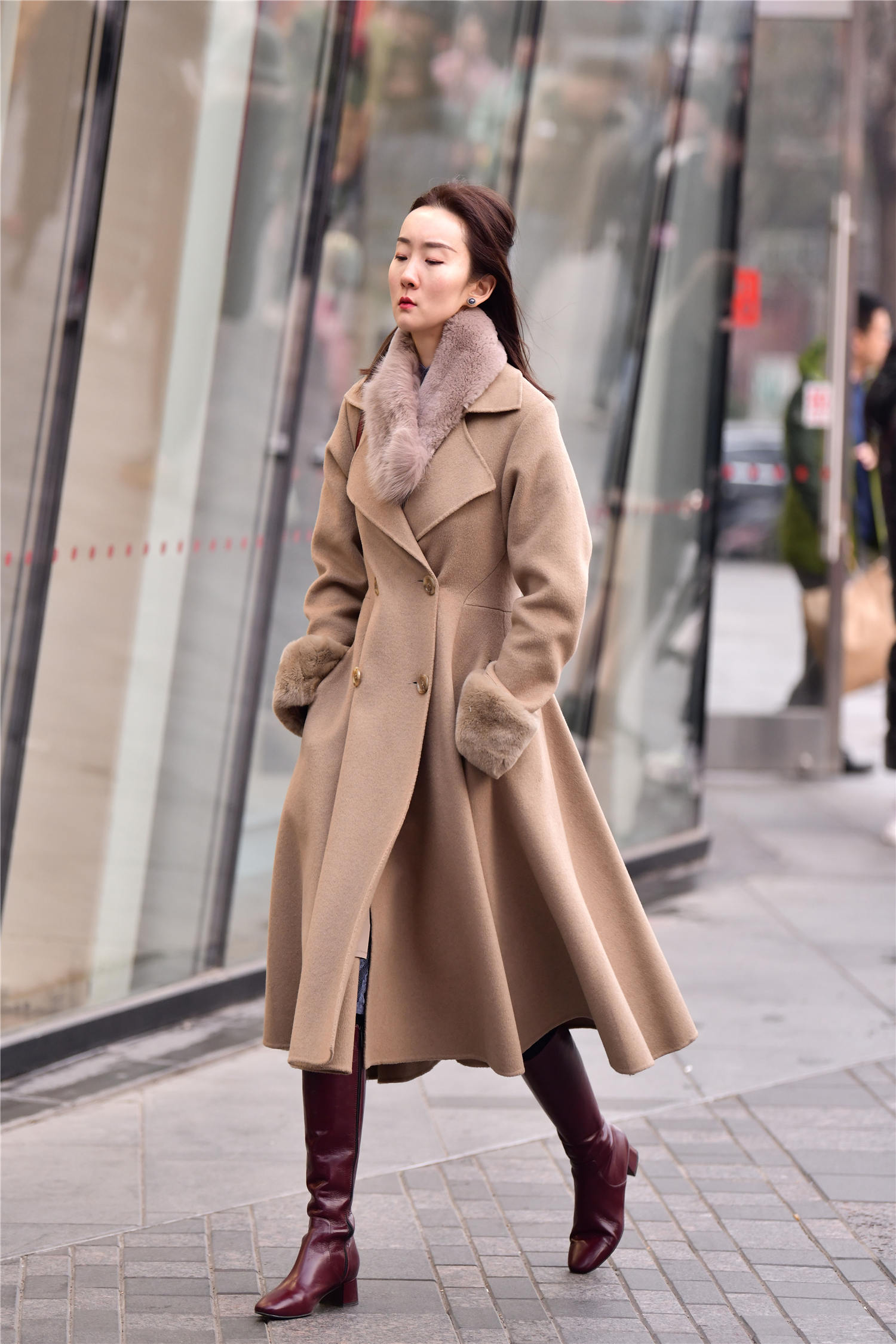 冬季里的大衣搭配,展现出自己的时尚味道,一款驼色大衣,双排扣设计,皮草的毛领,散开的衣摆,这样显得非常休闲,也穿出秀气的感觉,暗红色的长靴,非常秀气,也搭配出很精致的感觉,粗跟的设计,搭配出很美的效果,这位姑娘穿搭很简单,色彩也很好看,穿出自己的时尚味道。