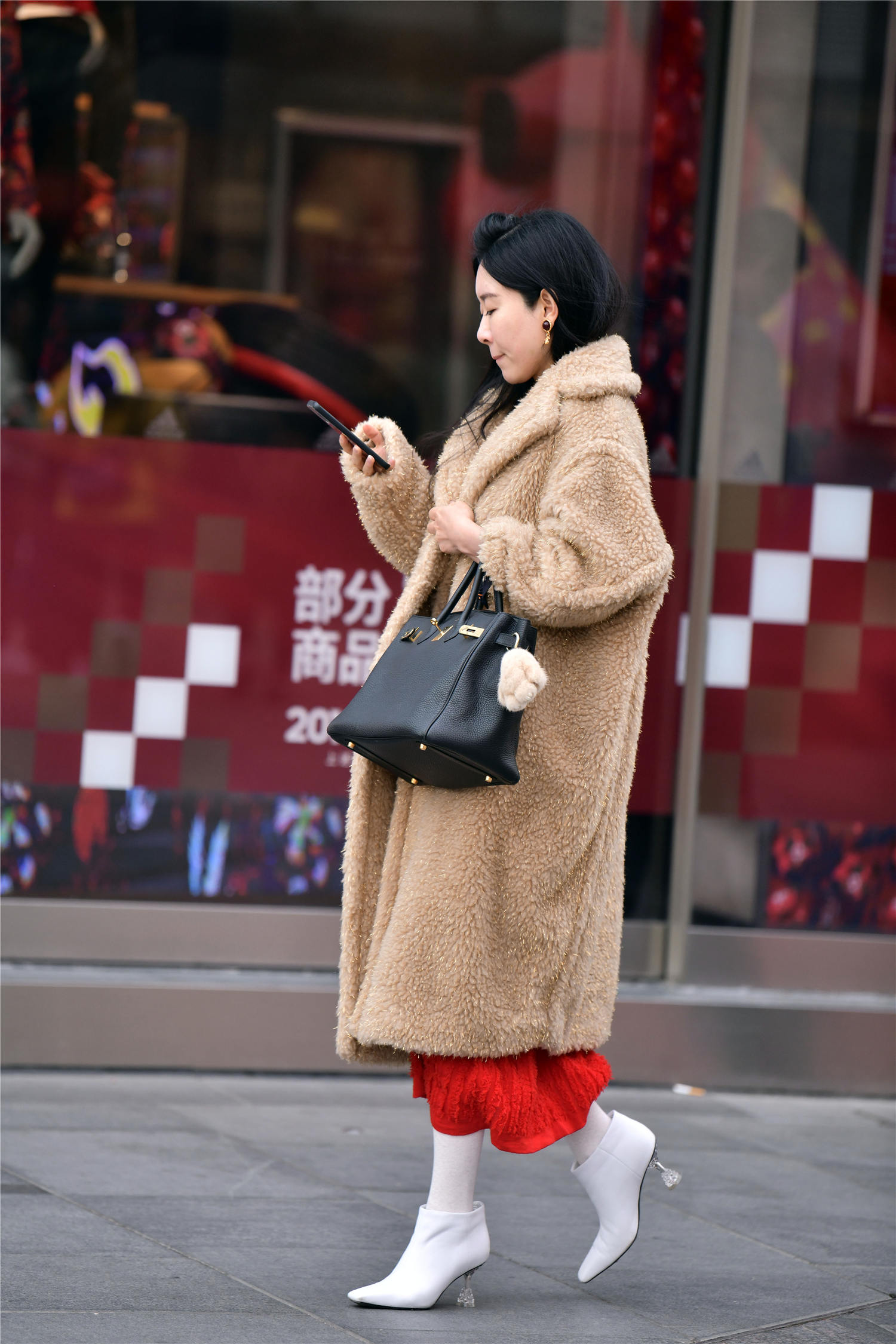 你的生活是什么样的,每年会为自己添加几款时尚的服装么?作为爱美的你,要选择不同款式的服装,这样会展现出不一样的时尚味道,这位们选择一款抓绒大衣,非常厚实,搭配出很保暖的效果,里面一款红色连衣裙,这样看出姑娘是非常喜欢的穿搭,脚下尖头细跟的踝靴,细跟下面钉子设计,非常好看,也显得非常简约的感觉。