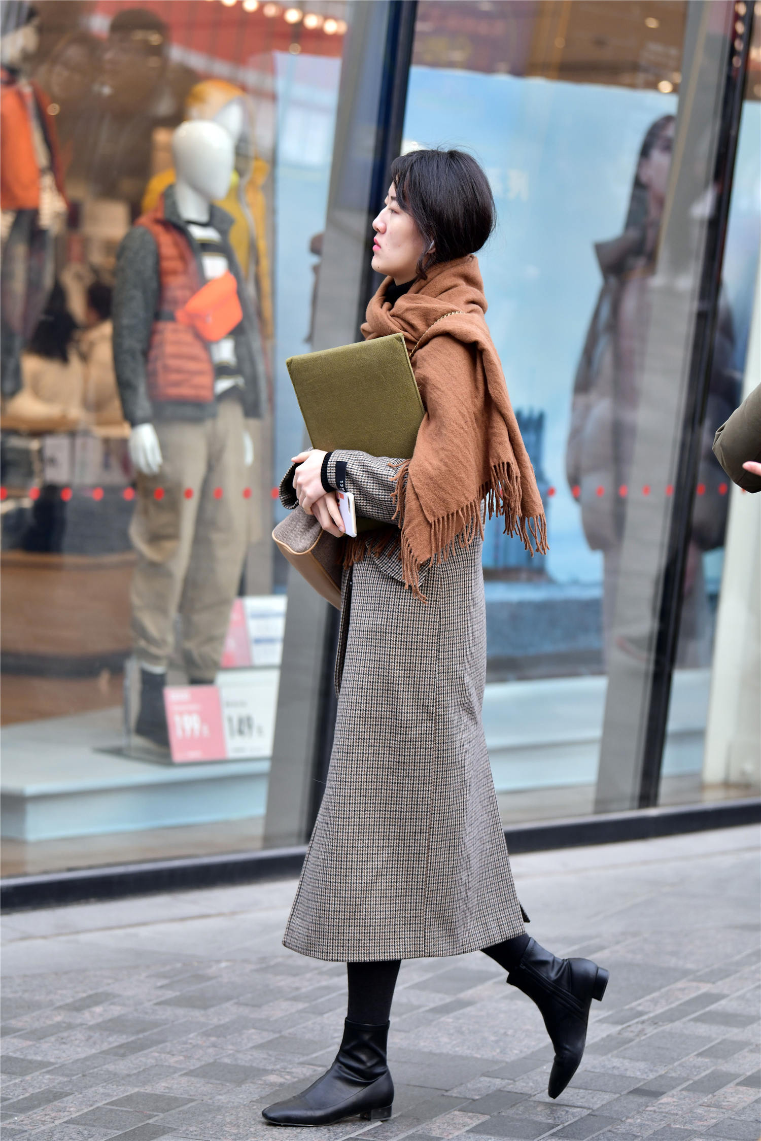 很多身材高挑匀称的姑娘,她们选择大衣,会搭配出很清瘦的效果,也搭配出显身材的效果,看一下这位美女的搭配,灰色格子长款大衣,非常简约的设计风格,非常显瘦,黑色打底袜,这样就更有显瘦的效果,黑色皮质短靴,和平底差不多,穿出很秀气的感觉,一款棕色围巾,保暖还搭配出很美的效果。