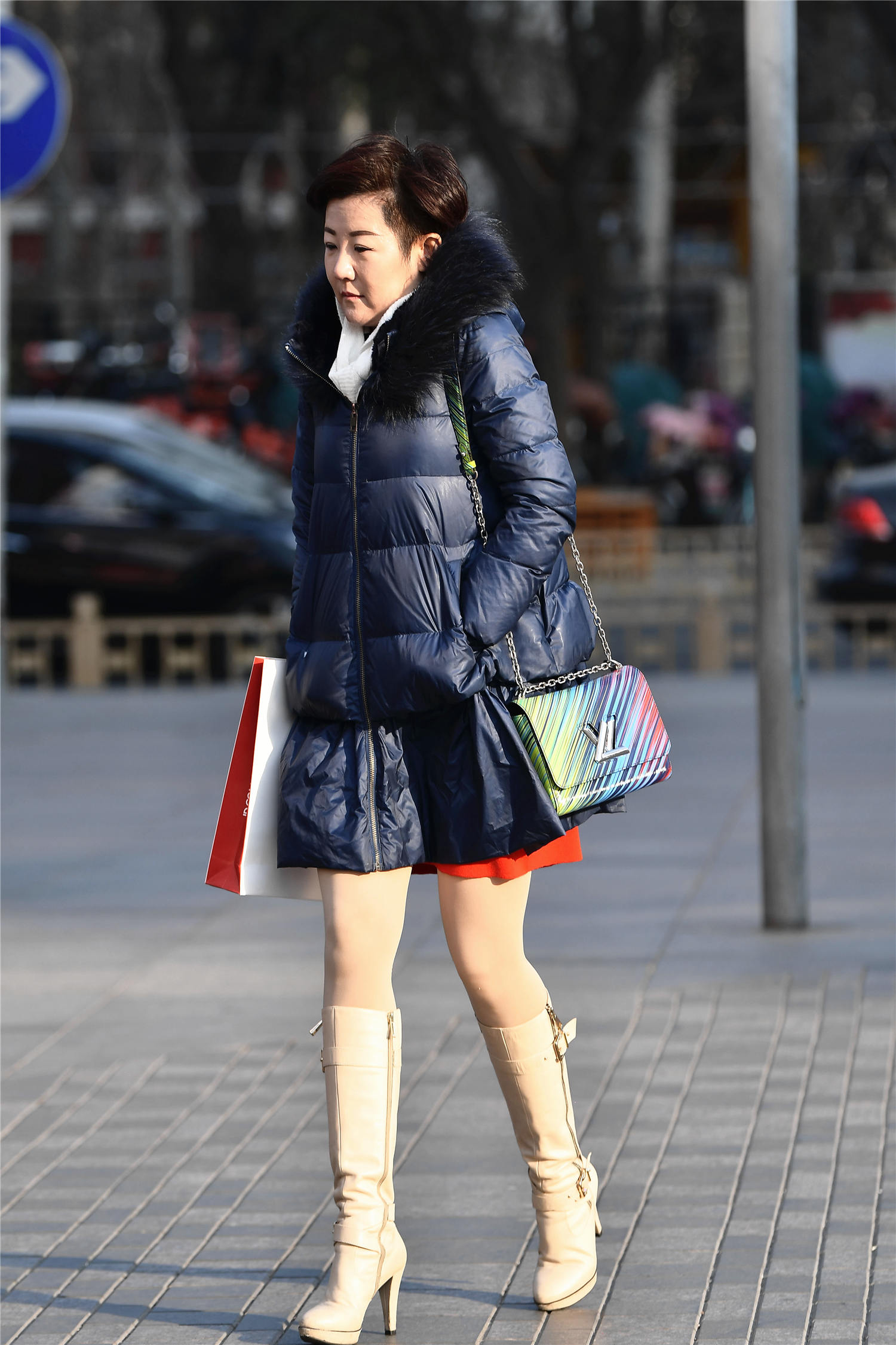 一款深蓝色的中短款羽绒服,有着一点冷色调的搭配,其实这样的色彩更适合男士,但是美女穿着,会非常好看,也搭配出很美的效果,略显宽松的设计,这样穿着会有着保暖,里面搭配红色连衣裙,只是比裙子长一点点,这样会非常漂亮,这位姑娘的羽绒服,有点连衣裙的效果,搭配出很精致的感觉。