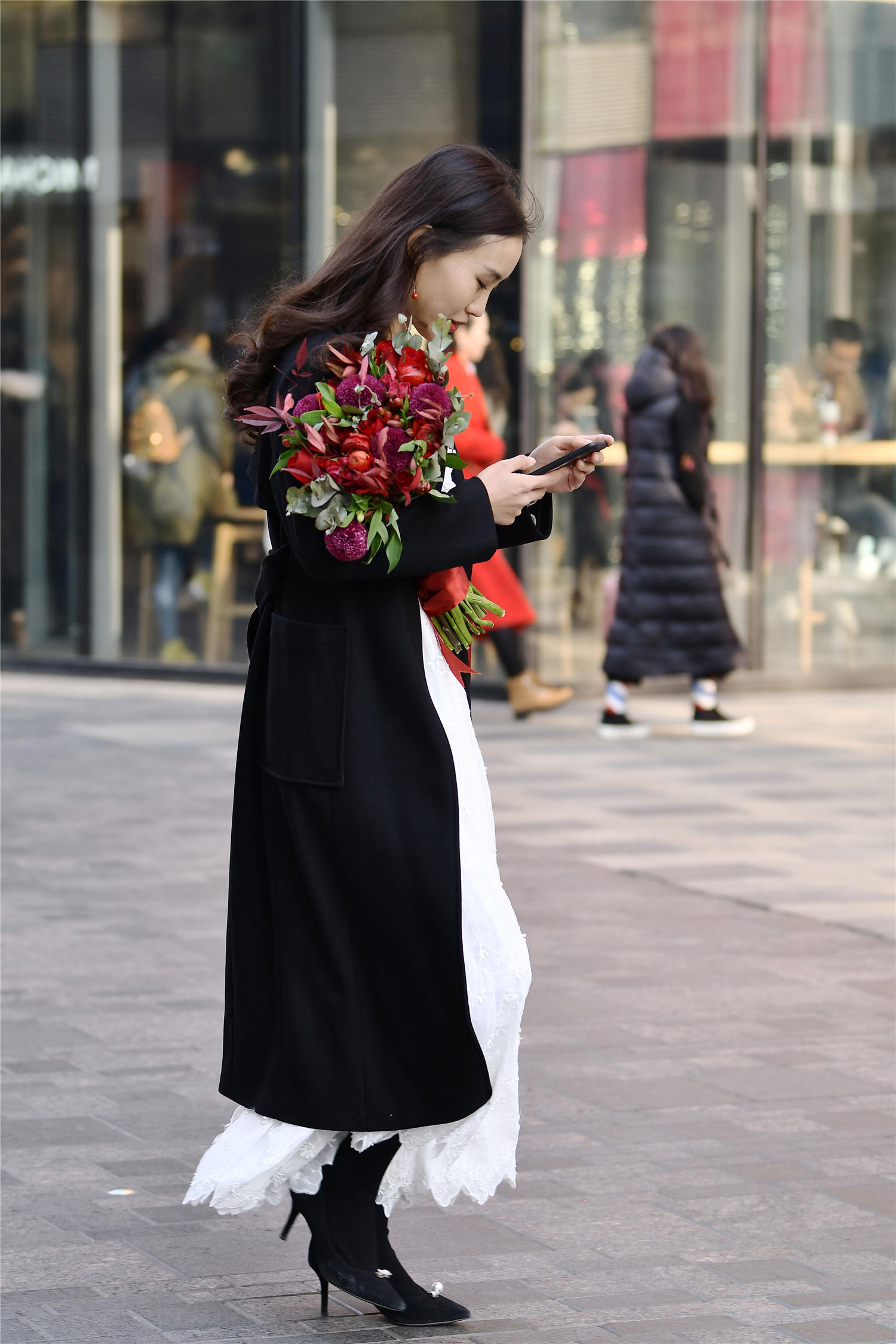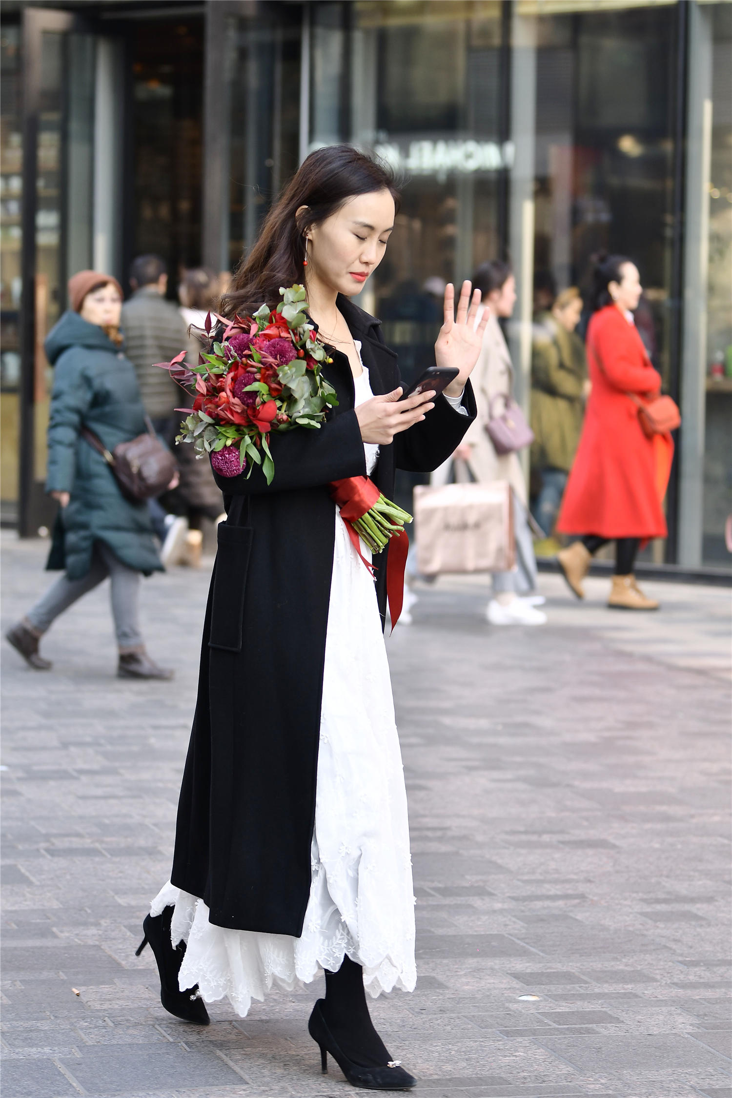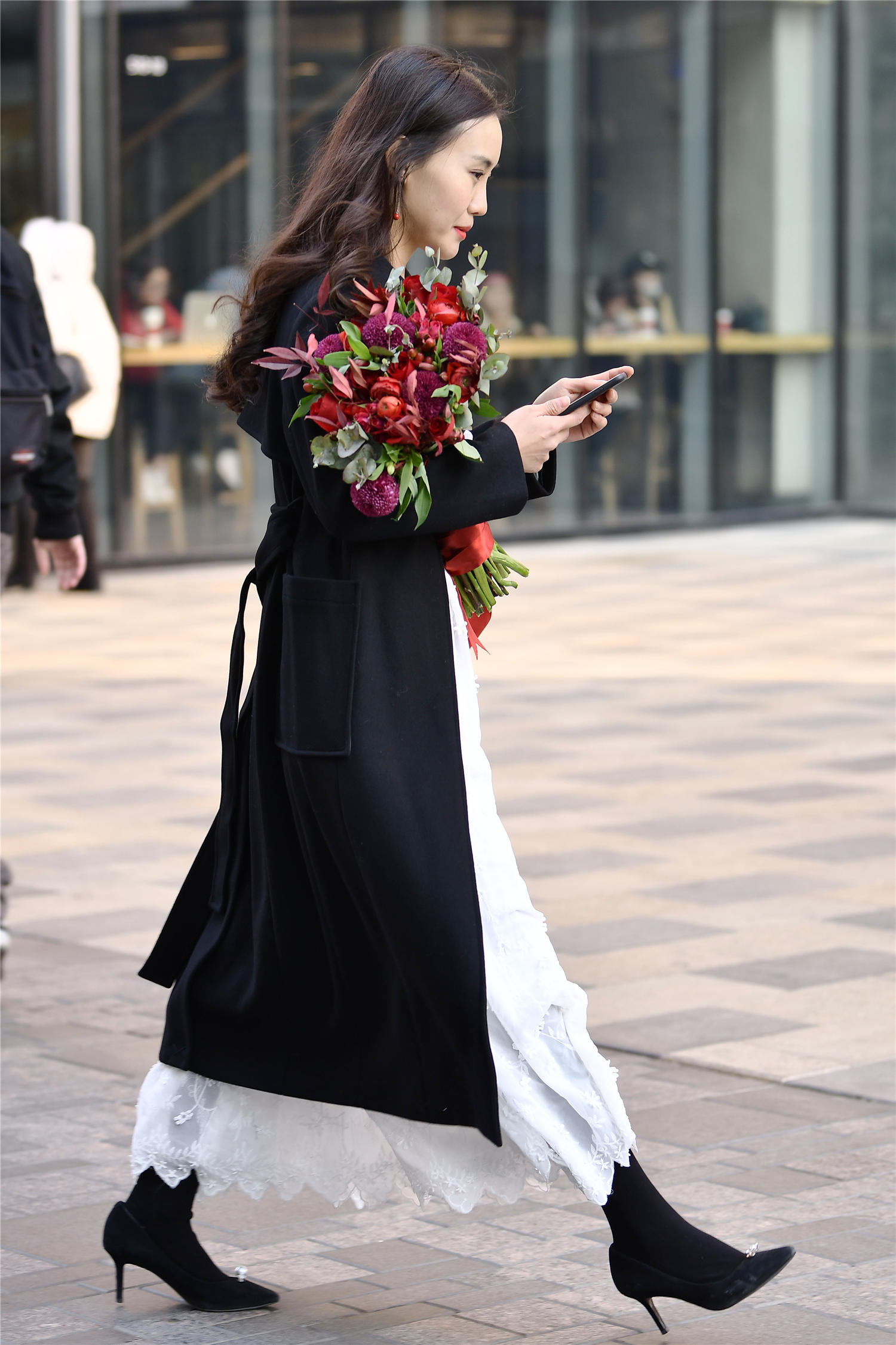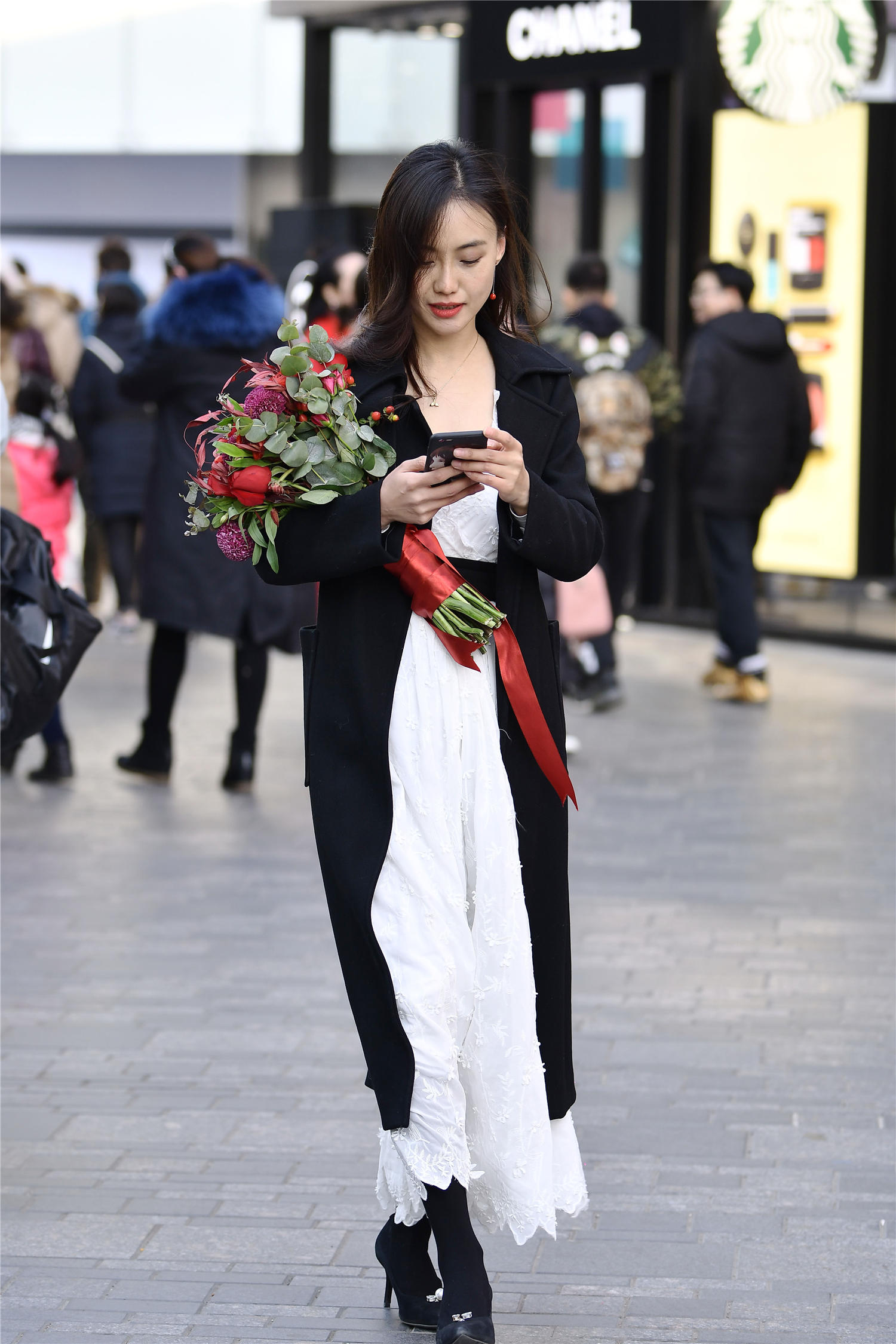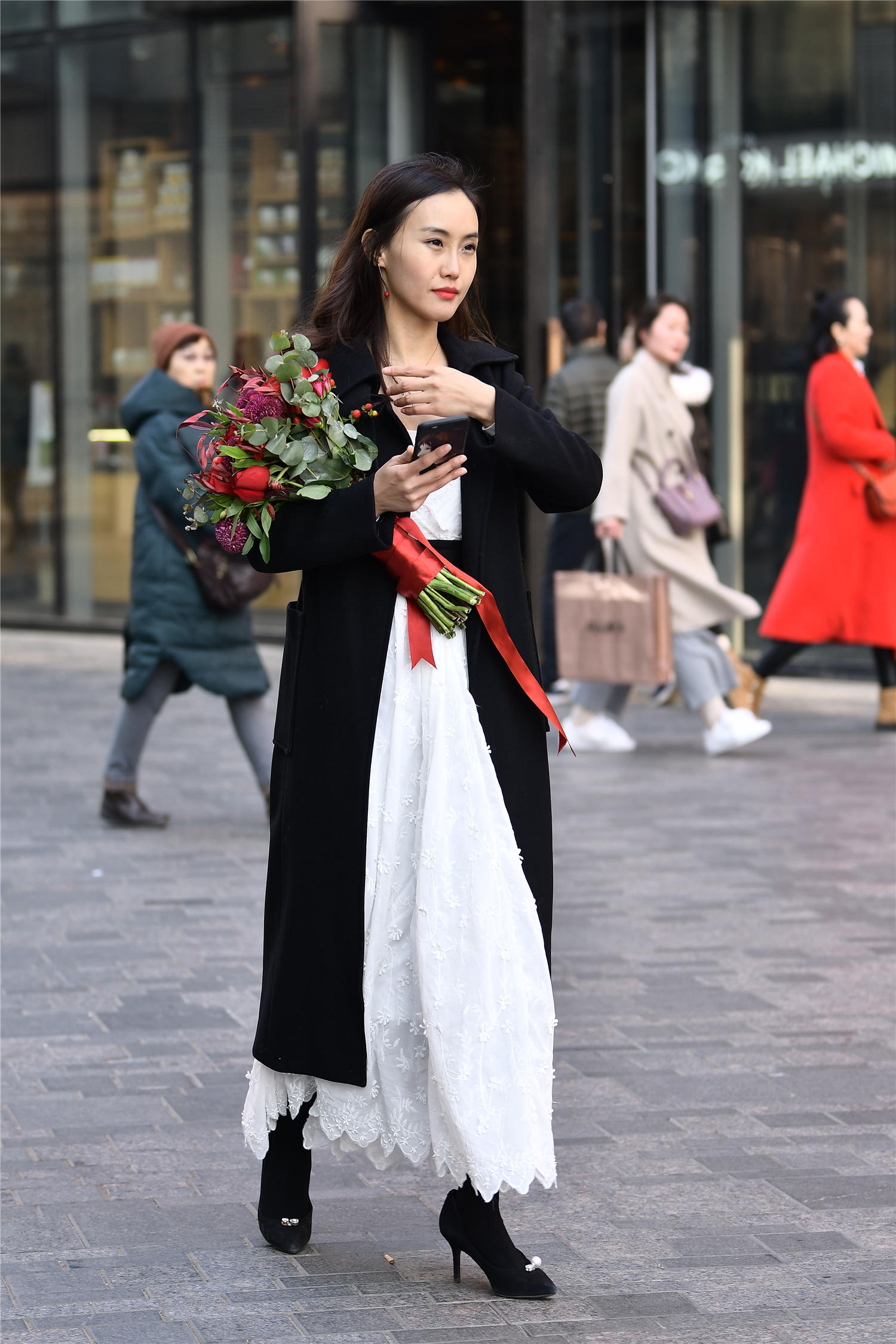 这位美女选择一款黑色大衣,长款的设计,简单很好看,没有把扣子系上,这样展现出自己的内搭,白色连衣长裙,非常有层次感,上面的贴花增加层次感,比大衣长一些,这样搭配出很美的时尚感觉,还有着一款黑色收腰,这样显得身材比例很好,搭配出很美的感觉,手里一束鲜花,是不是非常好看呢?