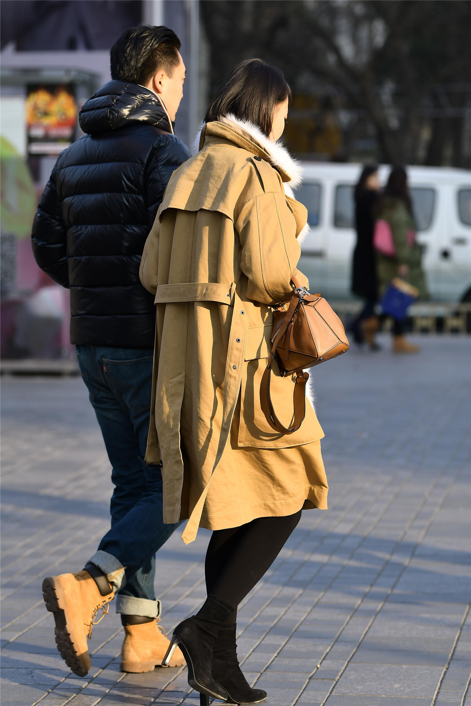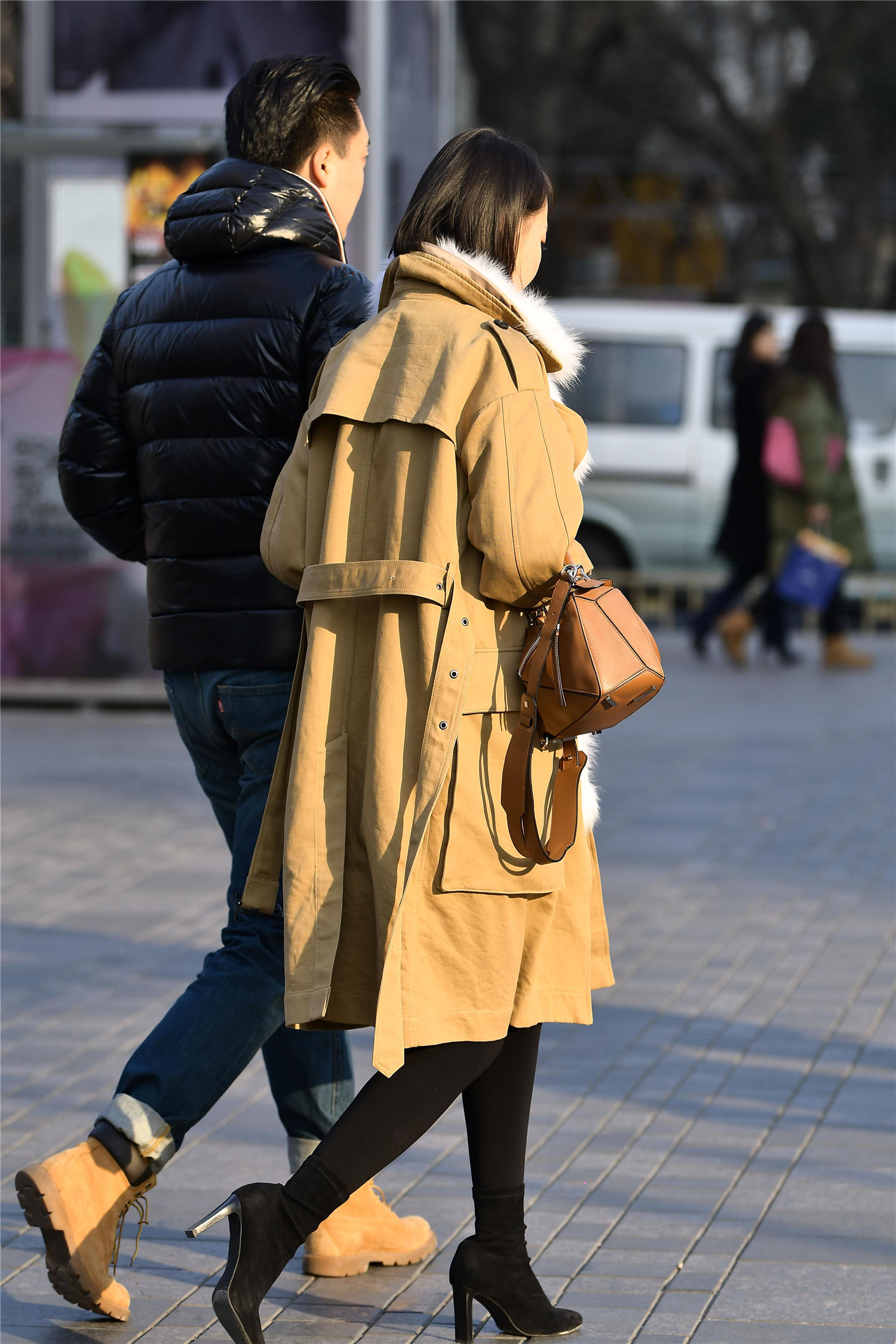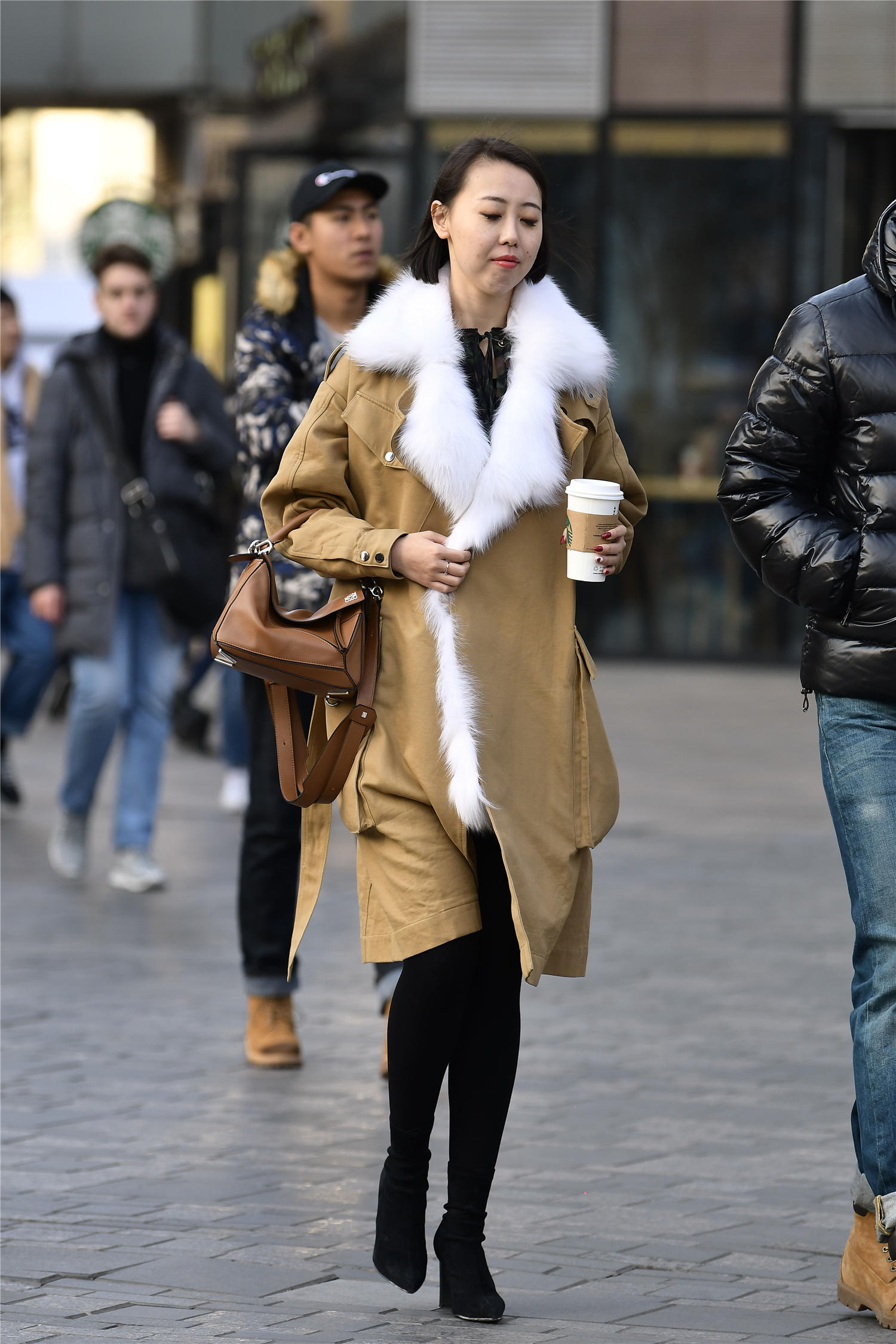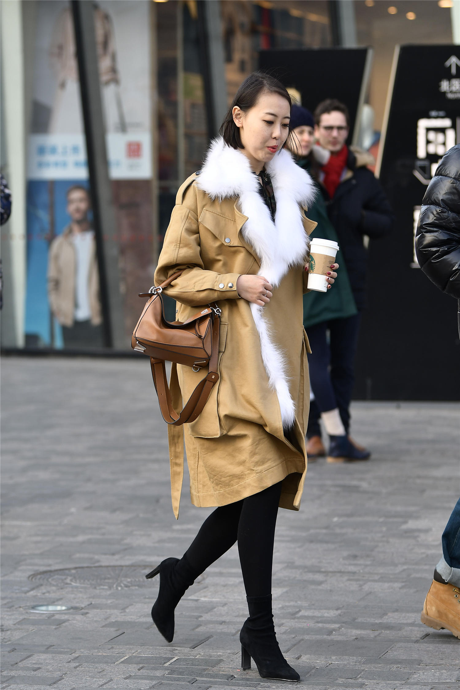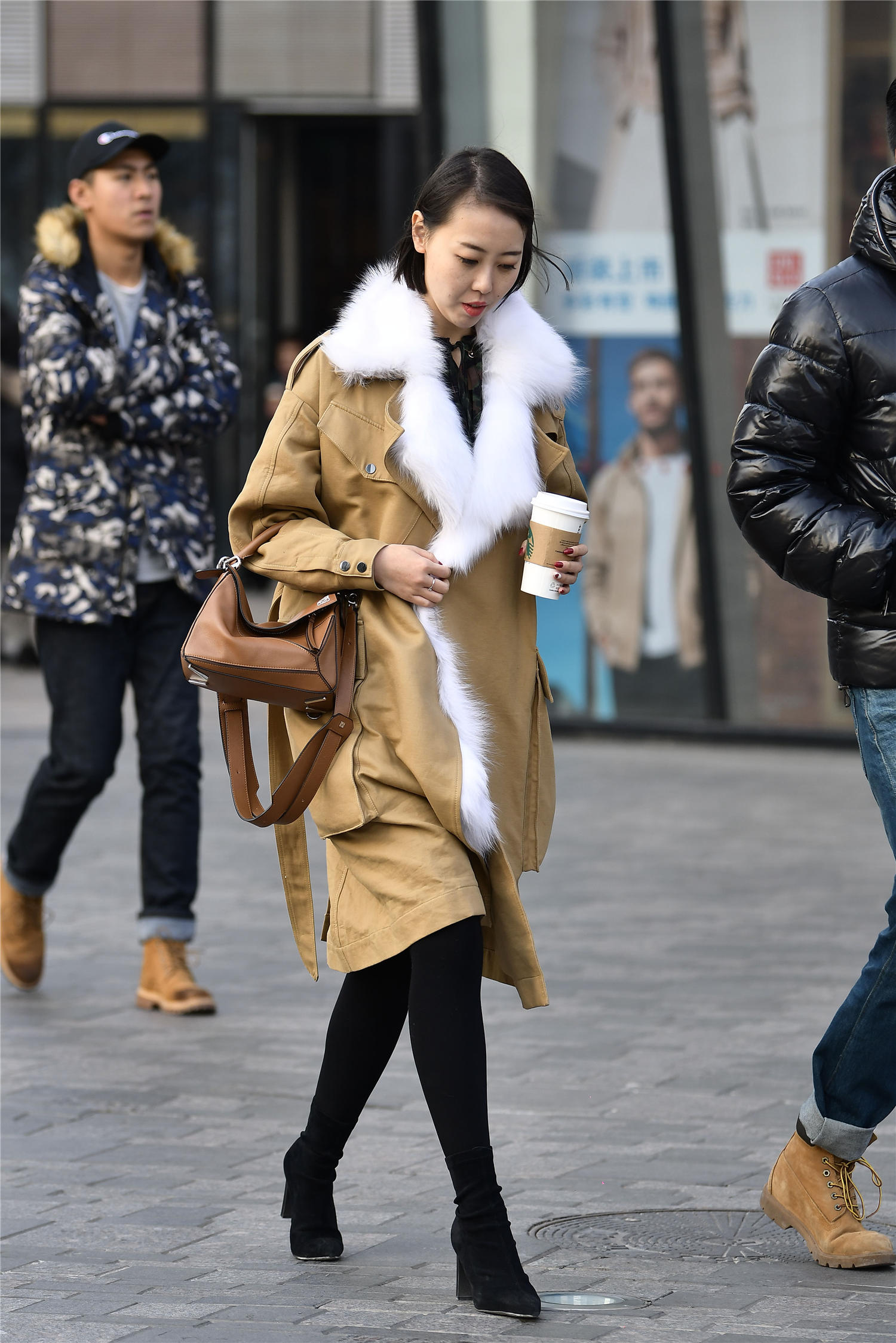 卡其色大衣,白色皮草衬里,穿着高跟短靴提升气质