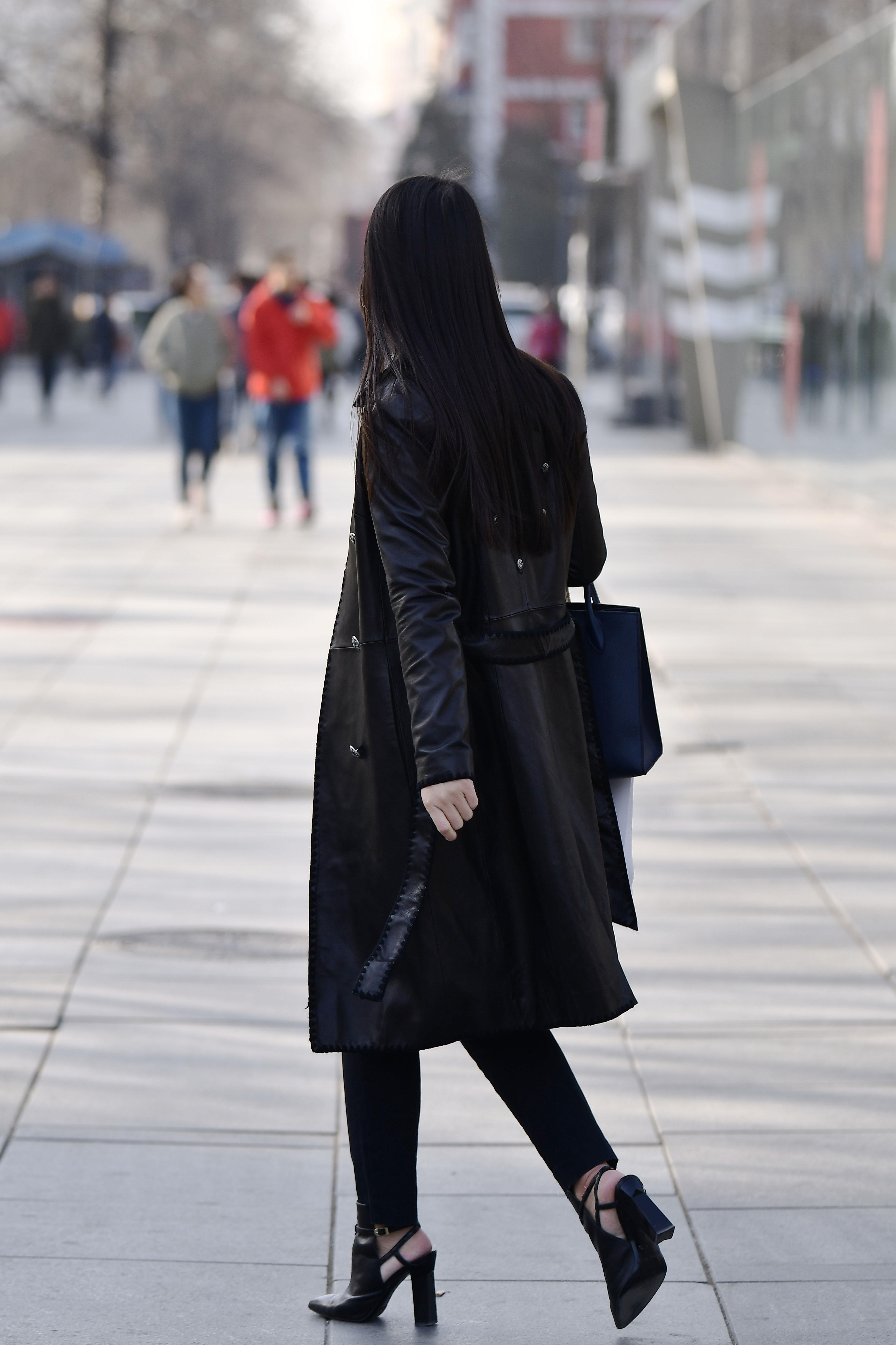 冬天也会有很多不怕冷的姑娘出门,她们会穿出自己的时尚感觉,看一下这位美女穿着一款黑色大衣,敞开怀,非常好看,过膝的长度,搭配出很美的感觉,黑色紧身裤,到脚踝的位置,搭配出显身材的效果,脚下穿着一双黑色粗跟尖头短靴,凉鞋的设计,后面露出脚跟,这样的穿搭,在冬天是不是会很冷呢,也搭配出自己的时尚味道。