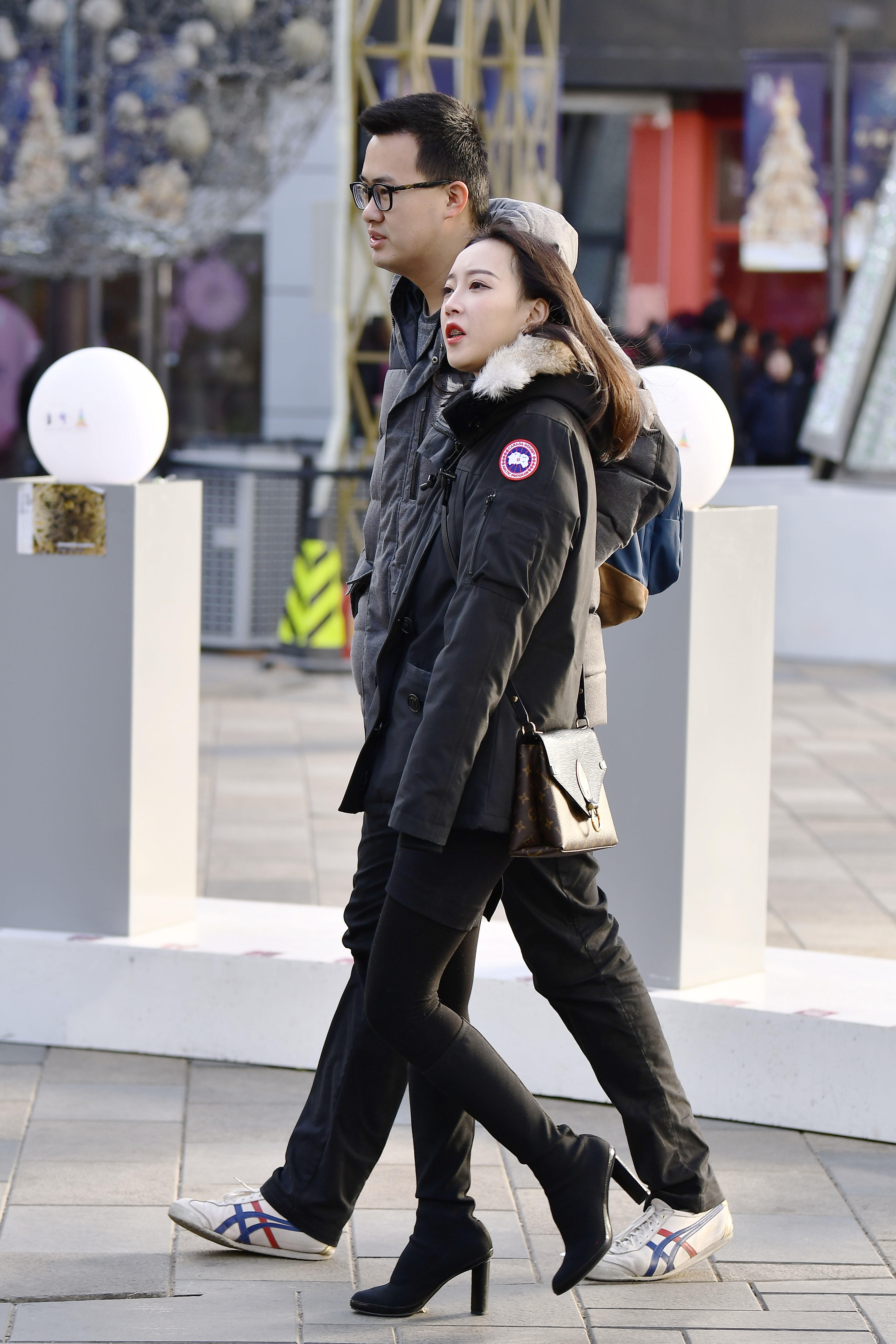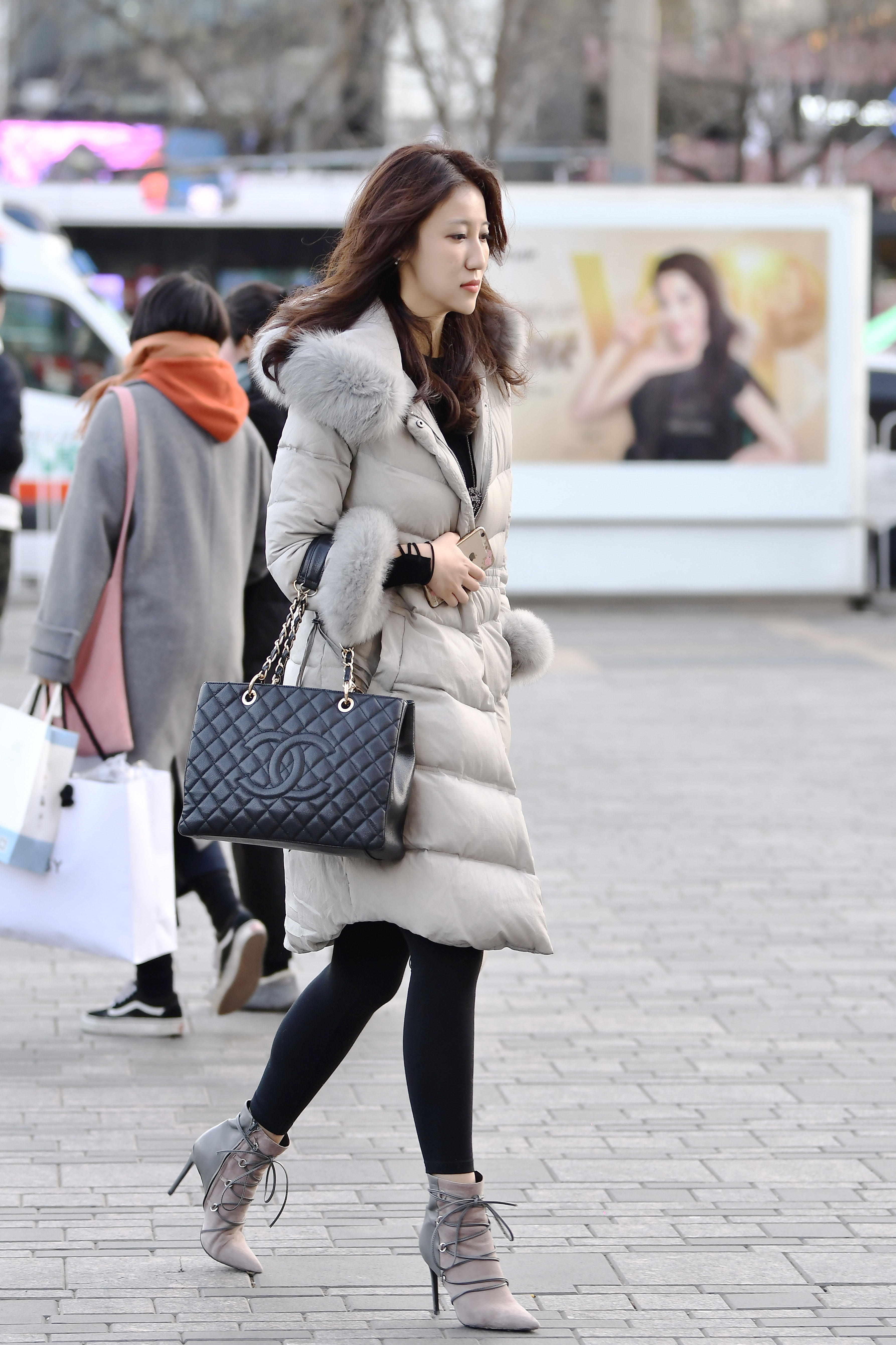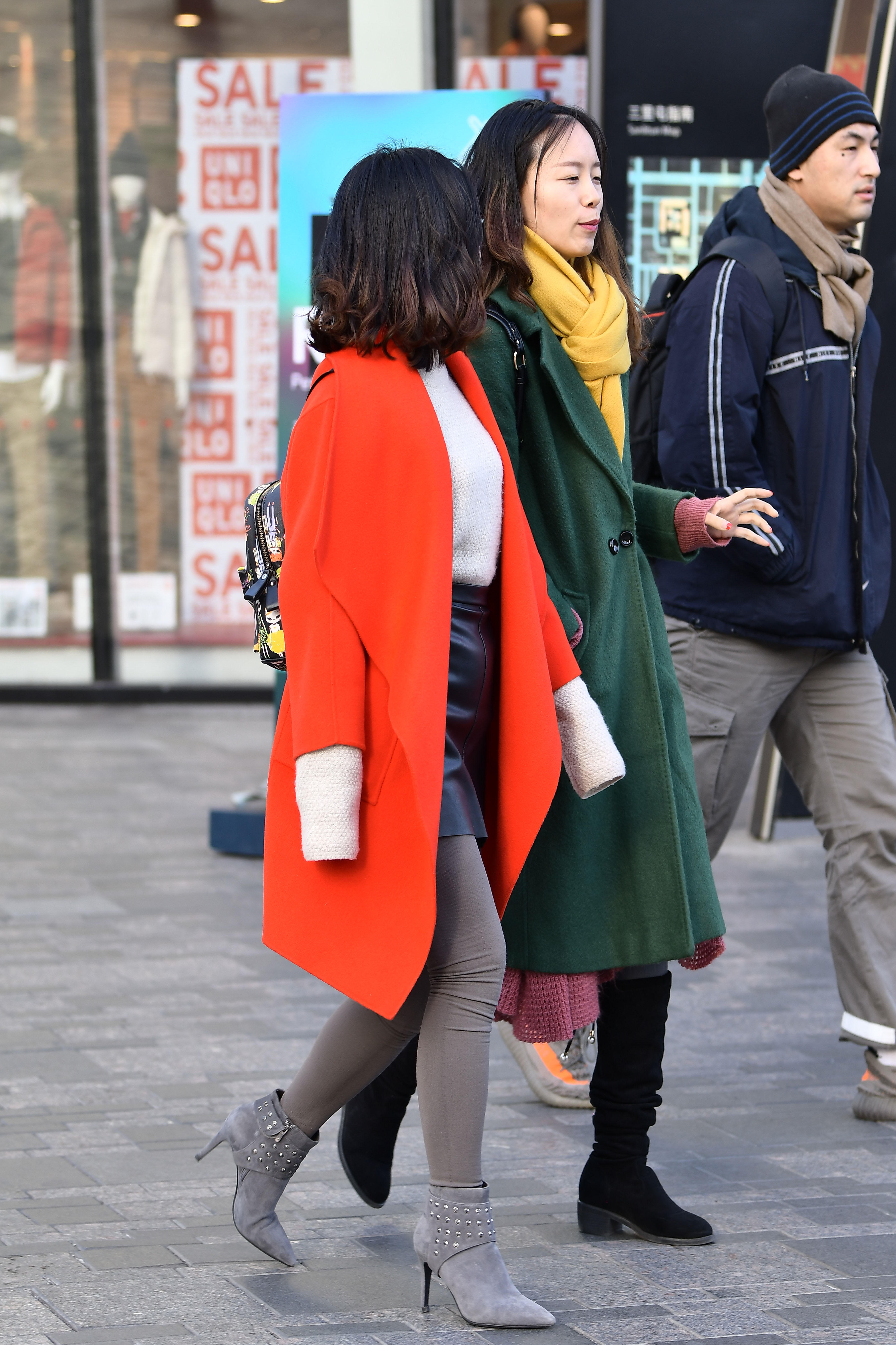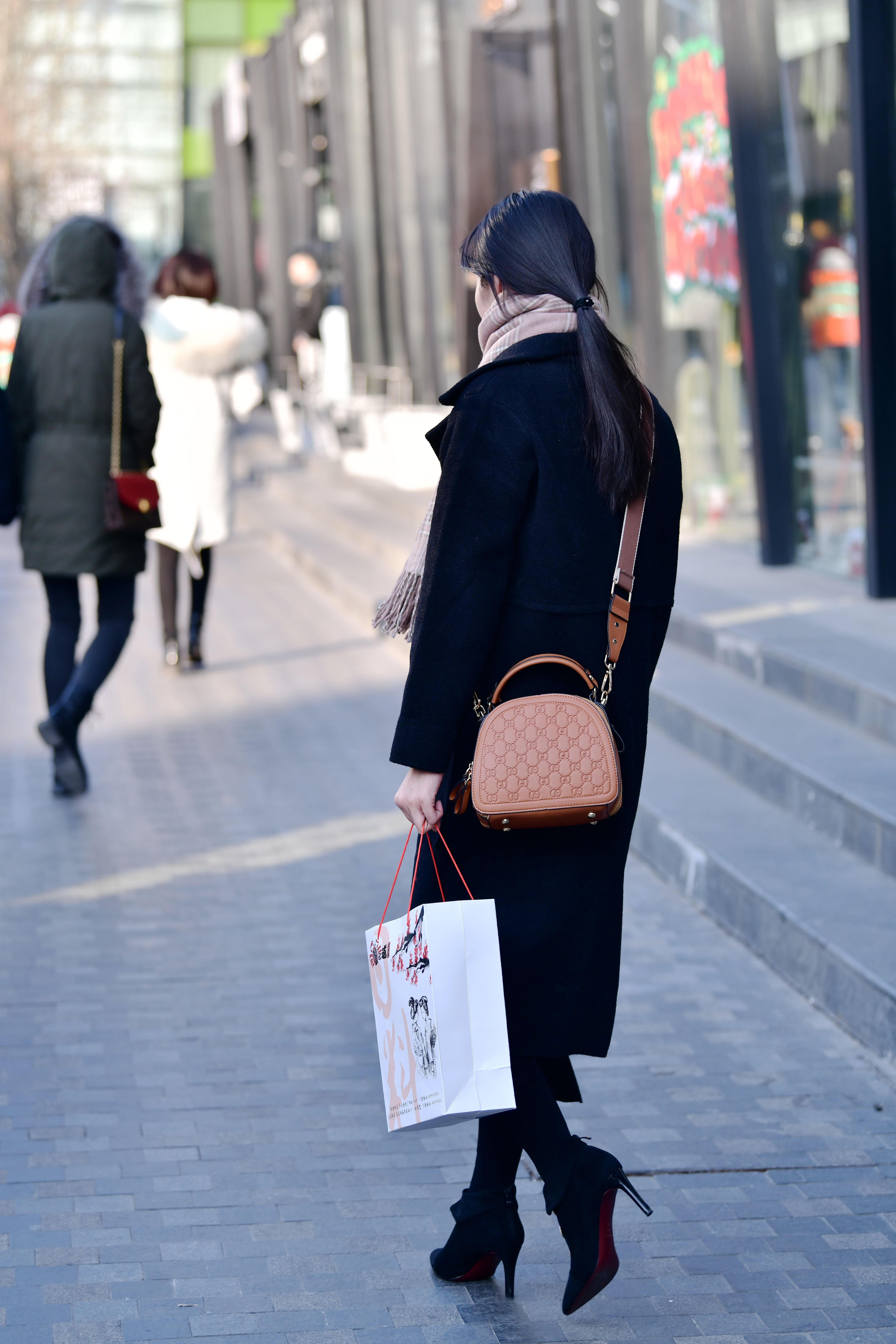 冬天也会有很多姑娘出来逛街,她们知道该如何搭配自己,知道怎么穿出自己的时尚感觉,这位美女选择一款深灰色的袜靴,靴筒非常高,这样穿出显身材效果,5厘米的细跟,非常好看,也显得非常秀气,一款黑色中短款大衣,穿出很美的效果,姑娘一头扣发,更好衬托出她气质感觉,身材不是很高挑,却搭配出很美的感觉。