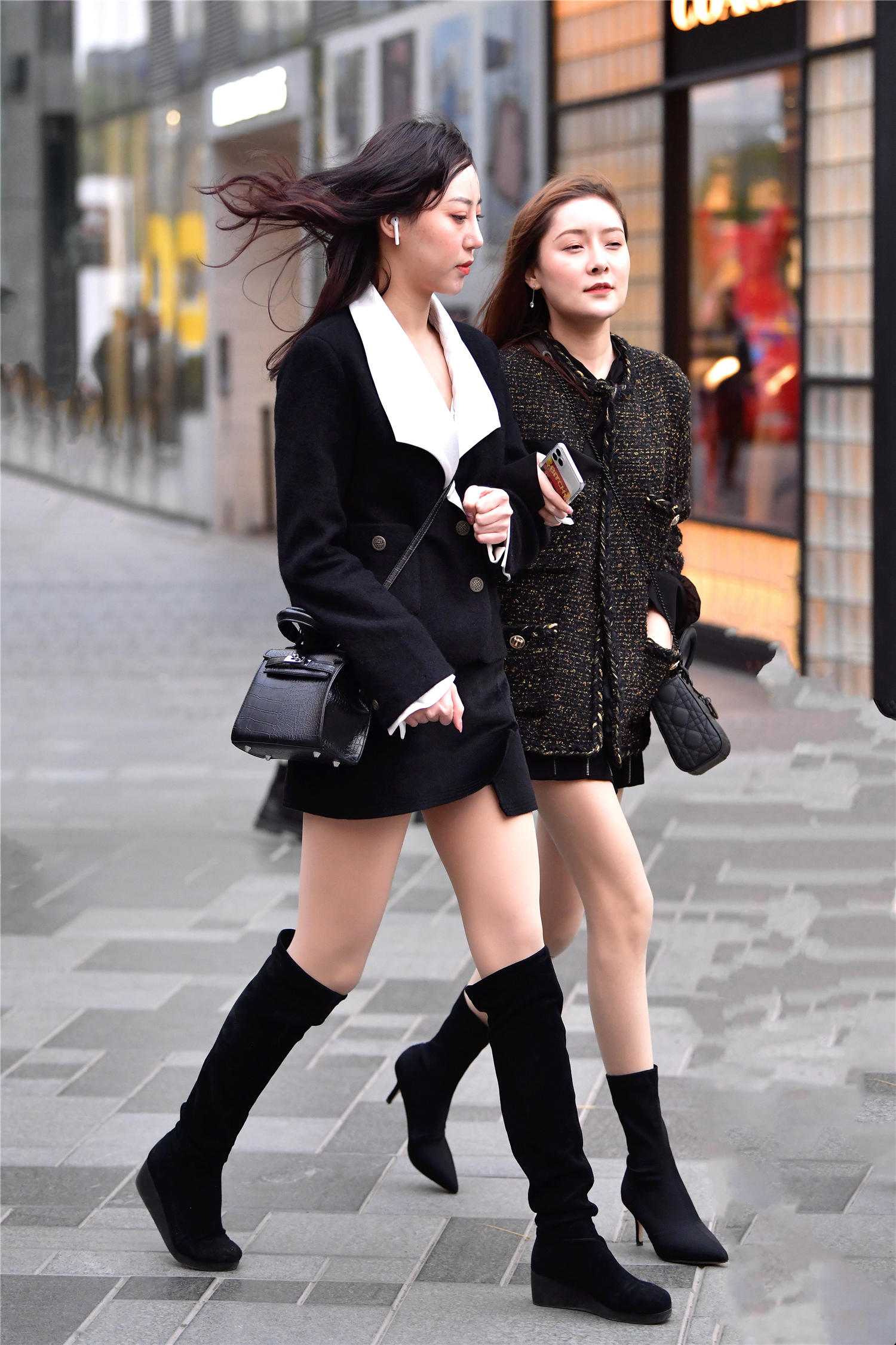 她的姐妹是一款黑色坡跟长靴,虽然不是过膝的,冬天穿着也有着非常保暖的感觉,黑色休闲西装,白色的领口,这样有了色彩的对比,会显得人很精致,错襟的筒裙,和小西装组成套装,有着一点职业装的效果,搭配肉色丝袜,这样会穿出修身的效果,也展示出不怕冷的感觉,看着这一对闺蜜的搭配,真的是非常好看,似乎这个冬天也不是很冷。