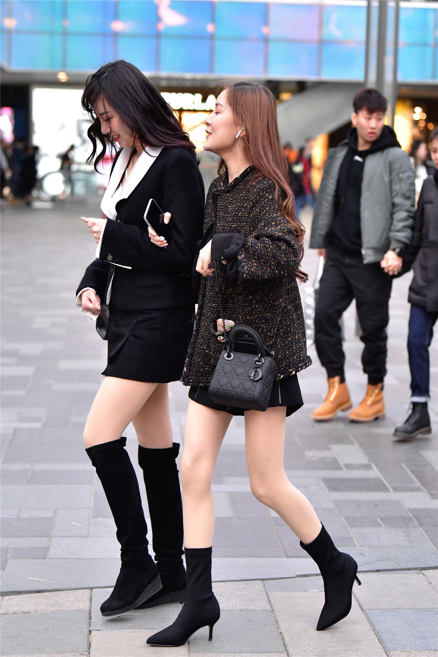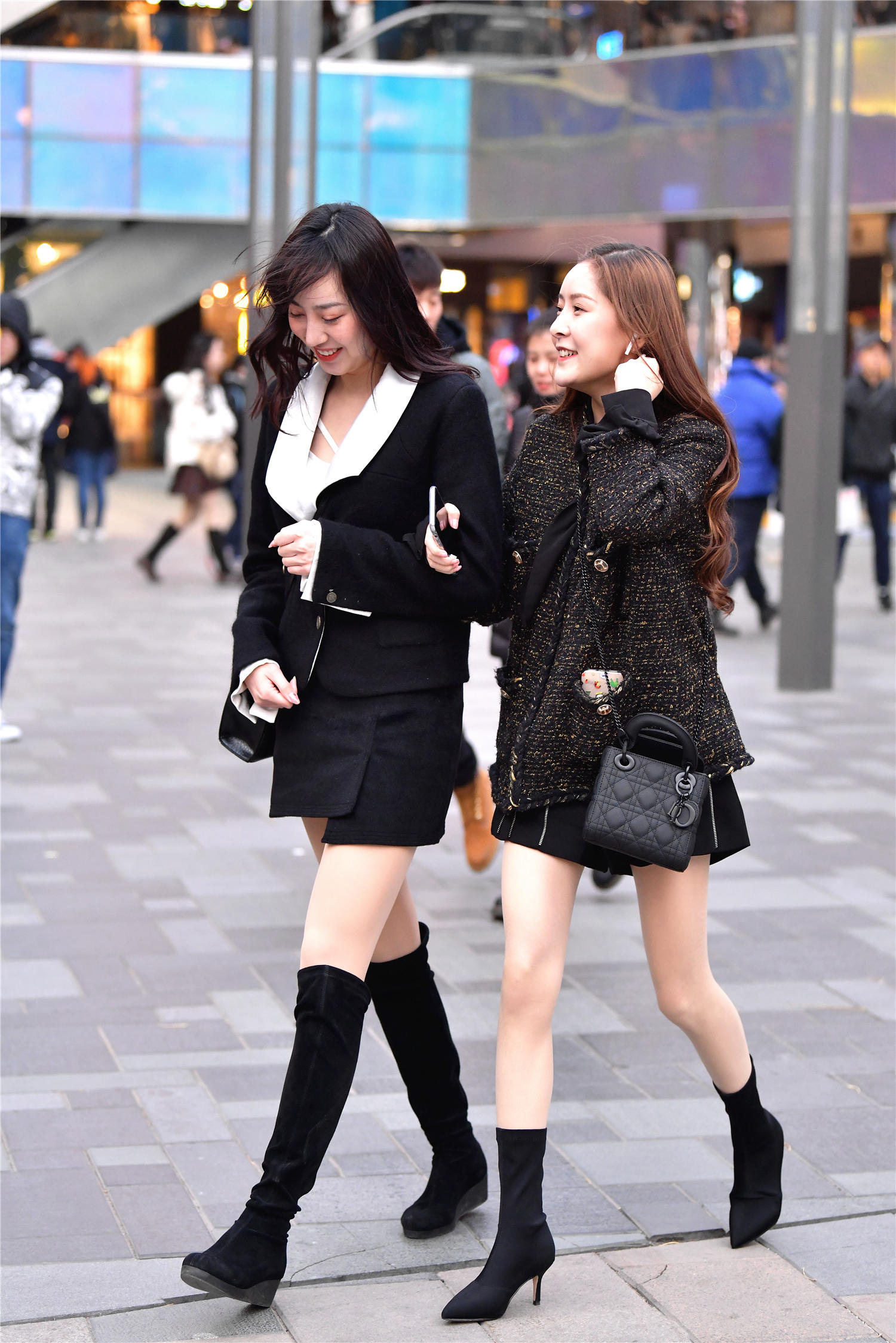 看一下这一对闺蜜,在冬天穿出不怕冷的效果,一位穿着一双黑色尖头细跟袜靴,黑色款式,修身的靴筒不是很高,搭配黑色拉链A裙,粗呢针织的外套,黑色与金色组合在一起,非常贵气的搭配效果,穿出很美的时尚味道,露出自己的大腿,这样在冬天出来,是不是感觉人家确实抗冻,真的是不怕冷。