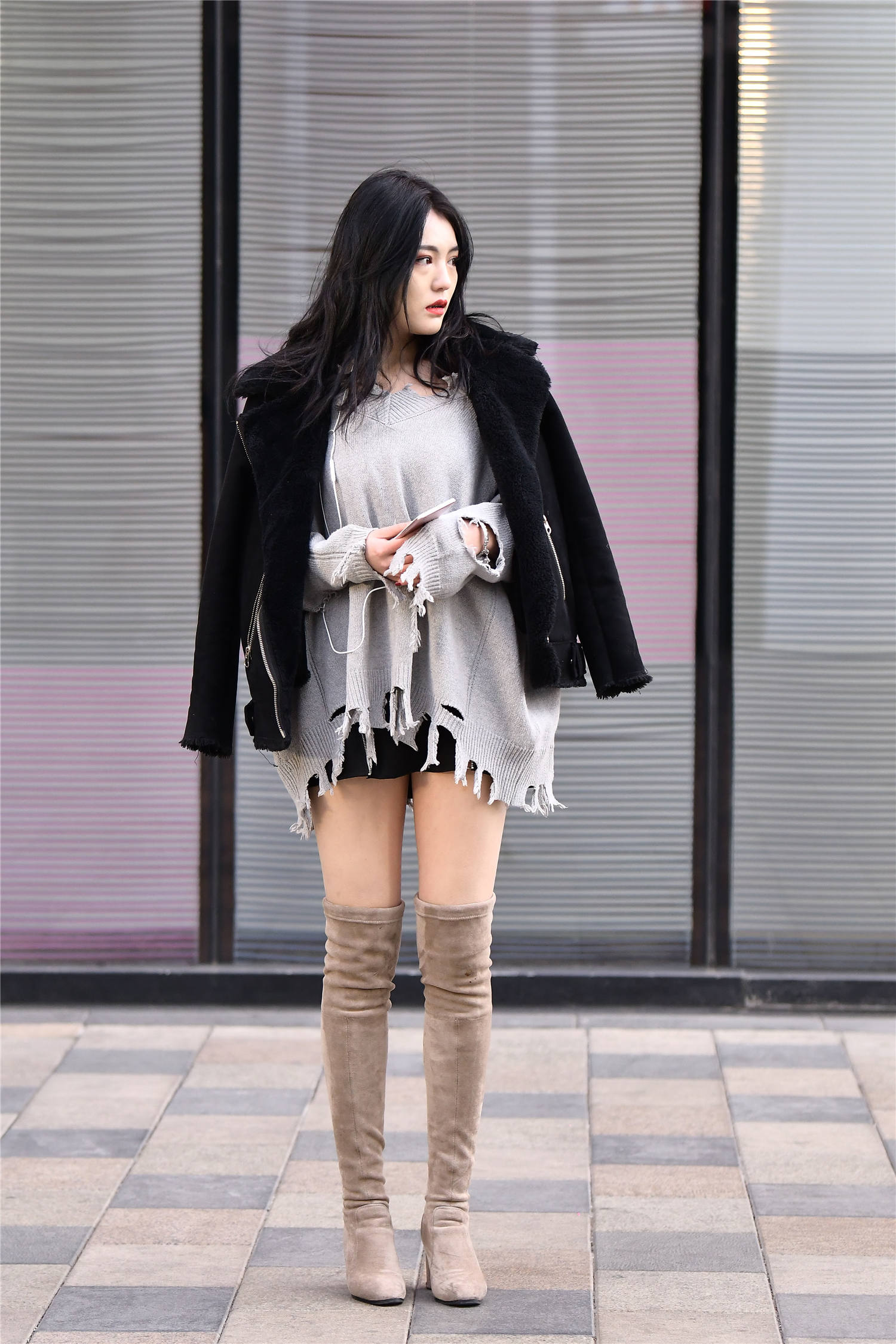 上身穿着一款黑色夹克,拉链的设计,增加层次感,美女拍到开心的时候,把这款外套脱下来,就是为了拍出好看的照片,黑色的针织衫,下面的破洞和流苏处理,有点乞丐服的效果,这样会让搭配更加个性一些,而且很宽松的效果,遮住短裤,这位小姐姐也是很会搭配的,穿出自己的风格。