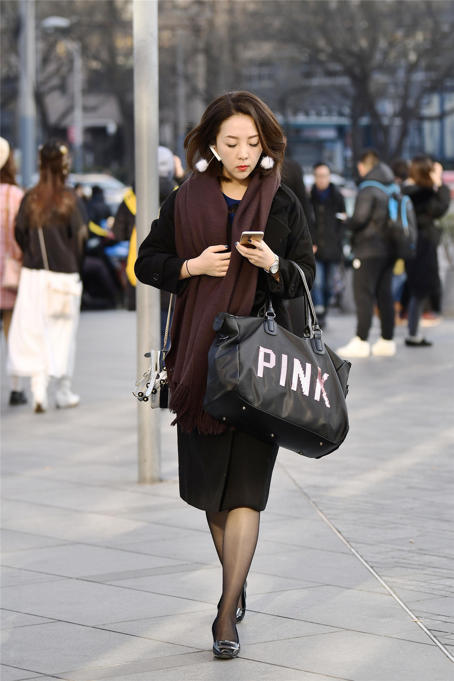 到了冬天,依旧有很多姑娘想要搭配出自己的时尚味道,展现出自己的精致感觉,所以选择黑色丝袜,起到修身效果,还有着一些保暖作用,很多时尚姑娘不会在户外待很长时间,所以这样搭配也不会太冷,看一下这位美女,黑色长款的大衣,过膝的长度,搭配变得更加简单,褐色的围巾,黑色丝袜,搭配一双黑色漆皮高跟鞋,显出她的精致搭配,也衬托出气质。
